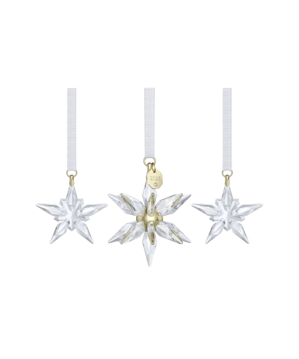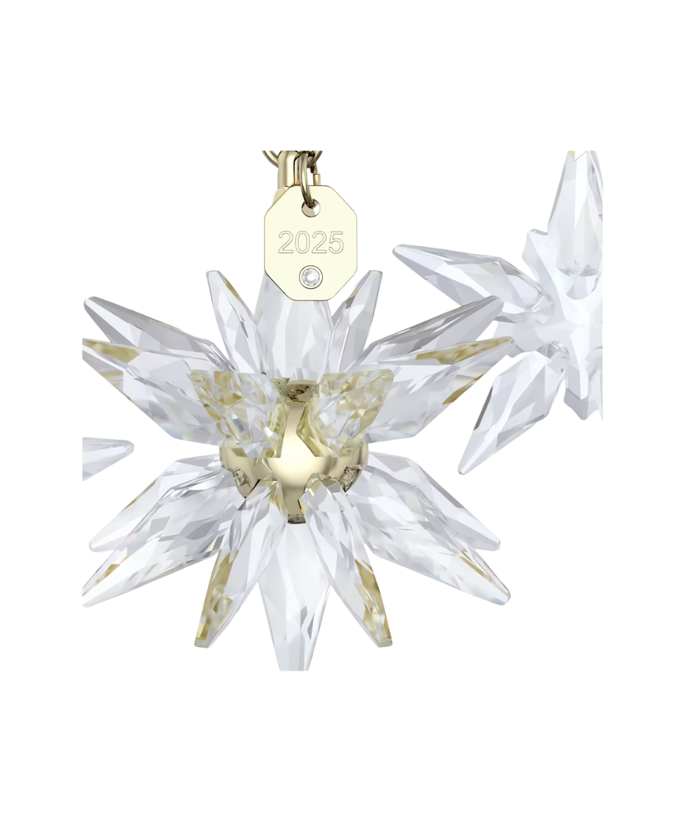 This Annual Edition 3D Ornament Set will bring light-filled magic to any festive décor. The glowing trio for 2025 is inspired by the serenity of the night sky and features an Annual Edition 3D Ornament and two Little Star ornaments. In total, the set is crafted with 773 precision-cut facets, with each piece suspended from a white grosgrain ribbon with champagne gold-tone plated accents including an engraved ‘2025’ tag on the large 3D star. A wonderful compilation of decorations to illuminate your tree or make a radiant centerpiece for your holiday celebrations. Decoration object. Not a toy. Not suitable for children under 15.