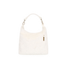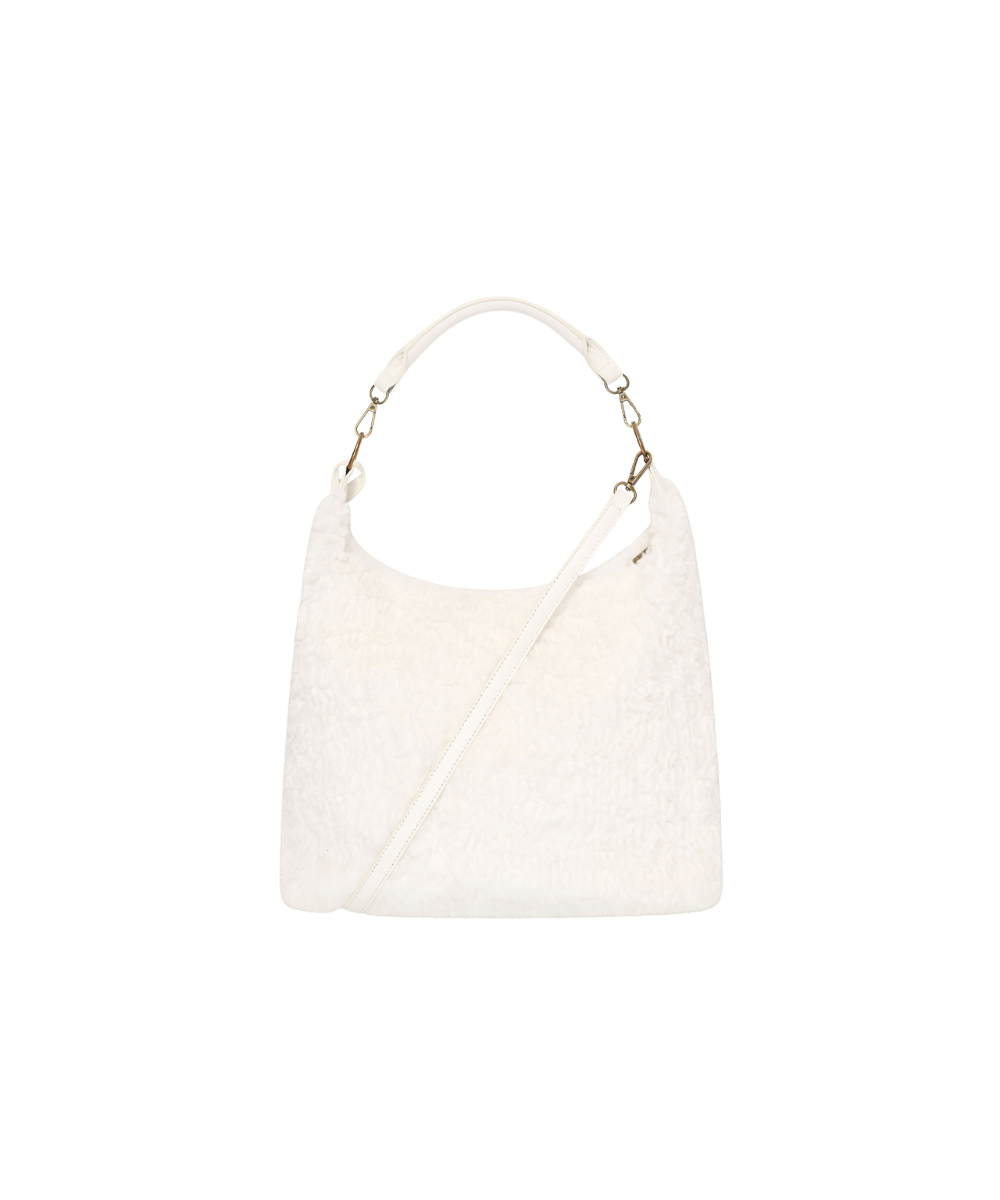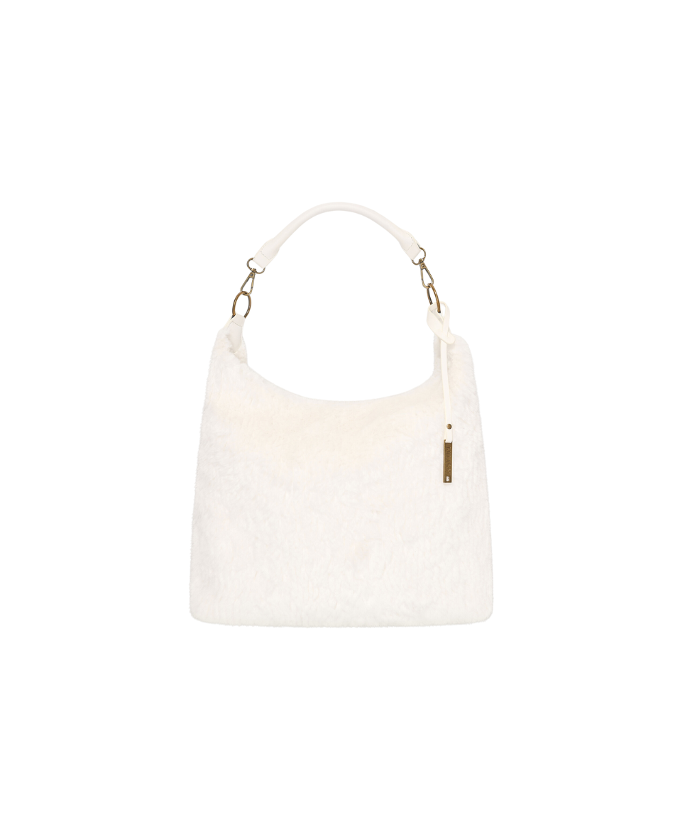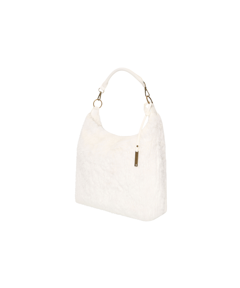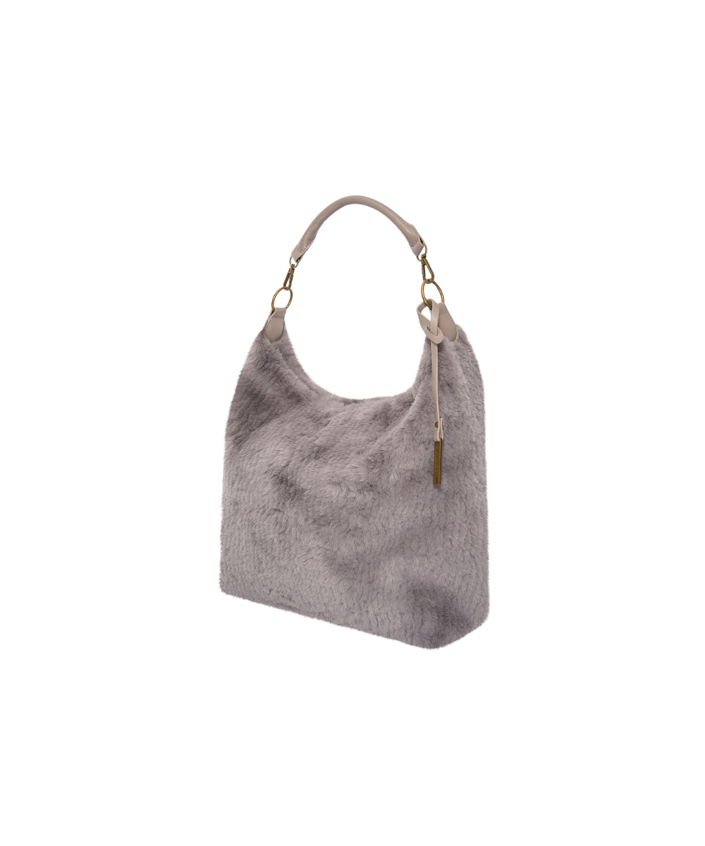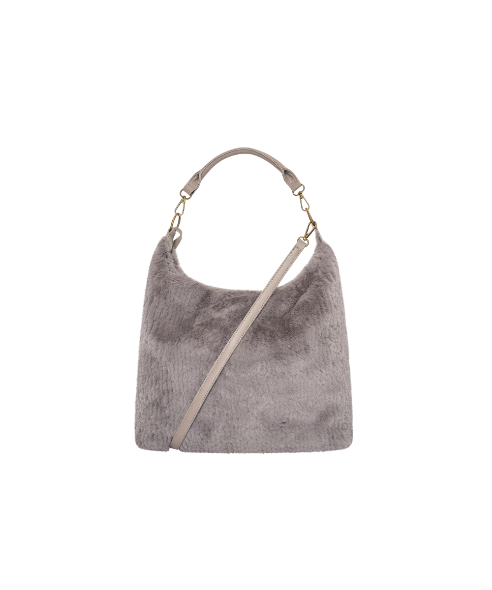 This elegant light grey faux fur hobo blends style and practicality in a compact design. Its short, fixed shoulder strap offers comfortable wear, while an additional adjustable and detachable long strap provides versatile carrying options. Featuring two compartments, including a zippered section, it securely holds your essentials. With dimensions of 33 cm wide by 10 cm high, this bag offers refined functionality for everyday use.