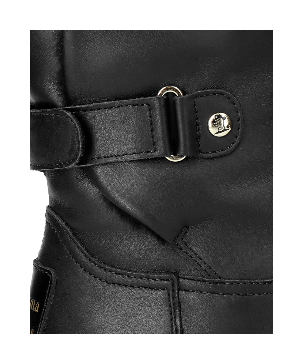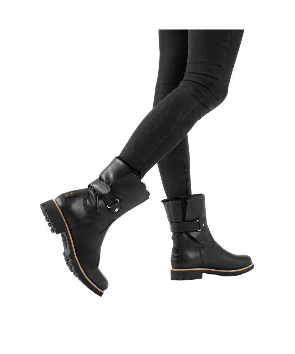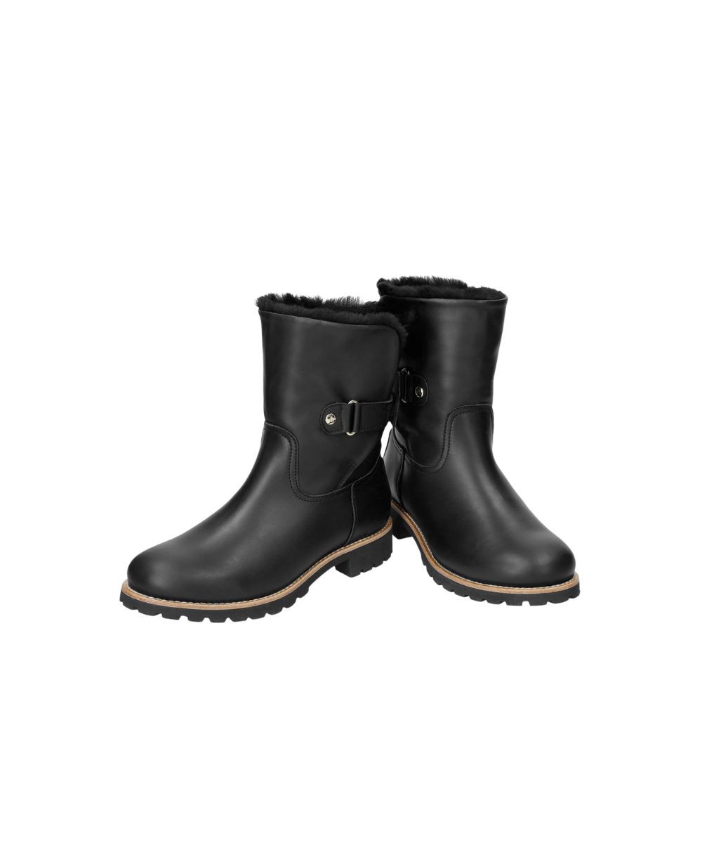 Flat women's Boot. WATERPROOF Black Napa Leather. Velcro Closure. Sheepskin lining. Removable anatomical insole. Natural, flexible and durable rubber sole. Shaft height: 19 cm. Heel height: 4 cm. 100% Made in Spain.