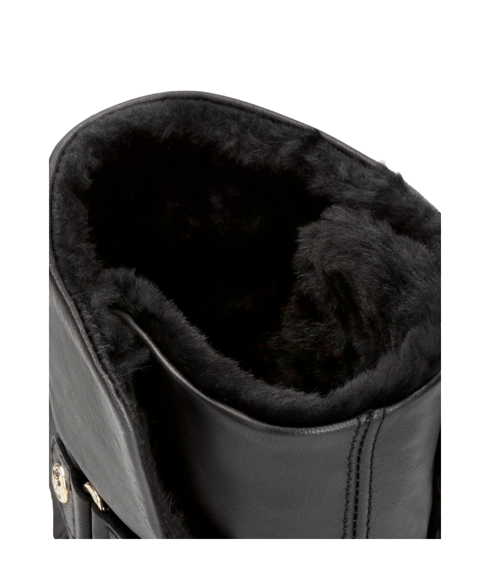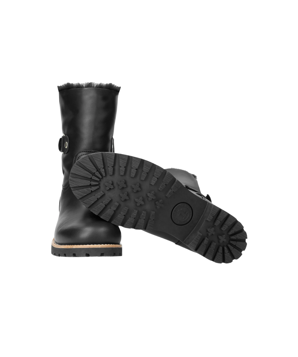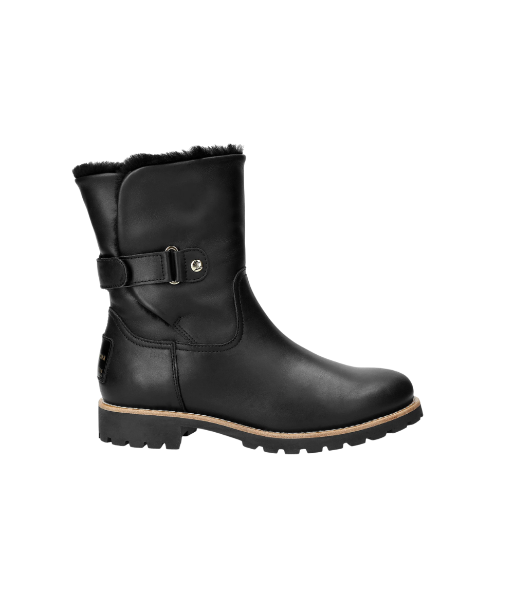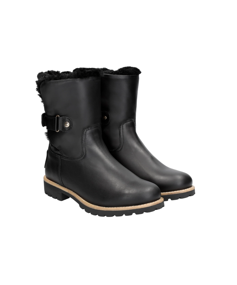 Flat women's Boot. WATERPROOF Black Napa Leather. Velcro Closure. Sheepskin lining. Removable anatomical insole. Natural, flexible and durable rubber sole. Shaft height: 19 cm. Heel height: 4 cm. 100% Made in Spain.