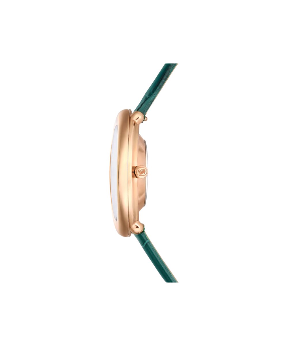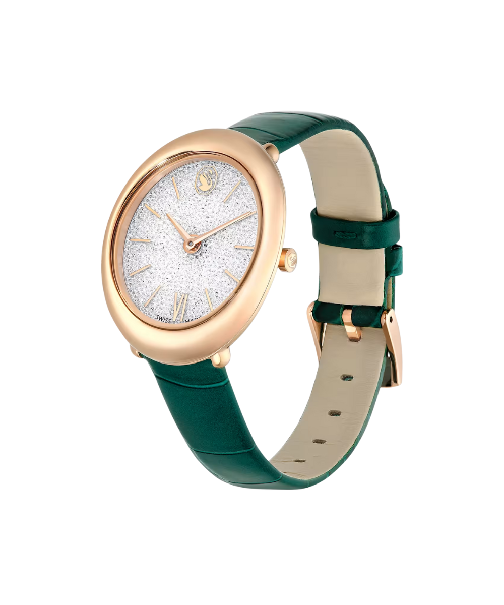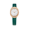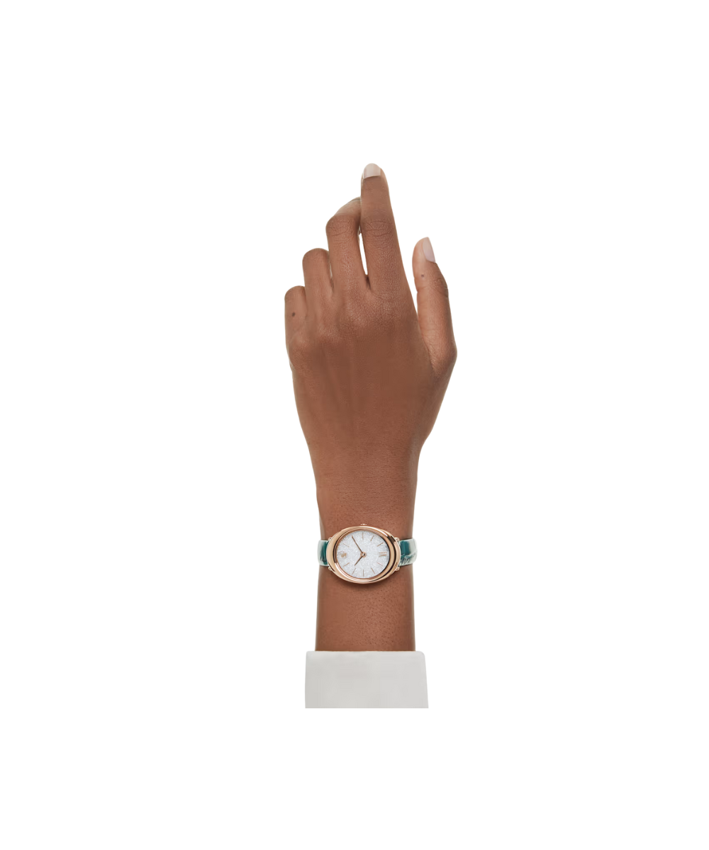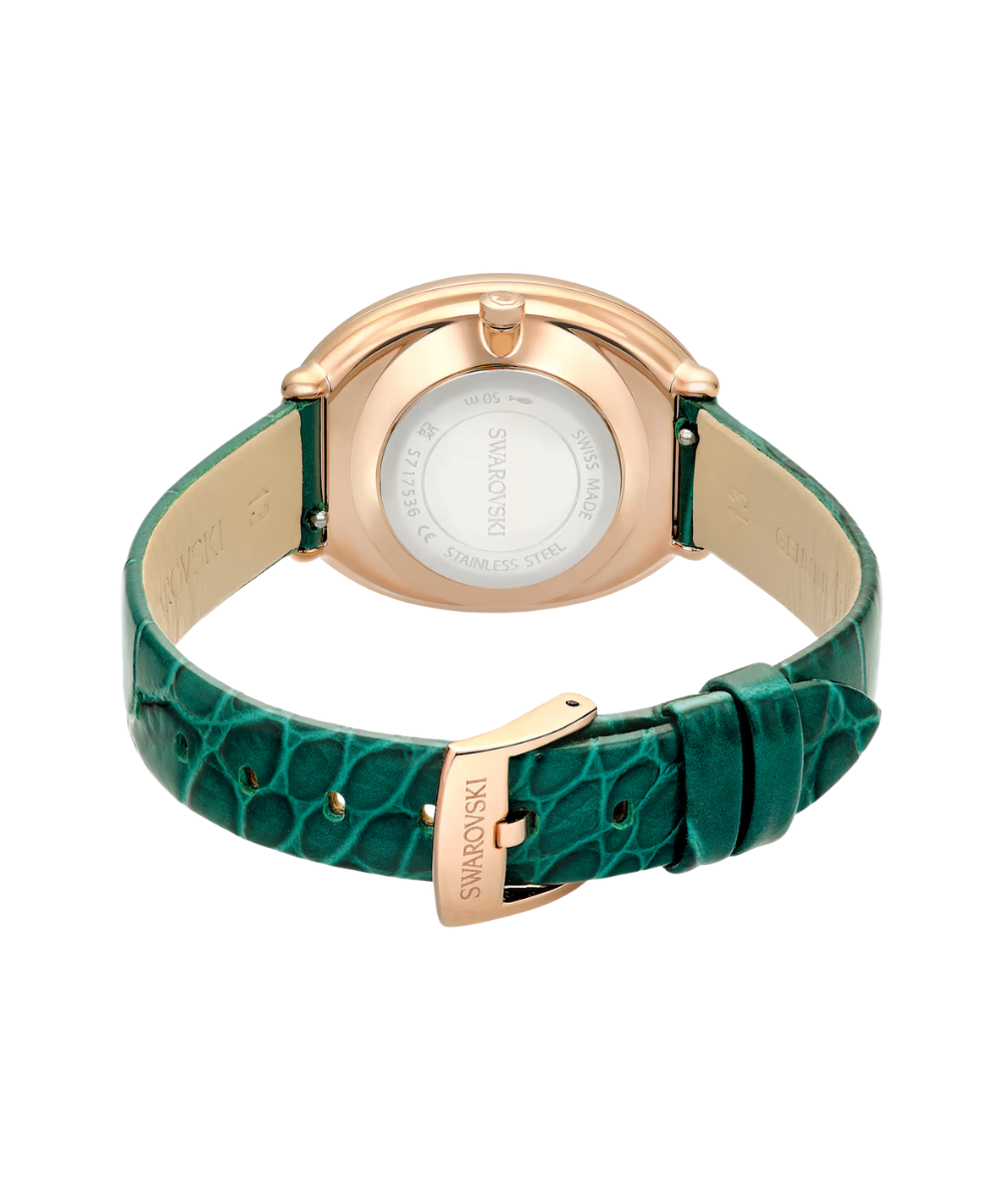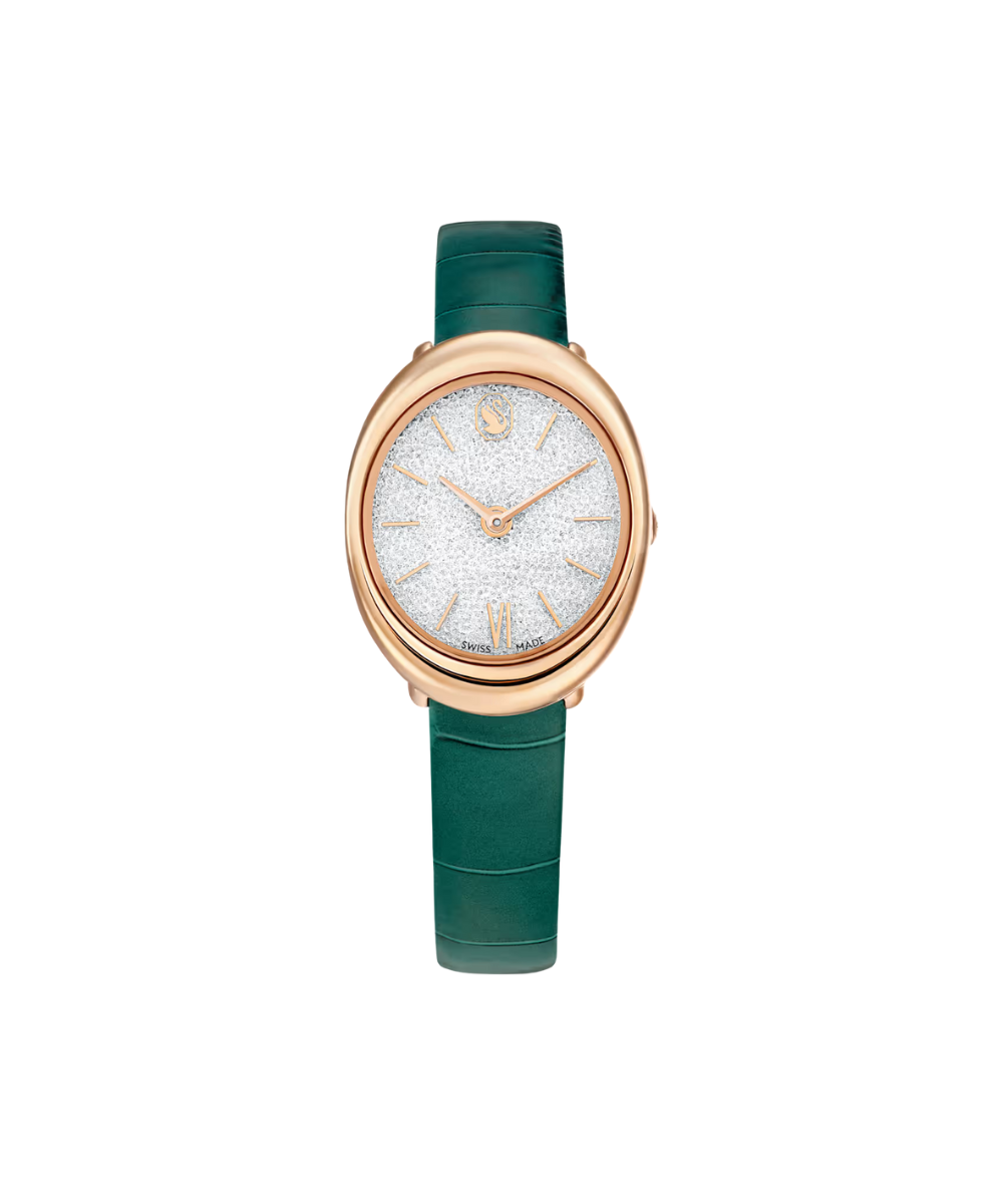 The Imber timepiece conveys a modern approach to watchmaking through its glittering dial and timeless elliptical shape. This 24 x 26.3 mm stainless steel version is rose gold-tone finished and features around 1000 clear crystals on its Crystalline dial. Amongst the slender hour markers, a single Roman numeral is displayed at 6 o’clock, while Swarovski’s iconic swan is placed at 12 o’clock. The Swiss Made watch is worn on a green leather strap with crocodile print and offers a water resistance of 50m. Make this your go-to choice for sophisticated day-to-night styling.
