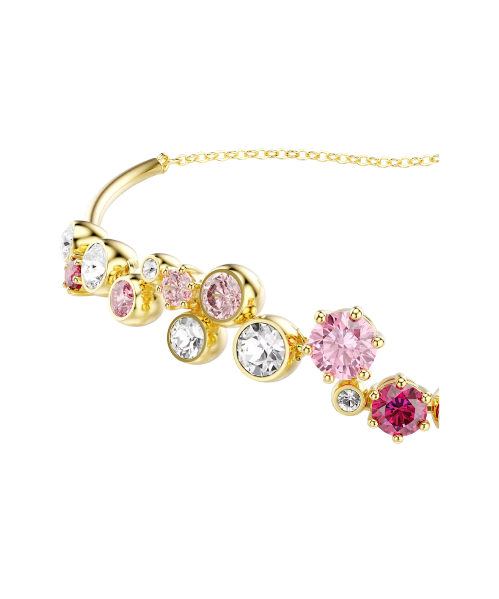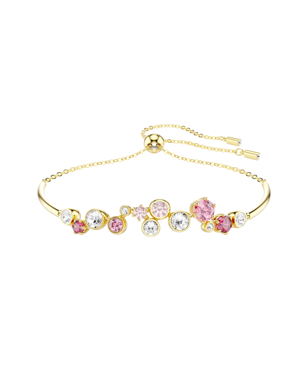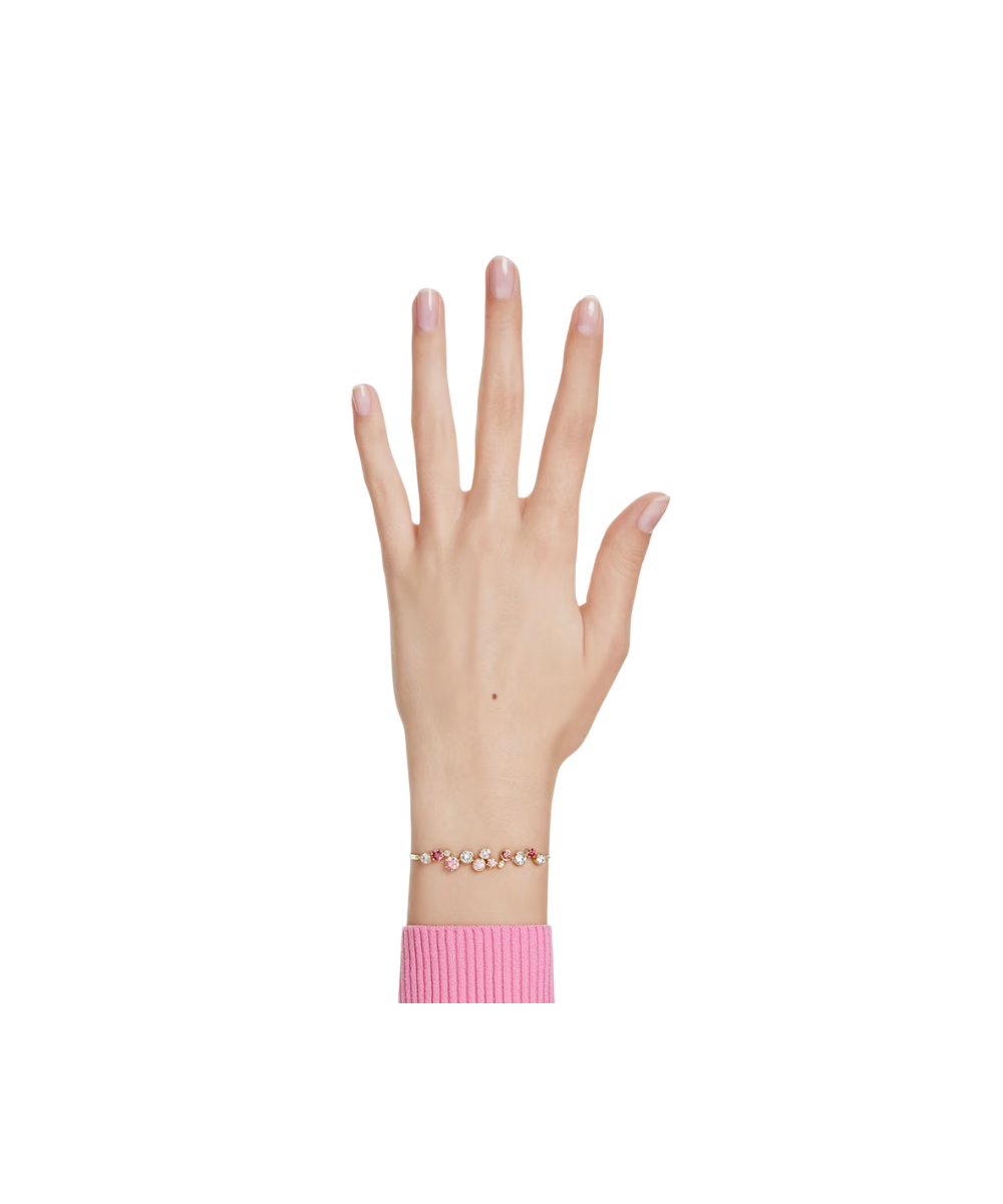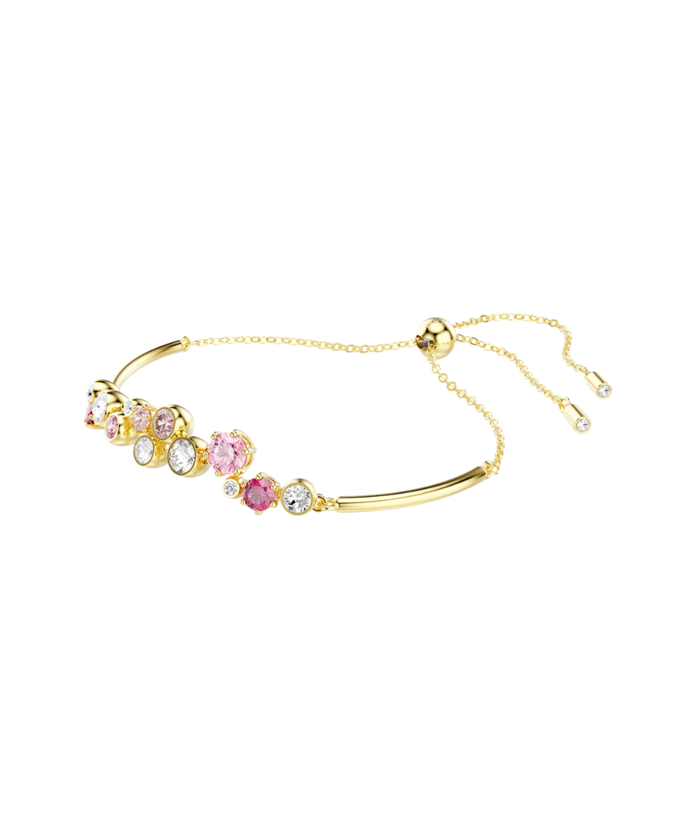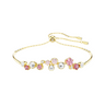 Let your playful side shine with this warm and joyful bracelet. The Constella design features a delicate chain and gold-tone plated bars, along with a vibrant display of crystals and Swarovski Zirconia in various sizes. The vivid mix of clear tones and pink and red shades gives the bracelet a captivating appearance, while the sliding adjustment allows you to easily change the fit.