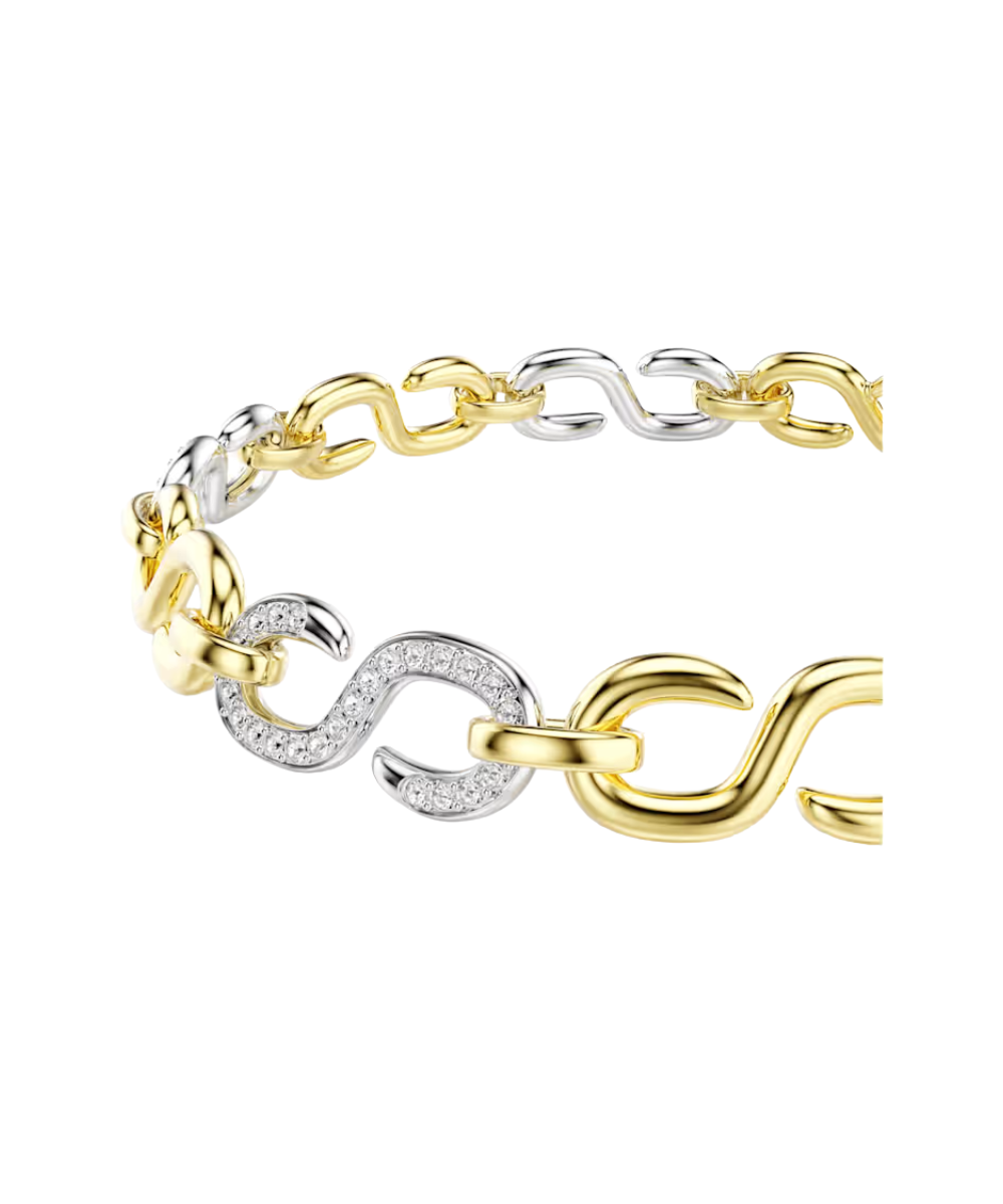 Go full glow with this Swarovski bracelet in the signature Dextera style. The design features alternating links in gold-tone and rhodium plating, with clear crystals added for maximum radiance. A curvaceous and industrial look, it can be paired with other matching Dextera pieces with the same distinctive silhouette