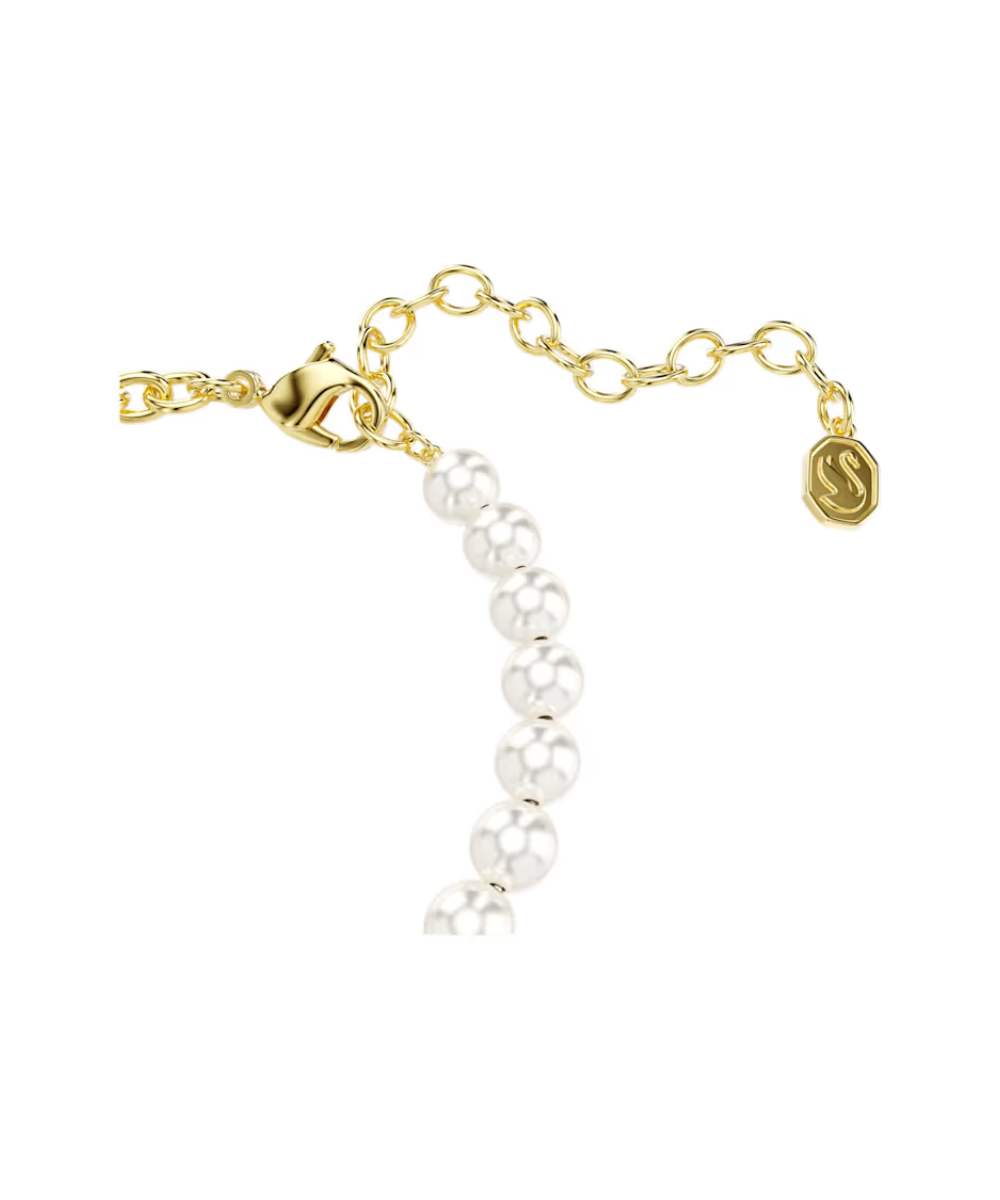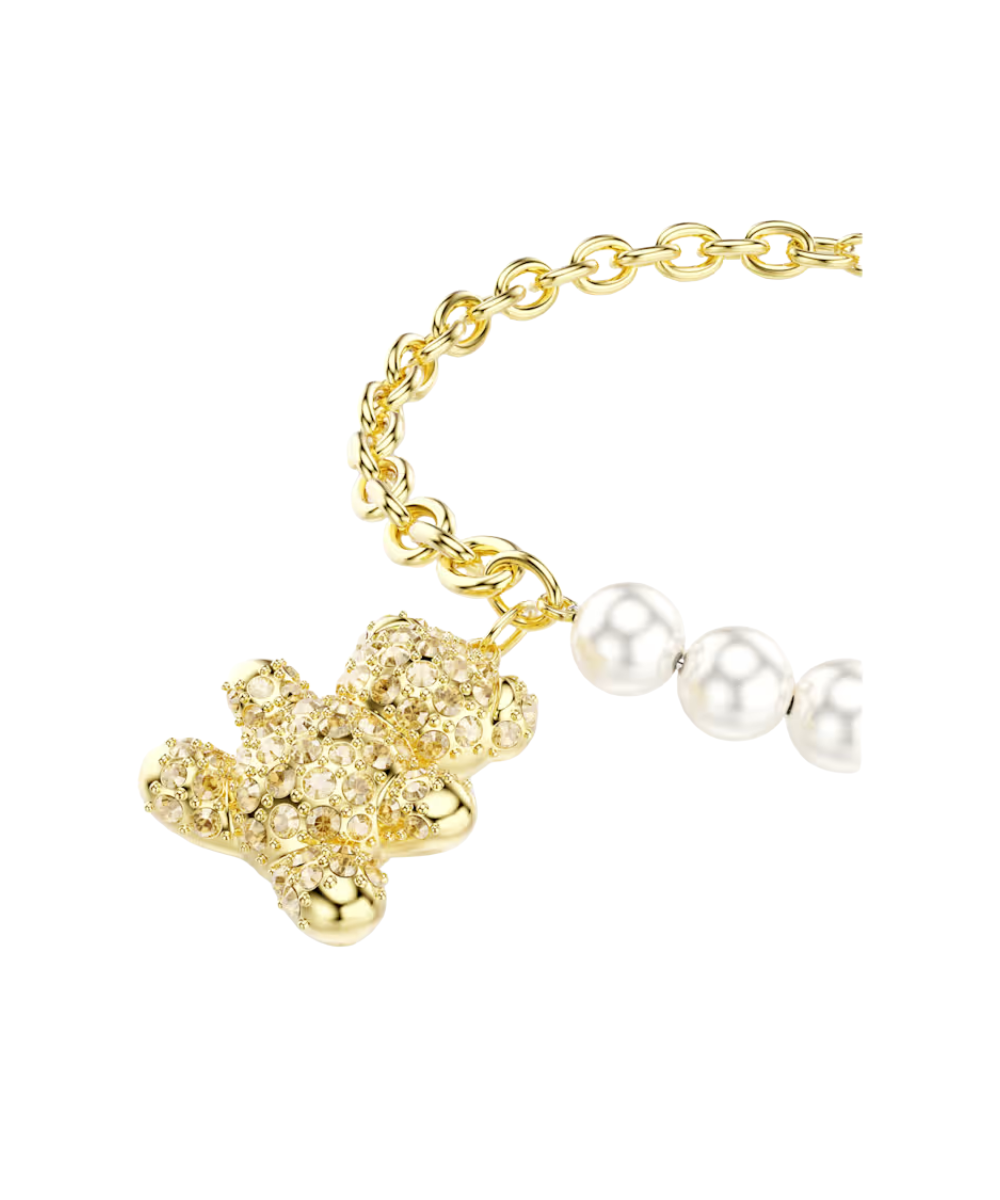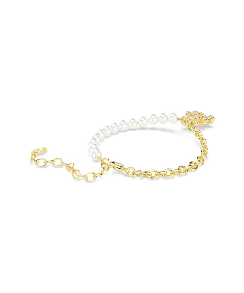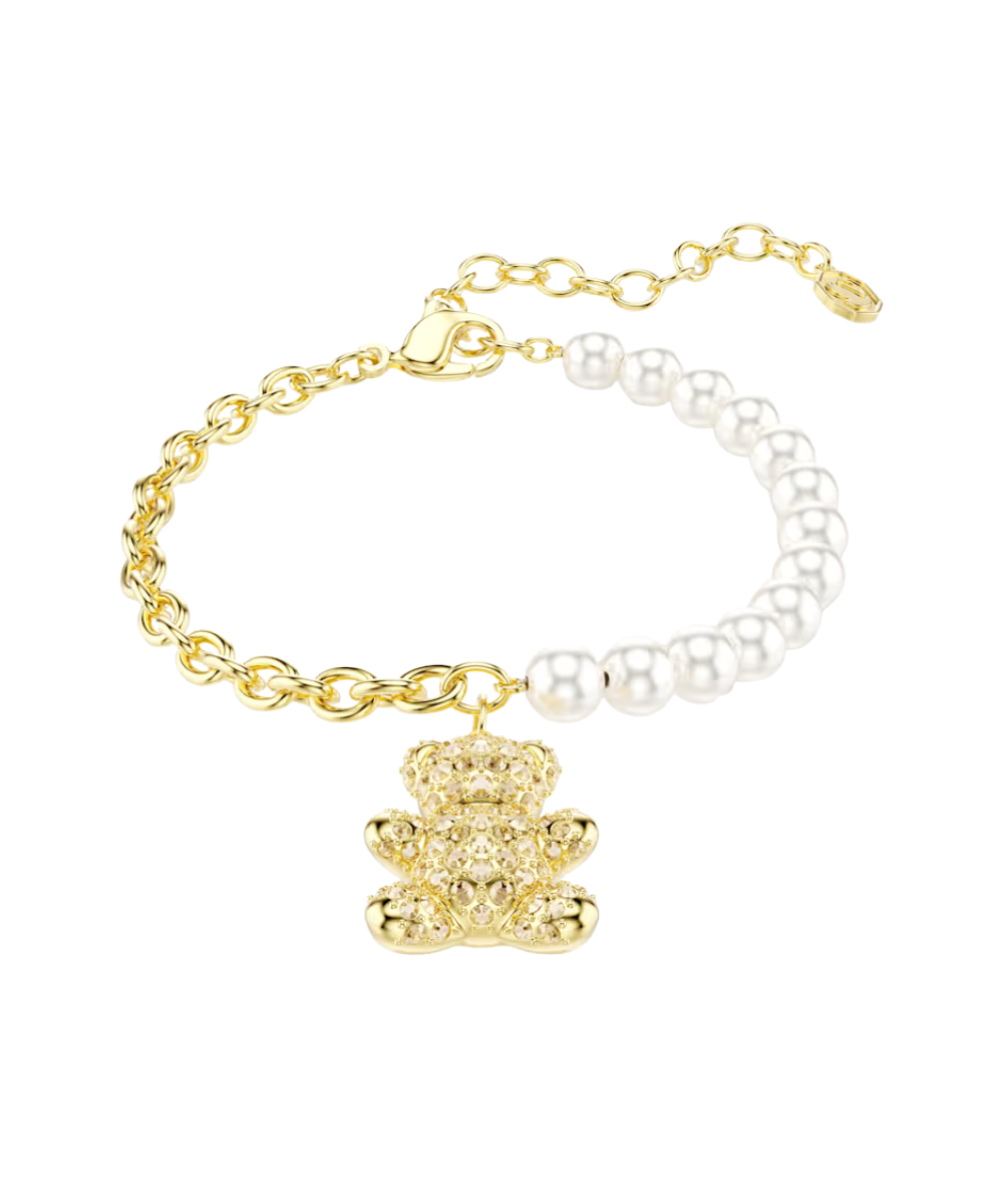 This radiant teddy bear bracelet transforms a cuddly childhood favorite into a luxurious piece of modern style. The heart-warming teddy motif is embellished with Golden Shadow crystals and is worn on a bracelet of Swarovski Crystal Pearls and a gold-tone plated chain. A playful way to bring joy into your style.
