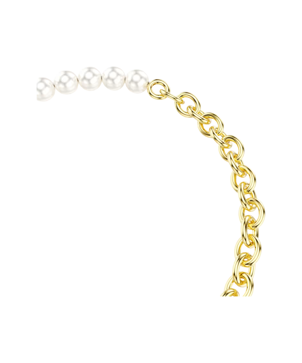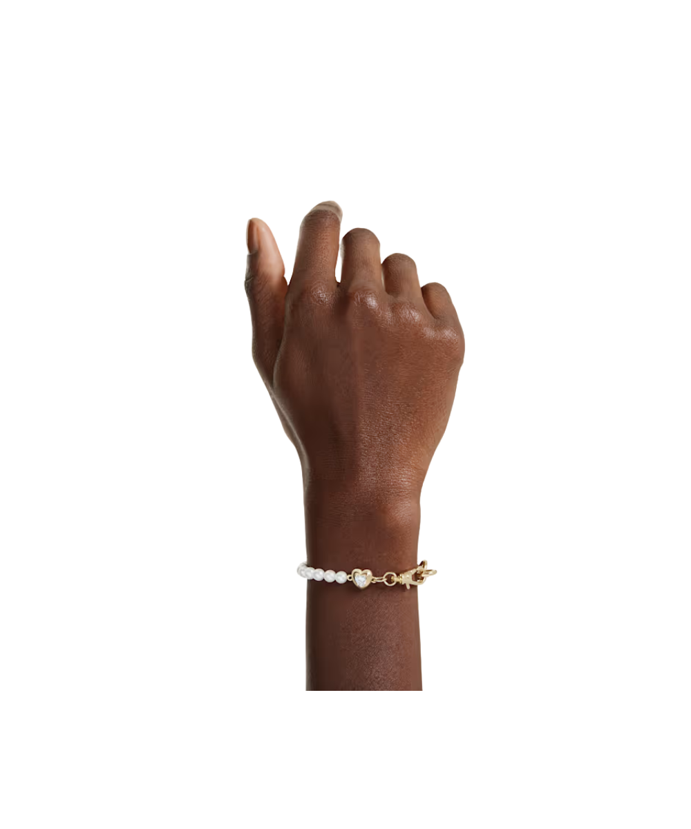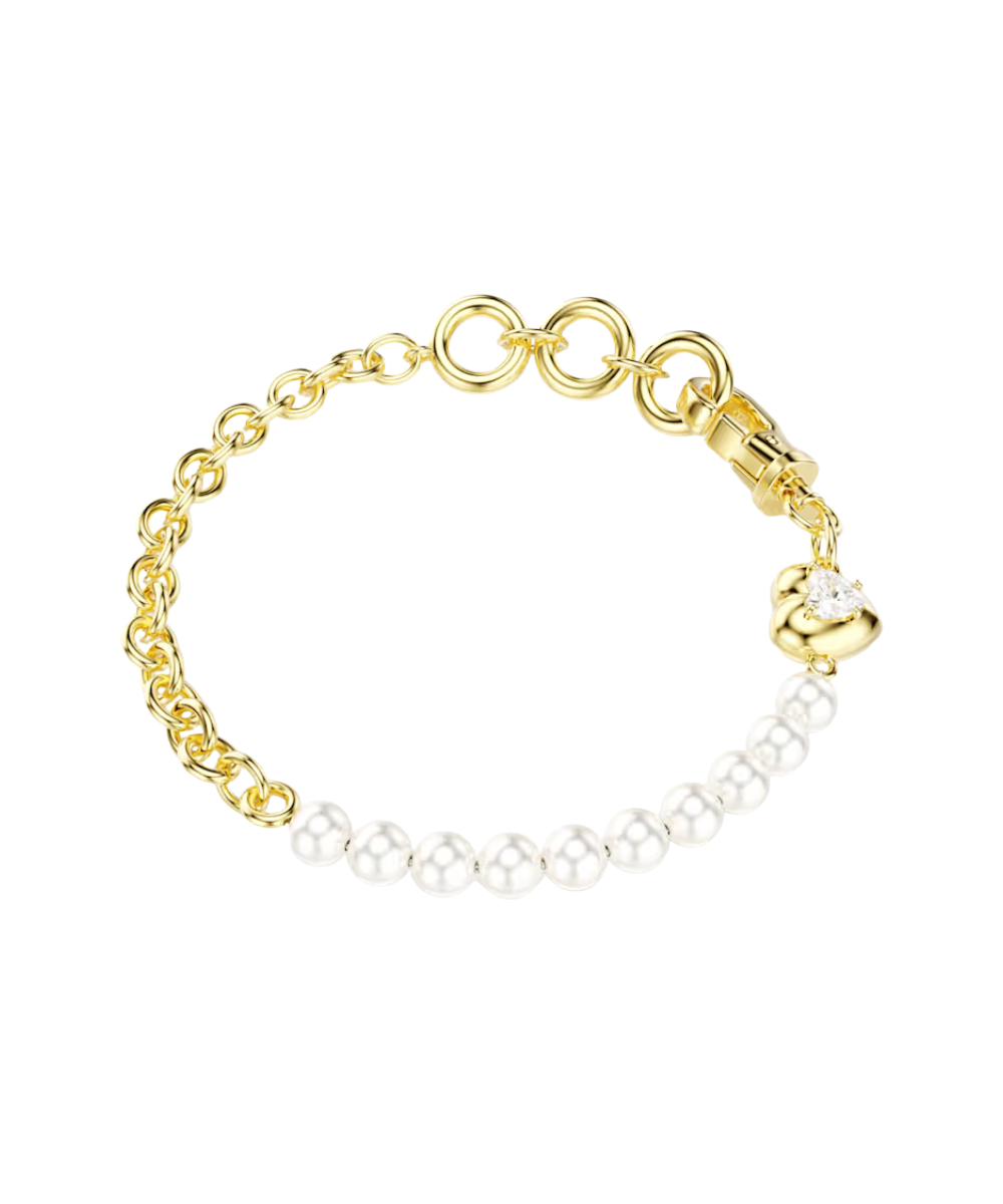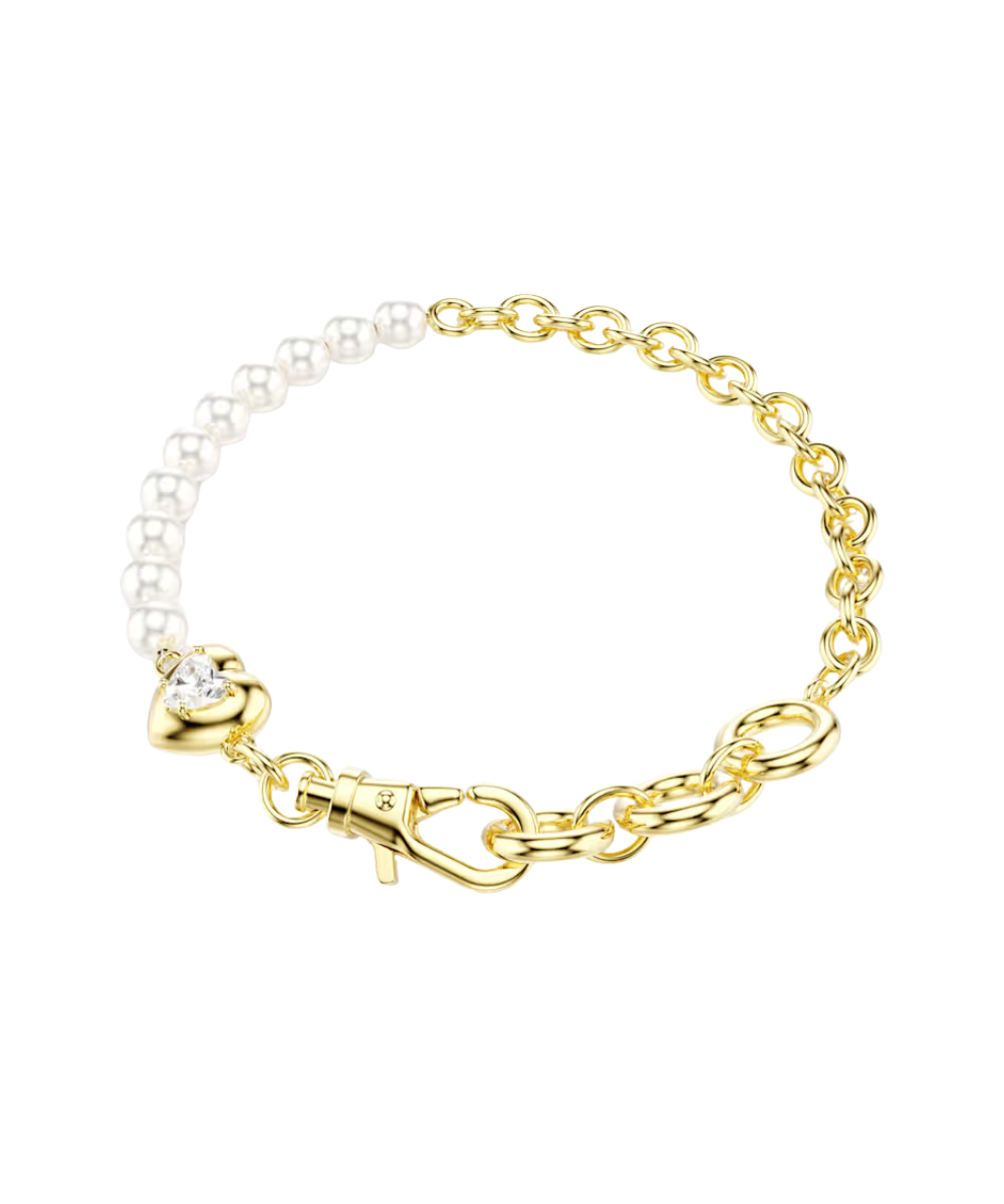 Split between a gold-tone plated chain and a row of white Swarovski Crystal Pearls, this expressive bracelet features a carabiner link and a small heart motif for a subtle expression of love. Wear it alone or as a carrier bracelet for our Swarovski charms.