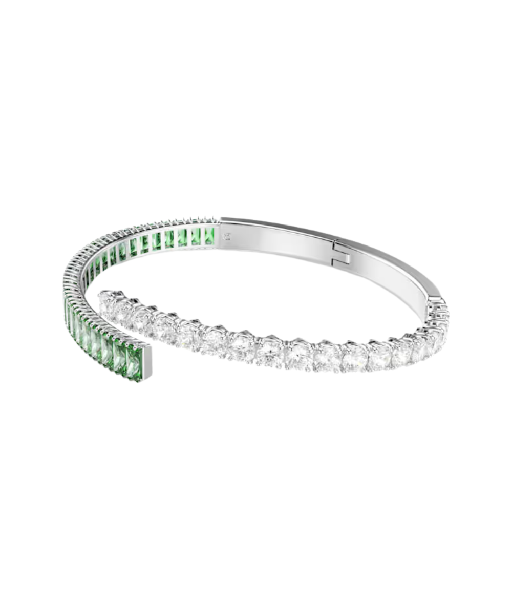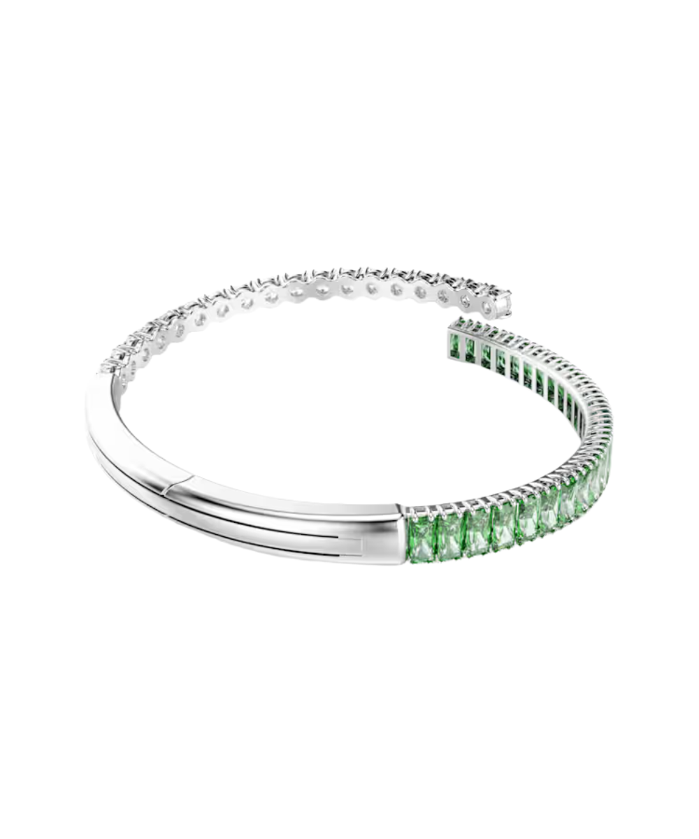 Colorful, energetic, and expressive, this Matrix bangle is a joyful way to accessorize. The overlapping band is rhodium plated and features clear and green Swarovski Zirconia in round and baguette cuts. A vivid choice that pairs beautifully with the matching ring and earrings.