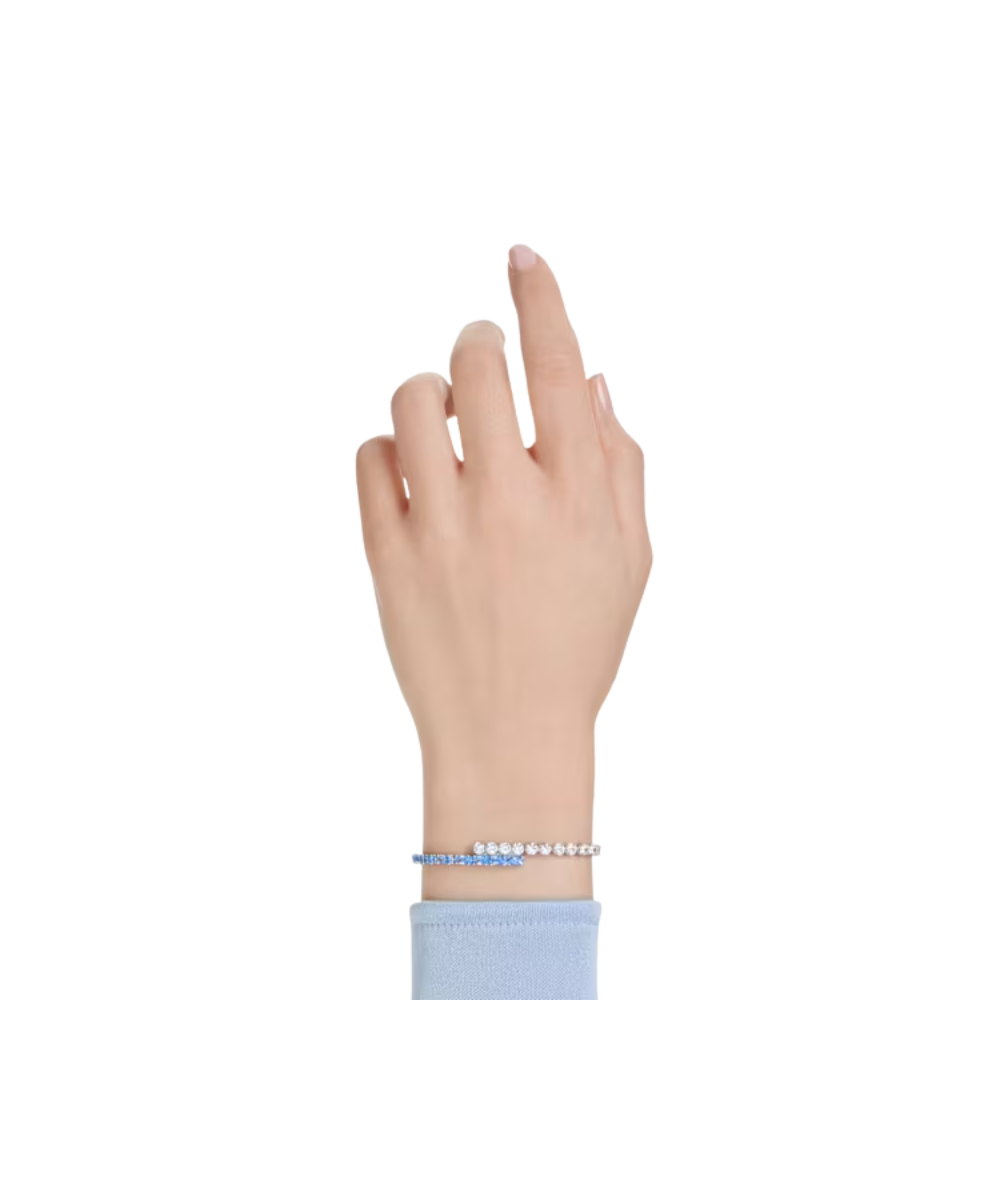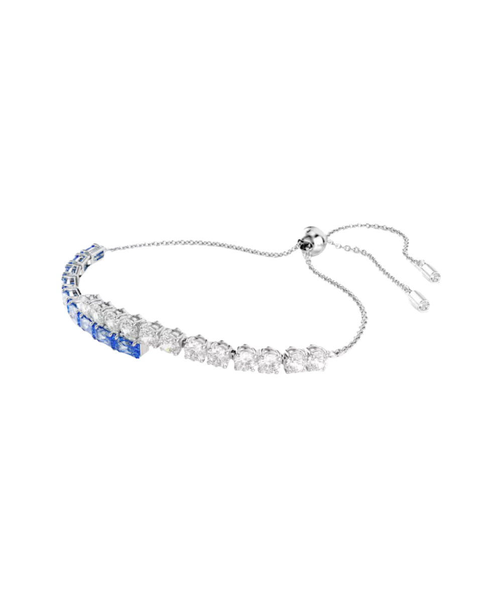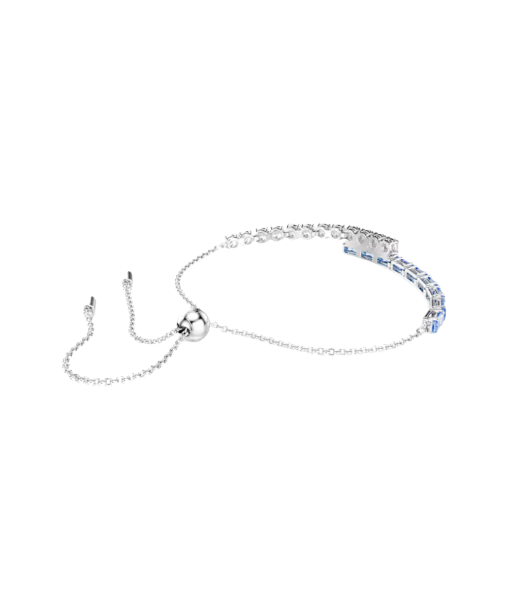 Delicate yet vibrant, this Matrix Tennis bracelet is a perfect way to bring joy into your style. The rhodium plated design features clear and blue Swarovski Zirconia in a vivid mix of round and baguette cuts, while the sliding closure allows for a comfortable fit. This bracelet can be worn with matching Matrix Tennis pieces to heighten the color and light in whatever you wear.