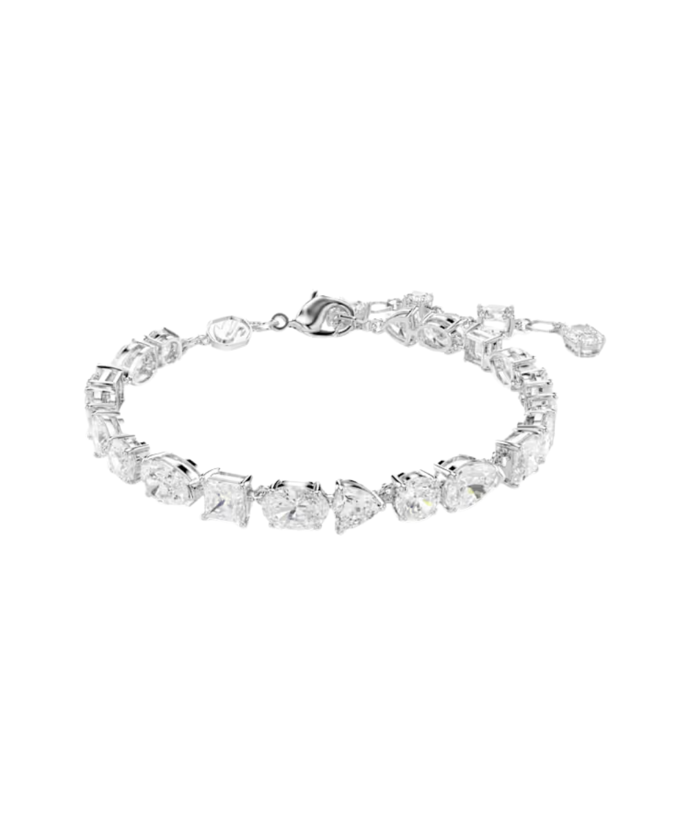 Embrace the unexpected and assorted shapes of this Mesmera bracelet. The rhodium plated design is made with a string of eye-catching Swarovski Zirconia, all presented in a surprising mix of cuts and sizes. For extra comfort, the elongation is completed with a lobster closure and three adjustable settings. This bracelet can be coordinated with the matching Mesmera necklace and makes a radiant gift for someone special.