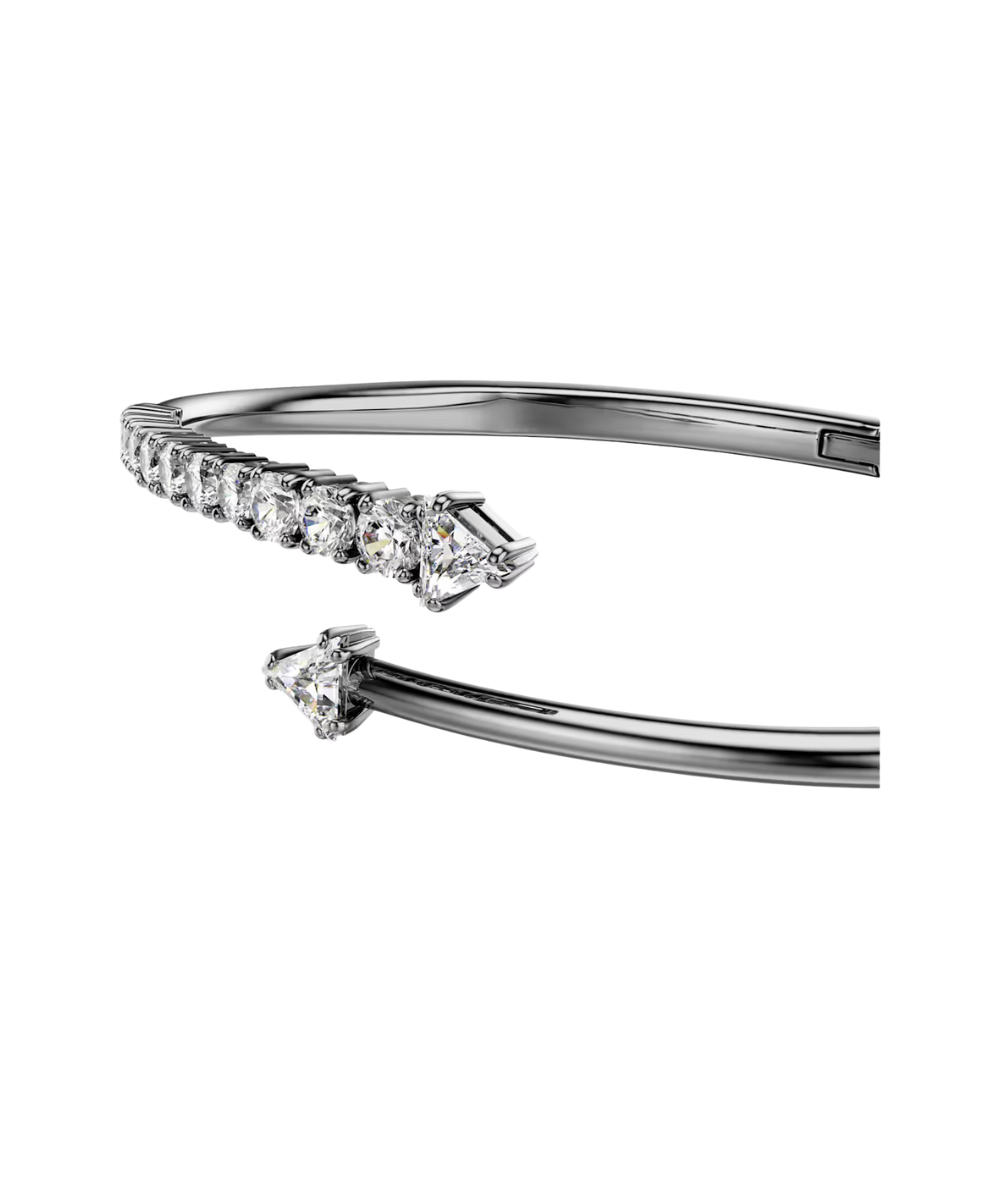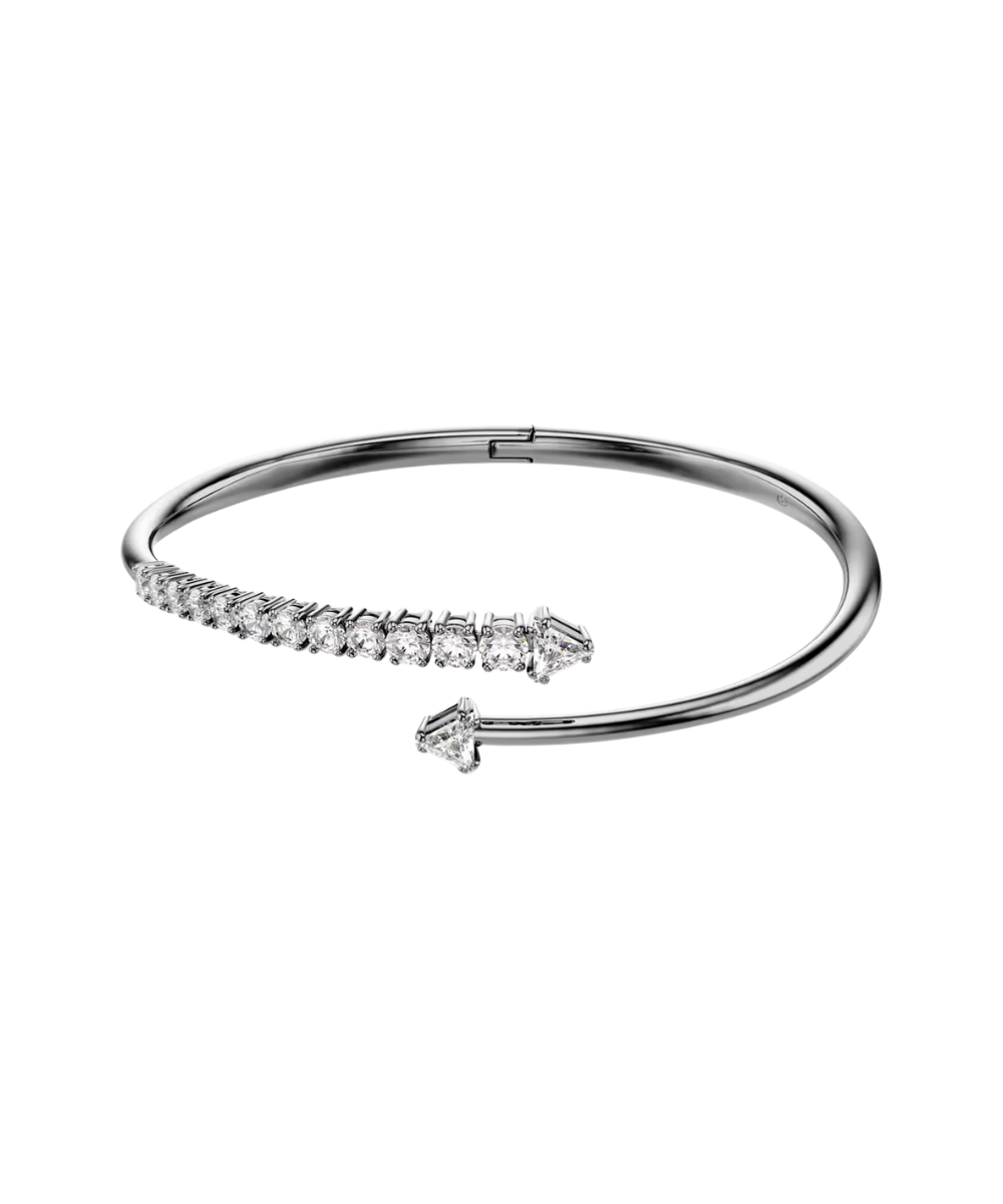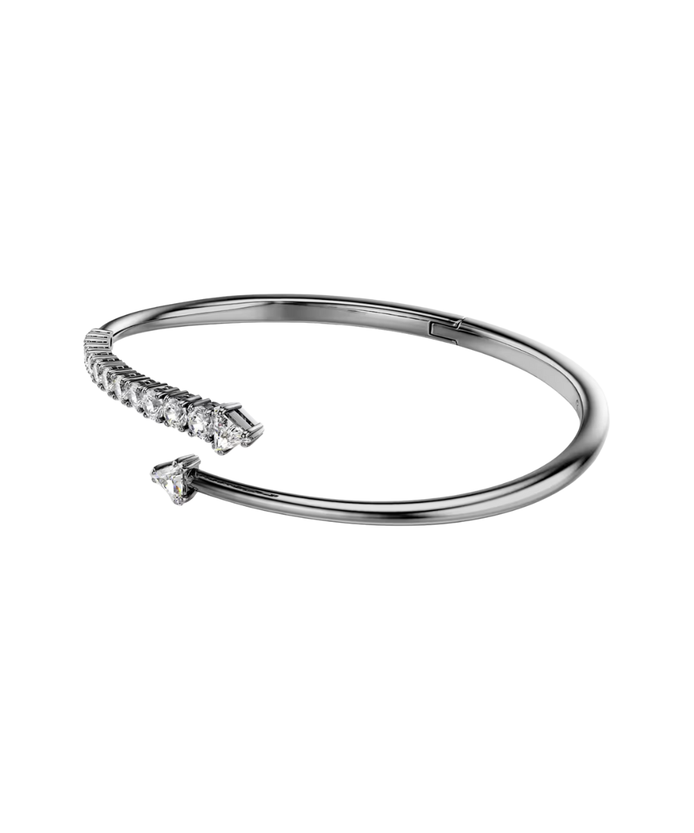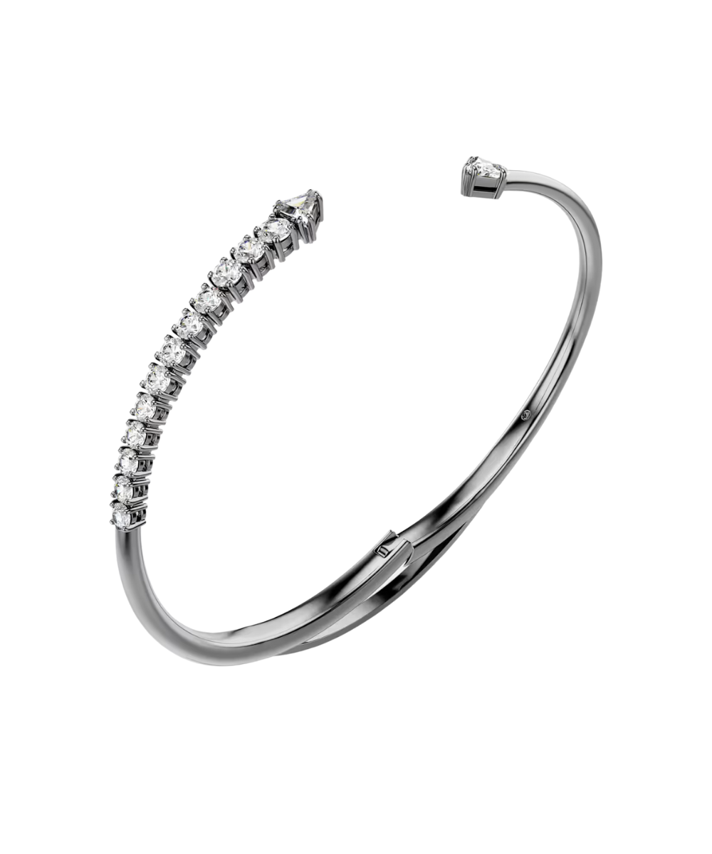 Let your alternative side shine with this impactful Sublima bangle. The ruthenium plated band is open-ended and spirals around the wrist with a variety of clear Swarovski Zirconia in prong settings. The spiky tips add a contemporary finish and match perfectly with other jewelry pieces from the same expressive family.