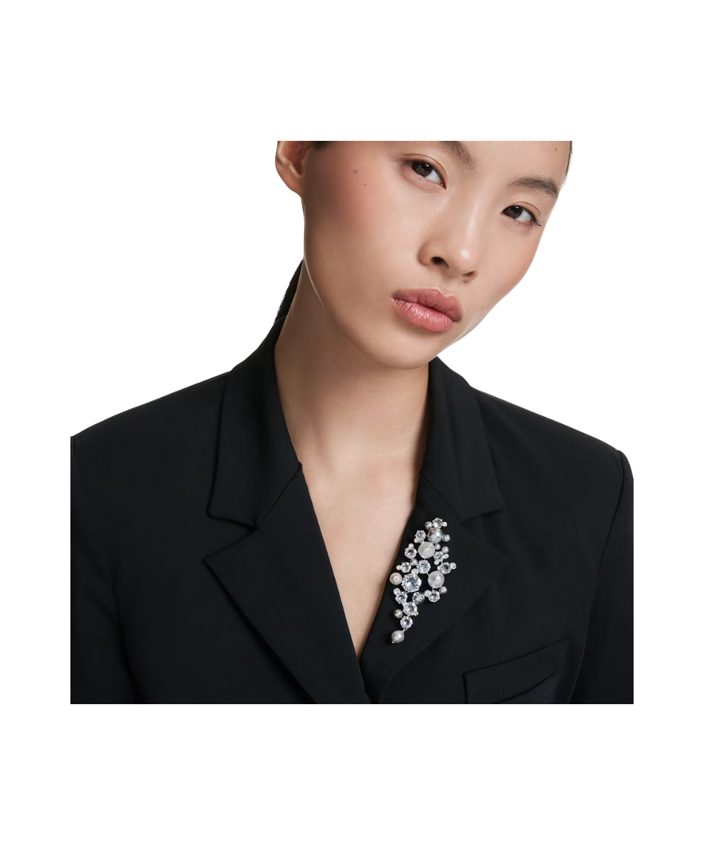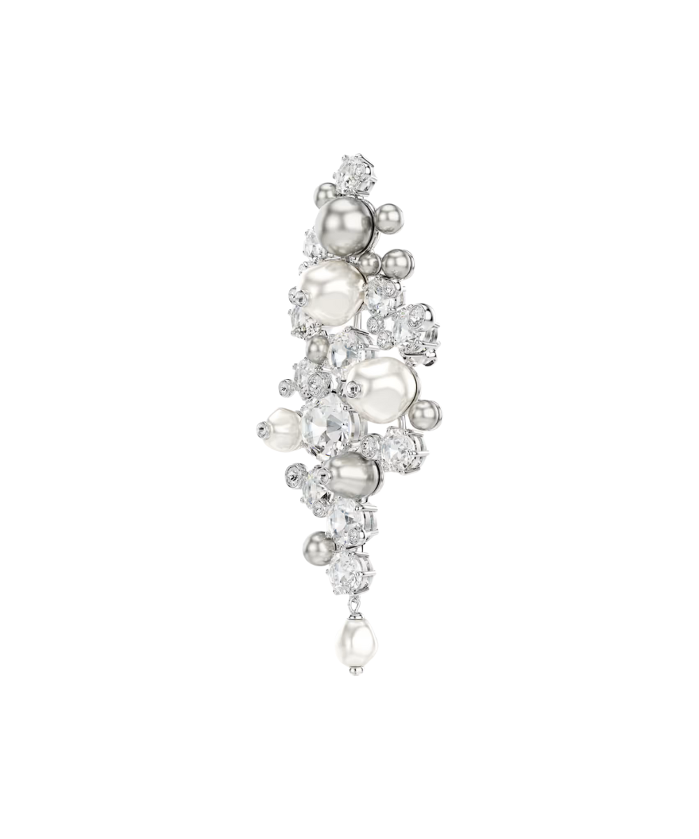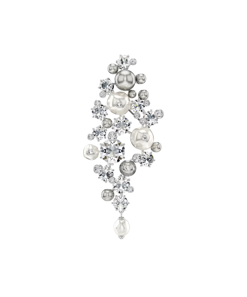 Embrace the cosmic side of your style with this starlike brooch in rhodium plating. The dramatic silhouette reveals a cluster of clear crystals and white and gray Swarvoski Crystal Pearls, meticulously brought together in a style that is complex yet harmonious. Wear this brooch alongside the matching earrings or choker to maximize the stellar effect.