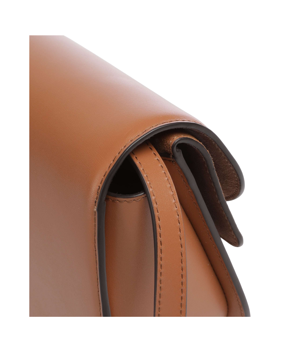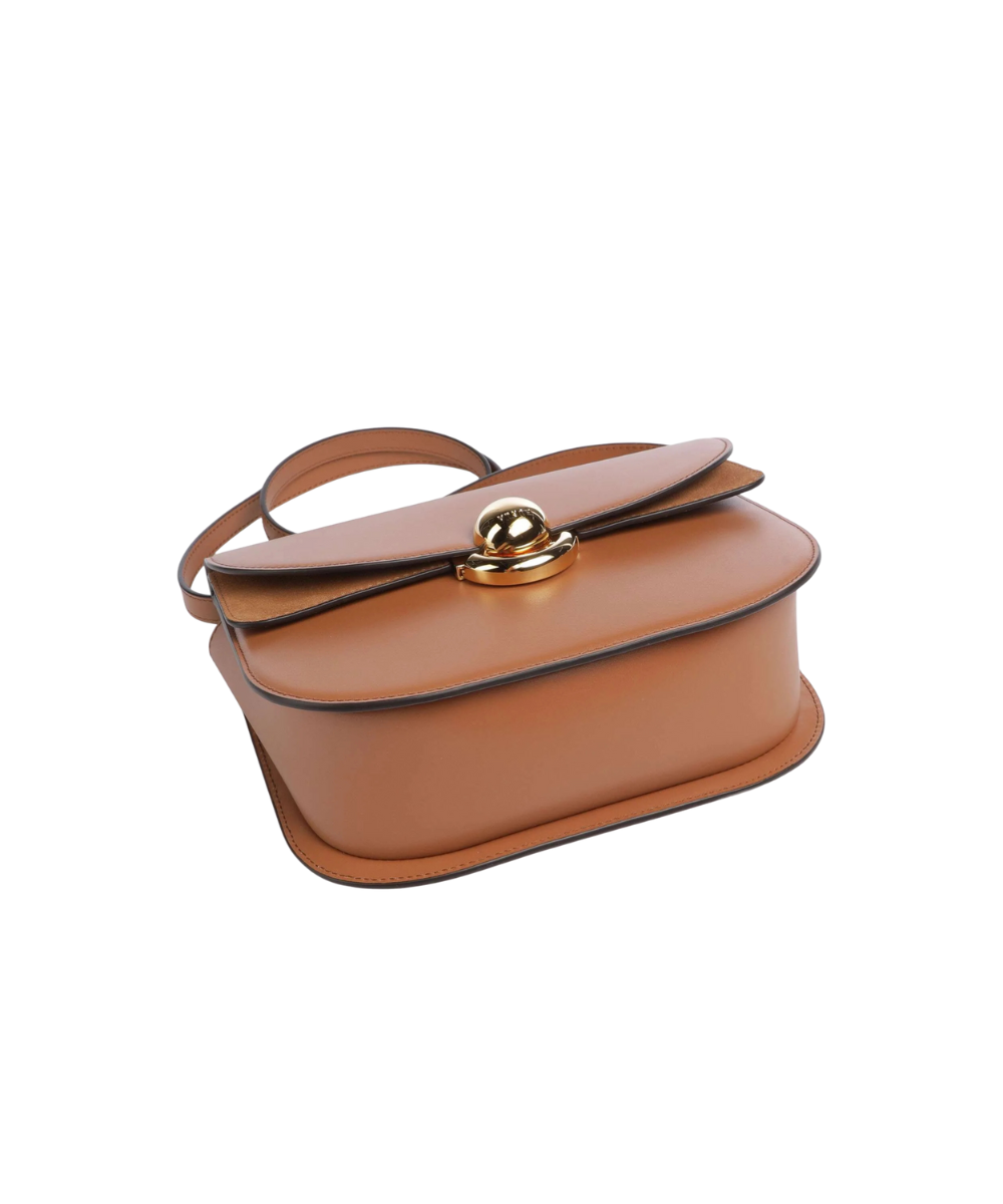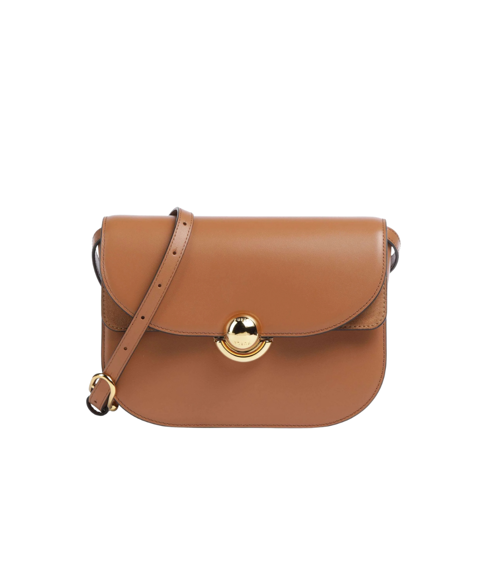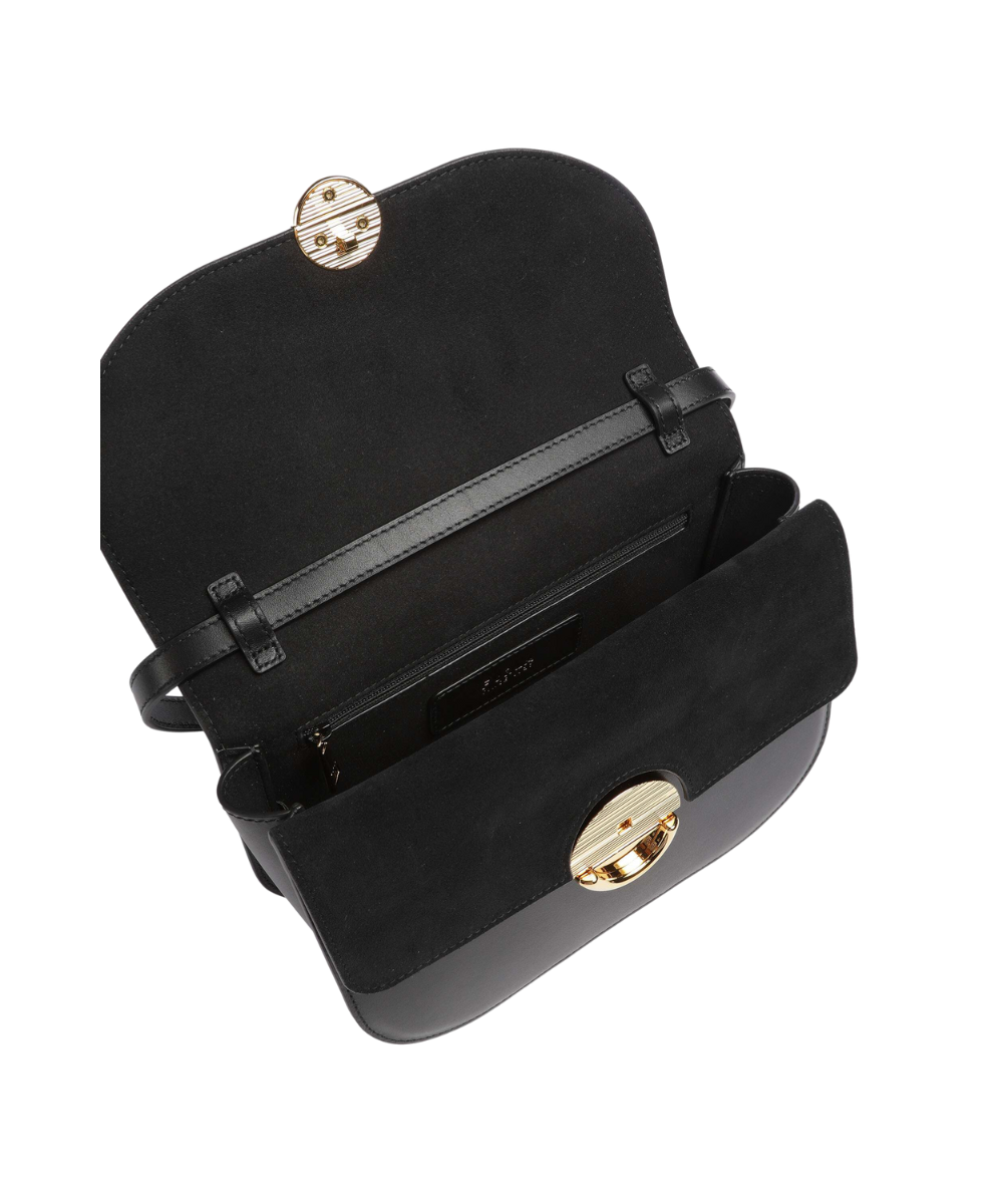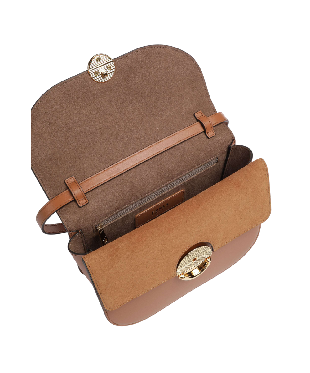The sleek lines and saddle silhouette of this bag make it elegant and distinctive. The small Furla Sfera piece has a matching adjustable shoulder strap and can be comfortably worn crossbody or on the shoulder. Styled in luxurious smooth leather, it is finished with soft suede details on the inner flap, and the clean and simple new round Sfera closure, the iconic signature of the Furla brand.