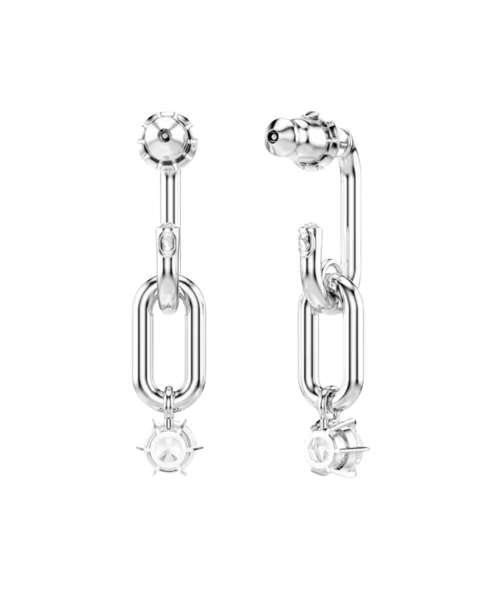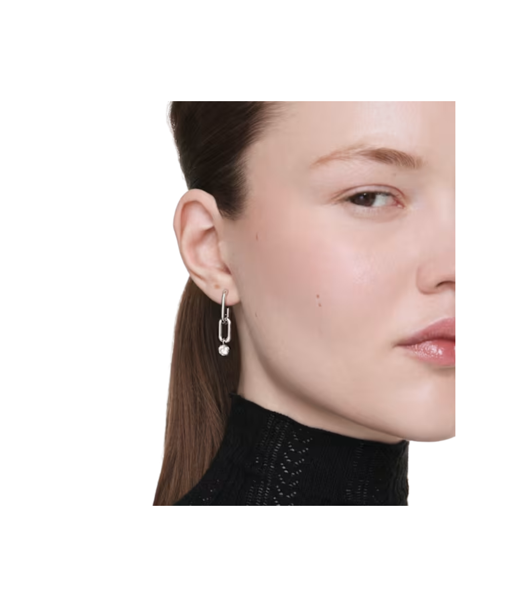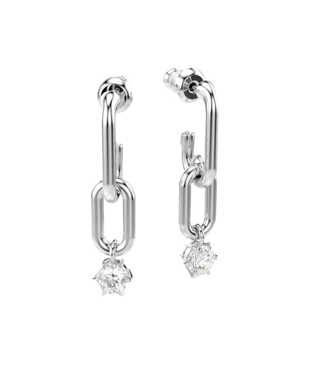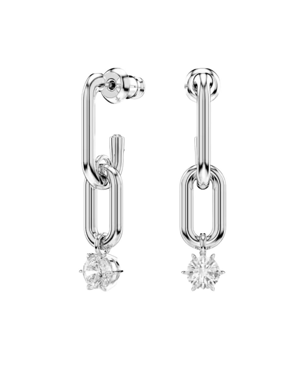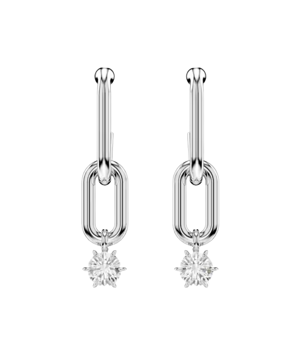 These playful earrings are a perfect choice for unexpected styling. Each piece features two interconnecting links in rhodium plating with a prong-set Swarovski Zirconia that delicately hangs beneath. It’s a sleek, metallic look for any occasion, with an extra burst of Swarovski light.