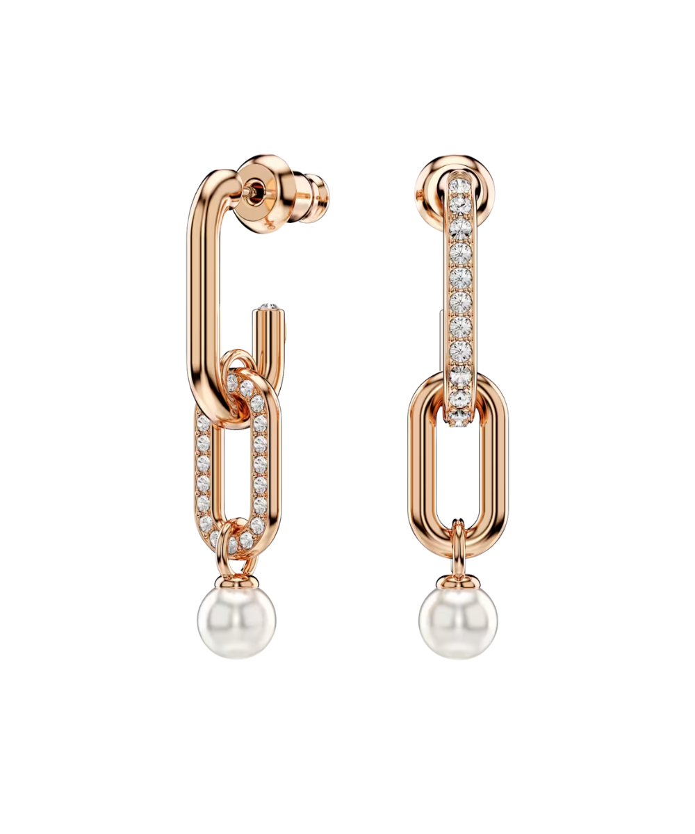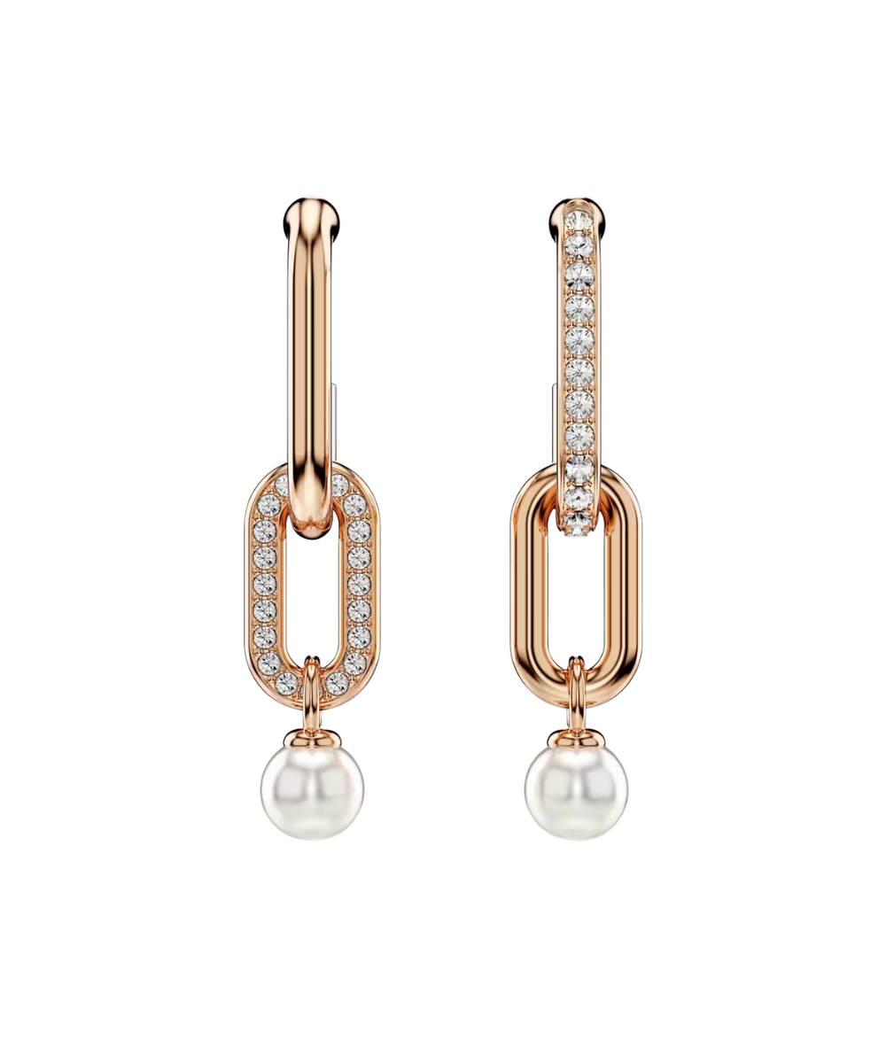 These rose gold-tone earrings turn elegance into an artform. Each piece features two interconnecting links, adorned in clear pavé, with a single Swarovski Crystal Pearl that delicately hangs beneath. For a harmonized look, pair them with a matching pendant or bracelet from the same family.