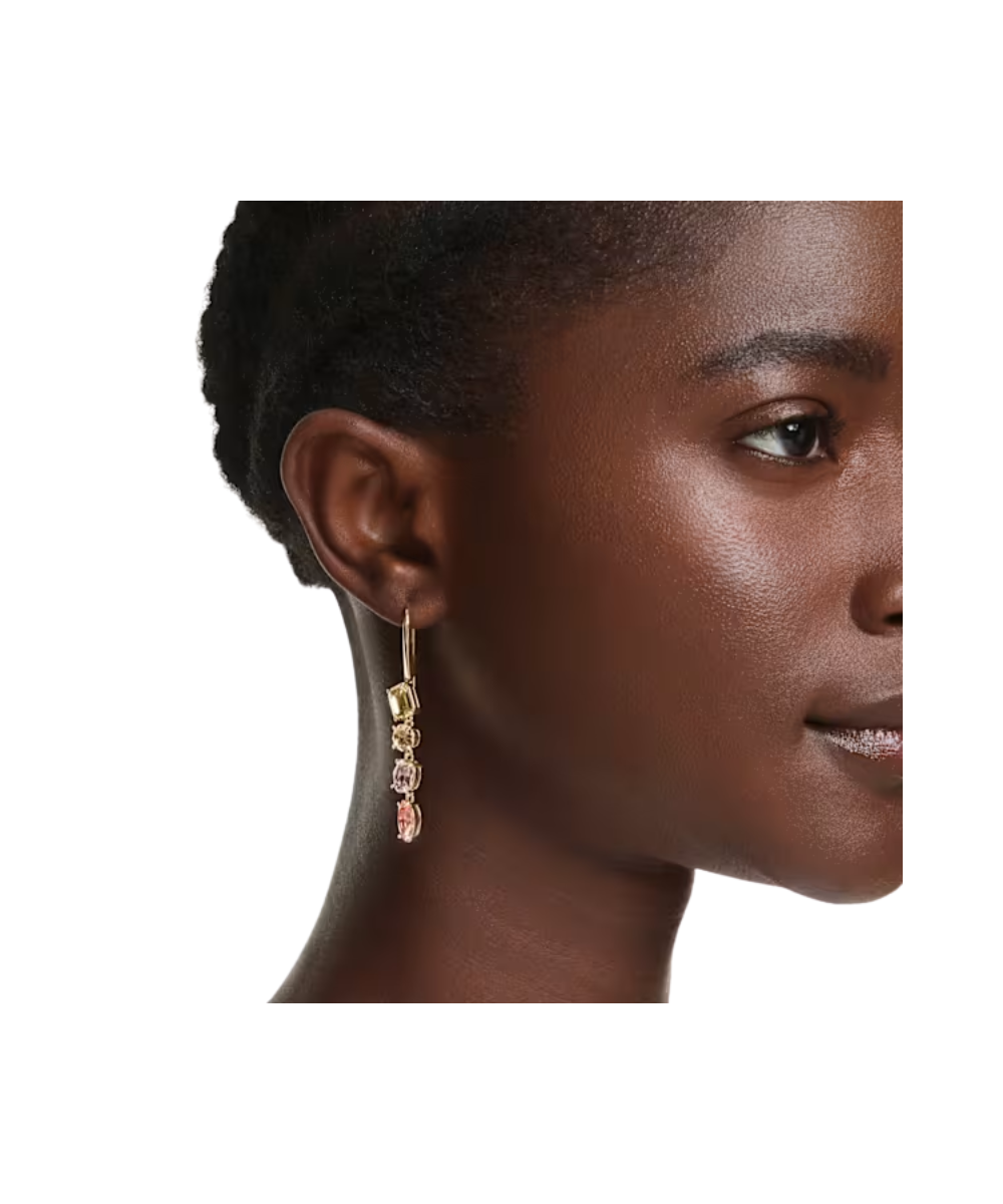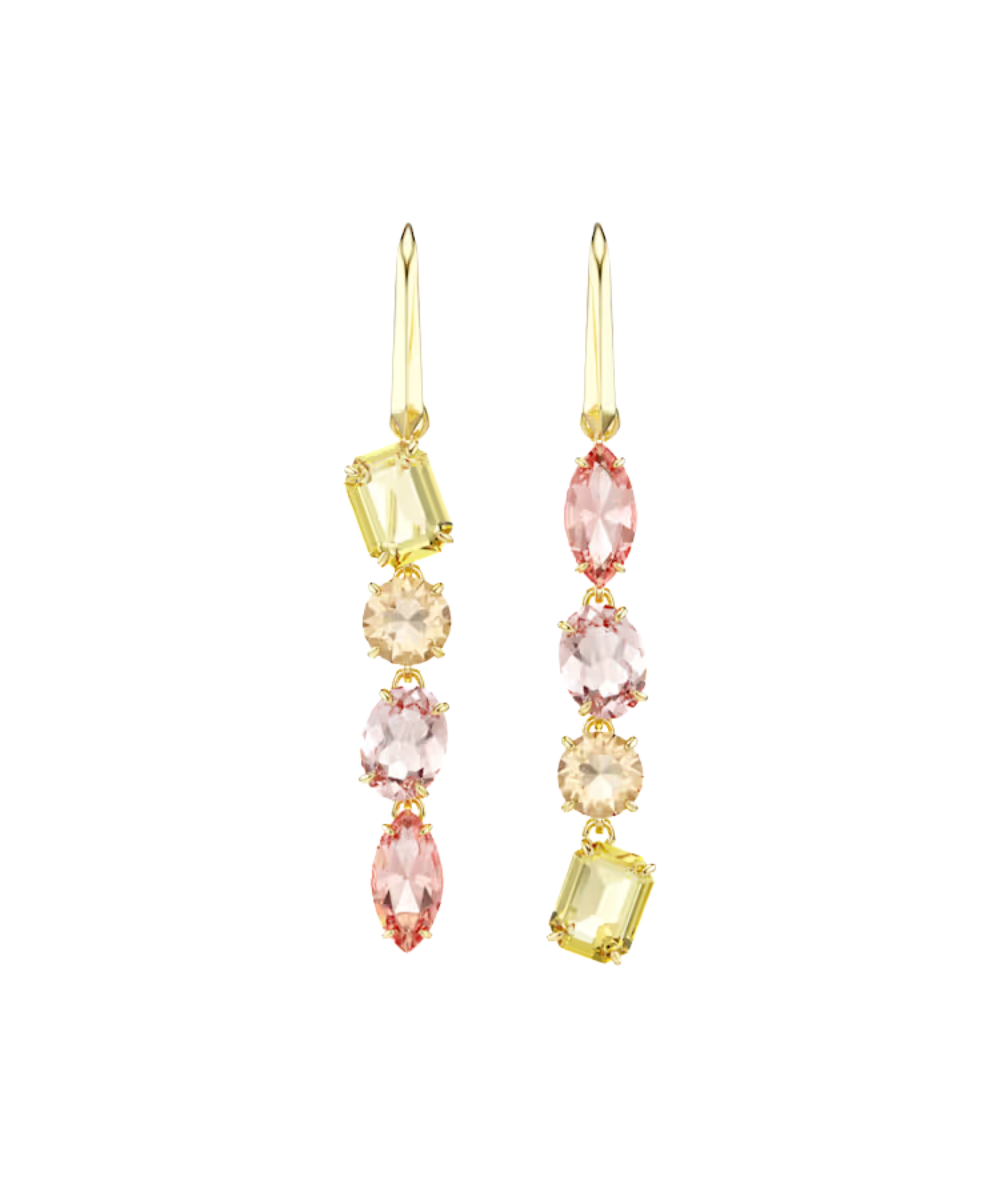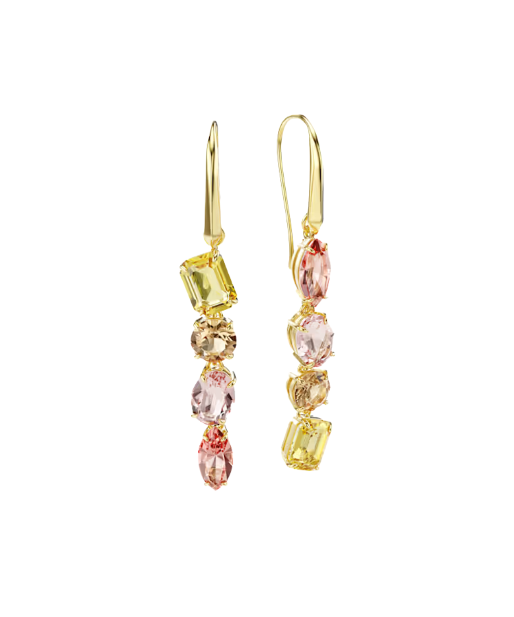 Unexpected formations are the signature style of the Gema family. In these cascading earrings, that spirit is beautifully brought to life through two colorful strands of different-shaped crystals. The asymmetrical pair reveals varying shades of yellows and pinks, all placed within a gold-tone plated setting for a look that is warm and glowing.