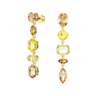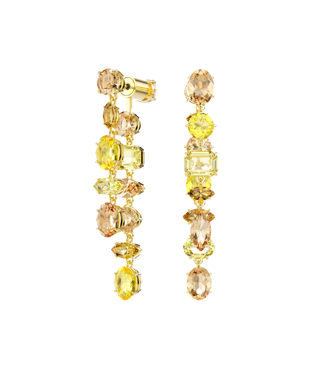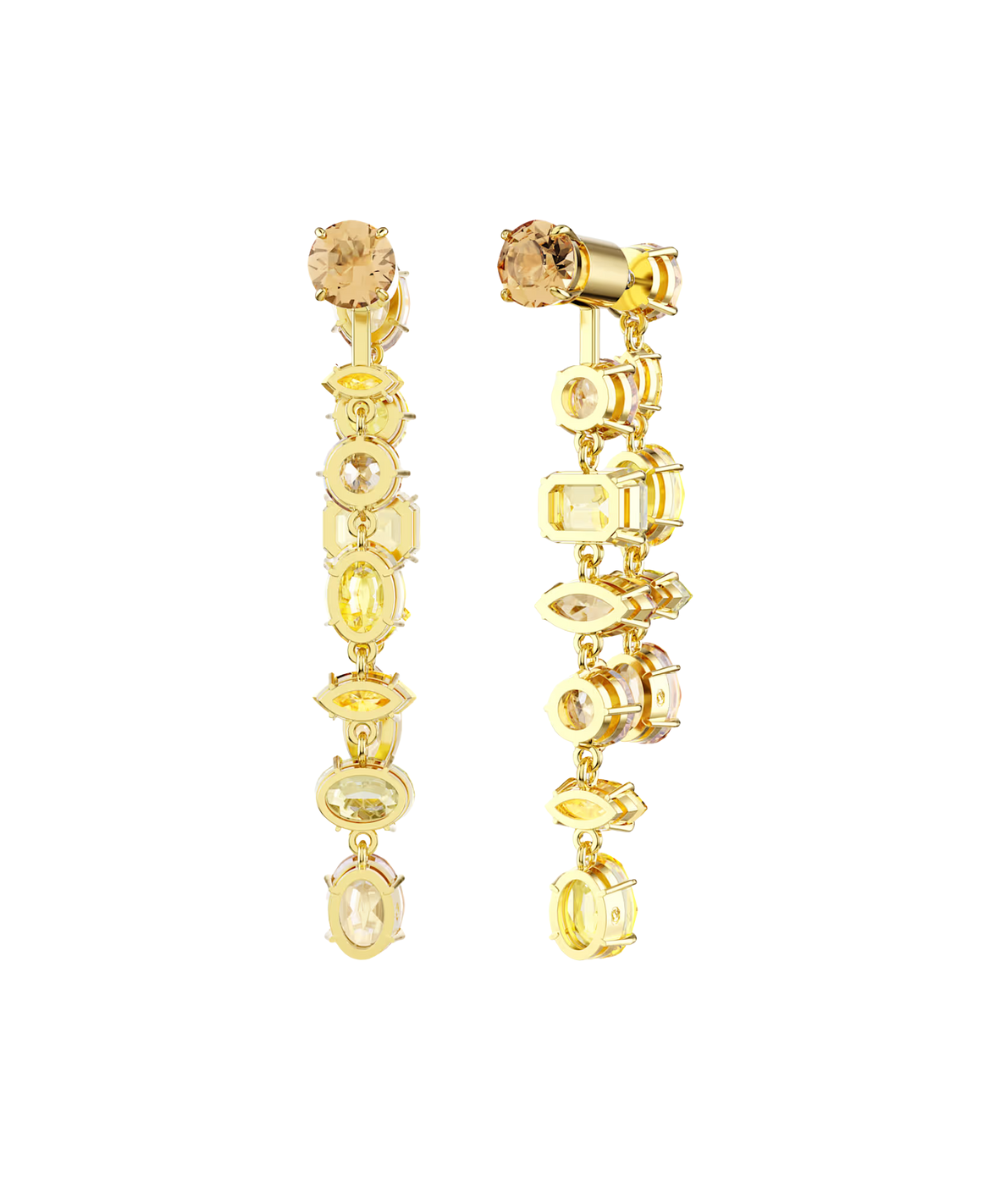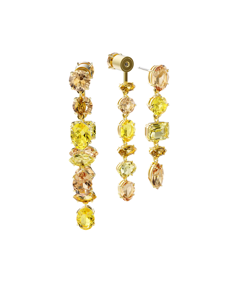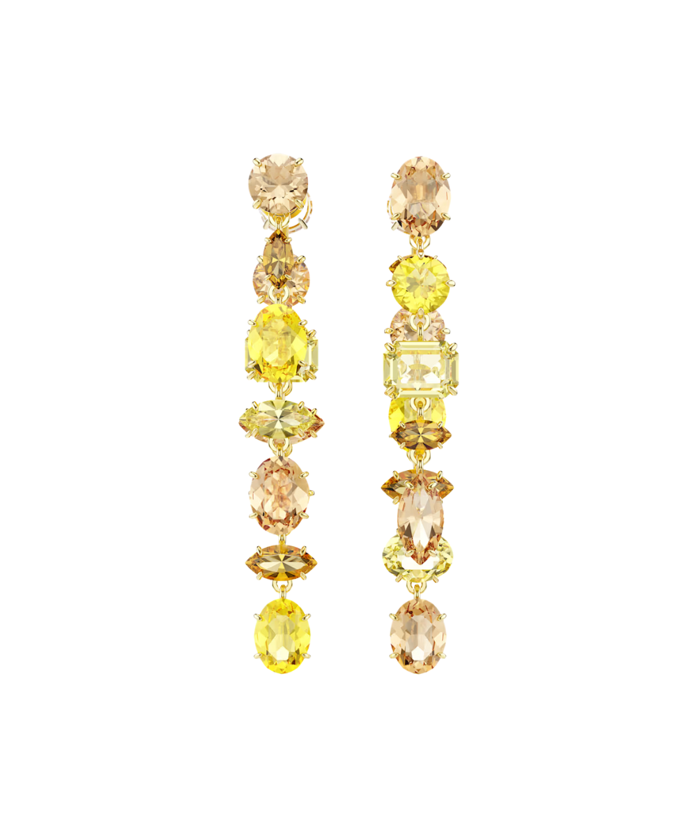 These expressive pierced earrings are crafted for mood-boosting energy. Each gold-tone plated piece features two asymmetrical strands, which are adorned with a mix of prong-set crystals in various cuts and yellow and amber tones. They are emblematic of Gema’s unexpected formations and vibrant beauty, and glow even brighter when worn alongside matching jewelry pieces from the same family.