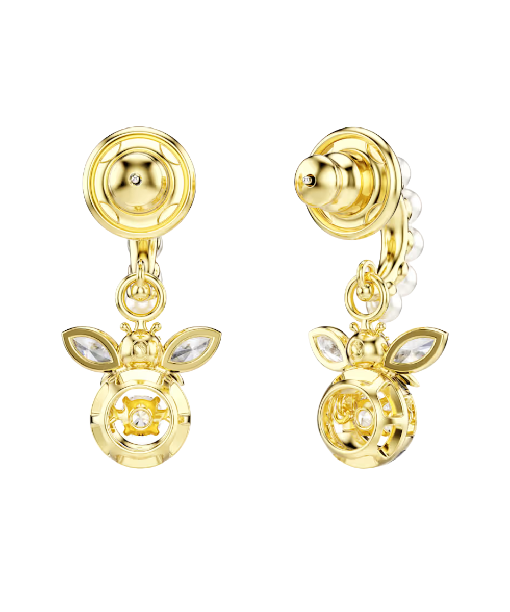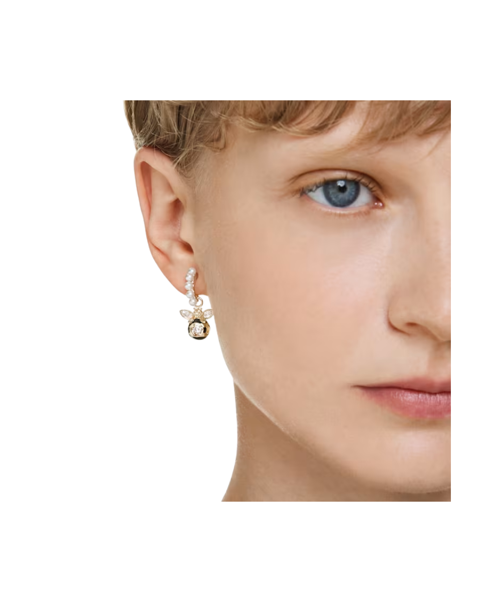 These sweet Idyllia earrings combine two busy bees that vibrate with light. Each gold-tone plated bee is set on a mini hoop with micro Swarovski Crystal Peals, while a clear dancing stone is set at the center for endless reflections. Match them with the bee choker, ring, or bangle to create a hive of nature-inspired pieces.