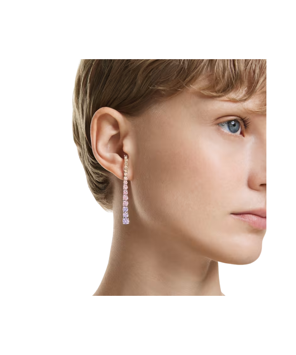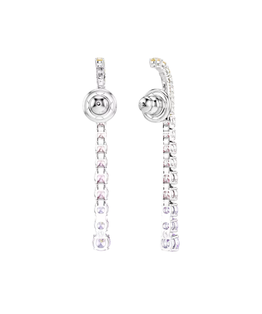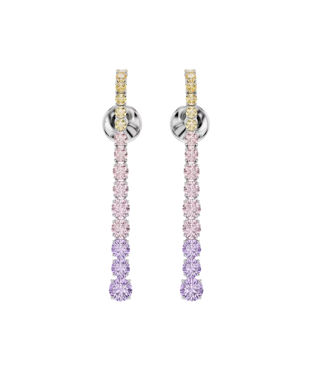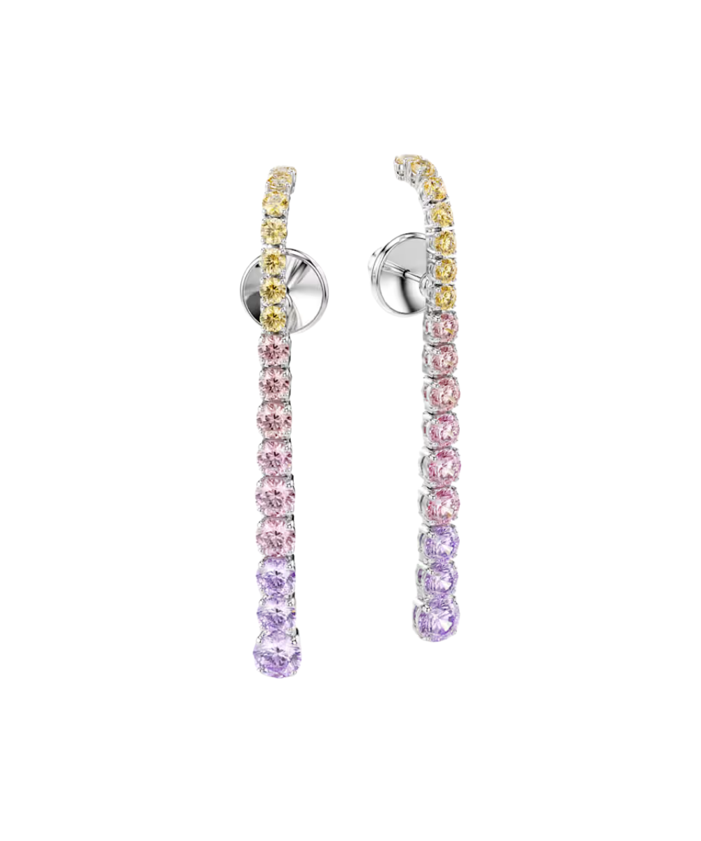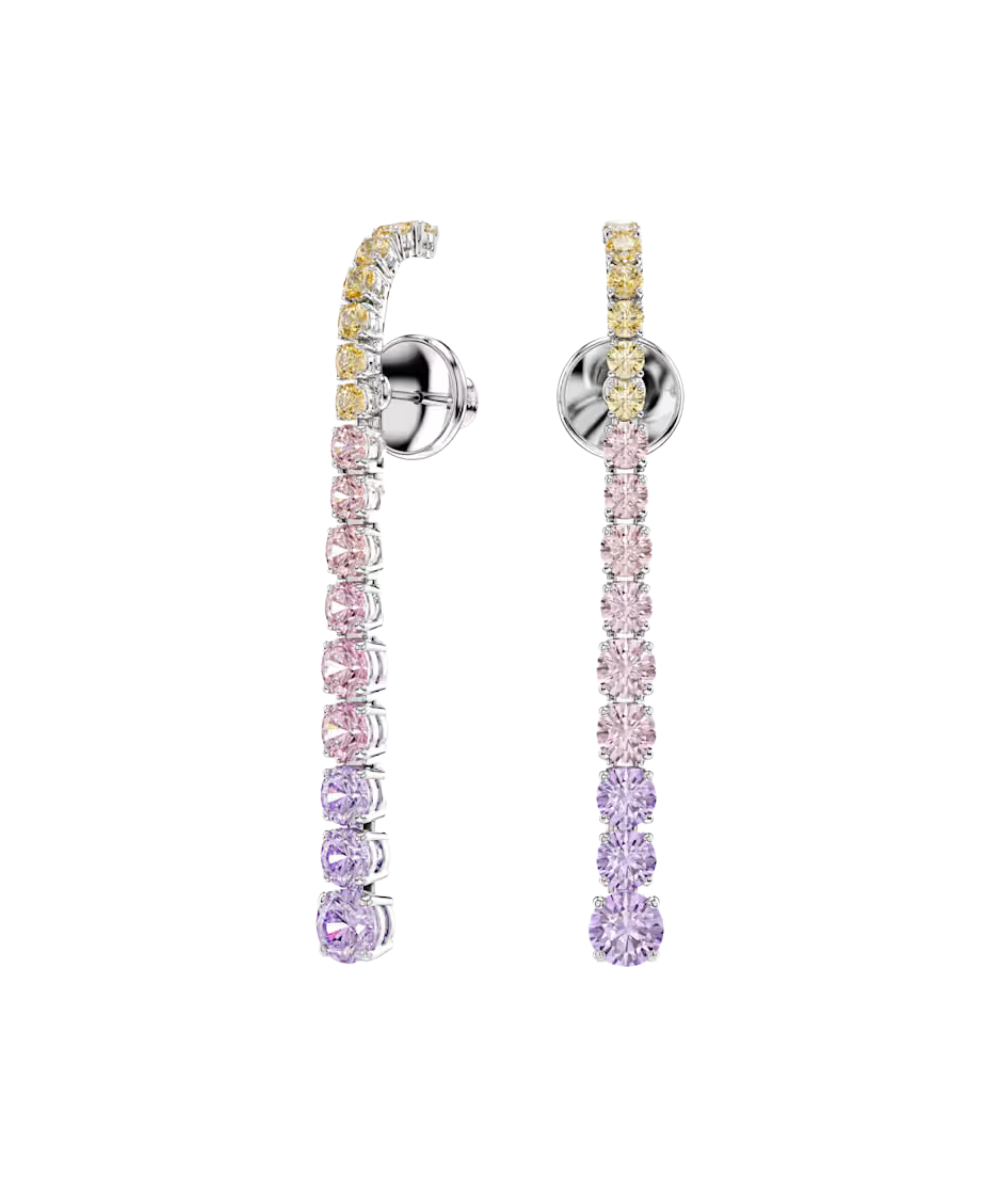 These Matrix tennis earrings give classic elegance an injection of pastel color. Each rhodium plated piece displays a glowing strand of crystals, presented in a gradient of round cut sizes in pink, purple, and yellow shades. To maximize the style effect, these dangling earrings can be paired with the matching necklace or bracelet.
