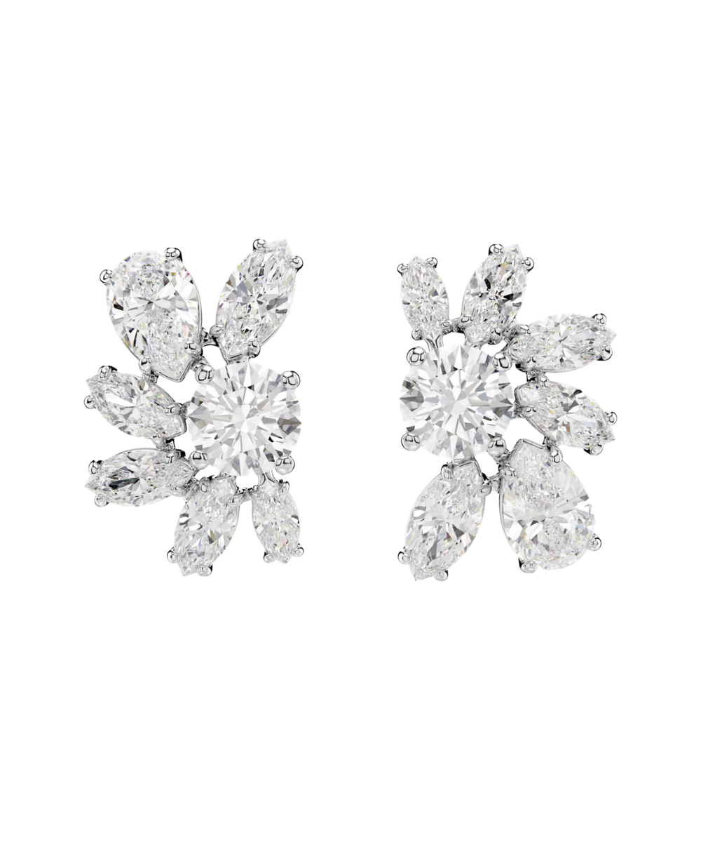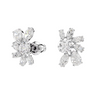 Two halves are better than one with these intriguing earrings. Designed with an artful mix of clear stones in a refined double prong setting with rhodium plating, each piece forms one half of a flower motif. Wear them paired with other pieces from the Gema family.