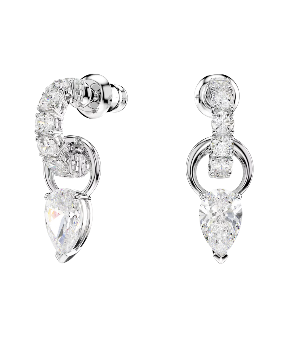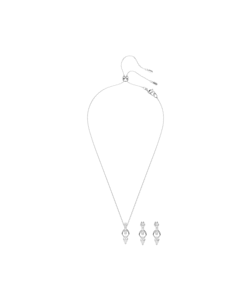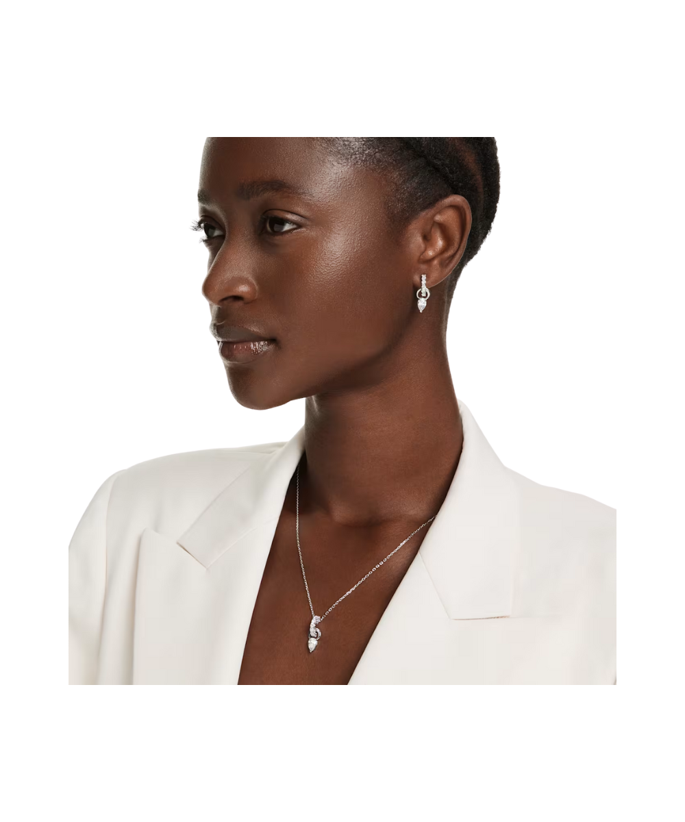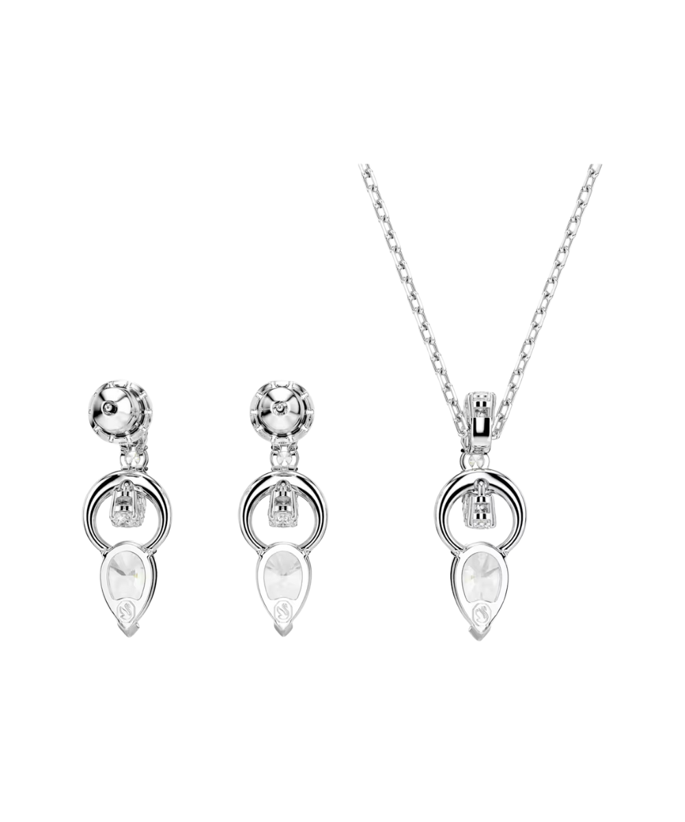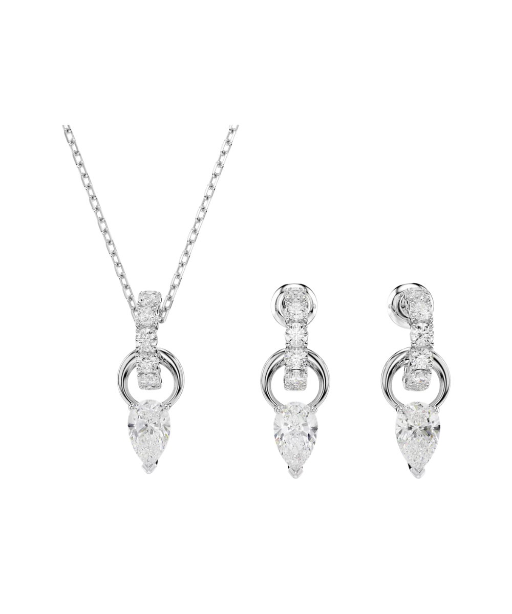 Give your style a coordinated look of radiance with this pendant and earrings set. Each shimmering motif features a pear-cut Swarovski Zirconia on a small hoop, which is connected to another rhodium plated hoop embellished with round-cut Swarovski Zirconia. On the pendant, a sliding mechanism on the chain allows for an easy length adjustment.