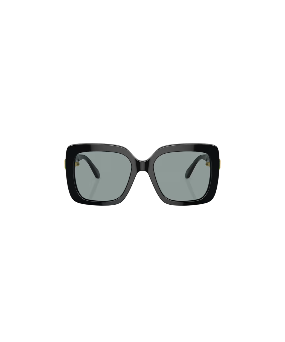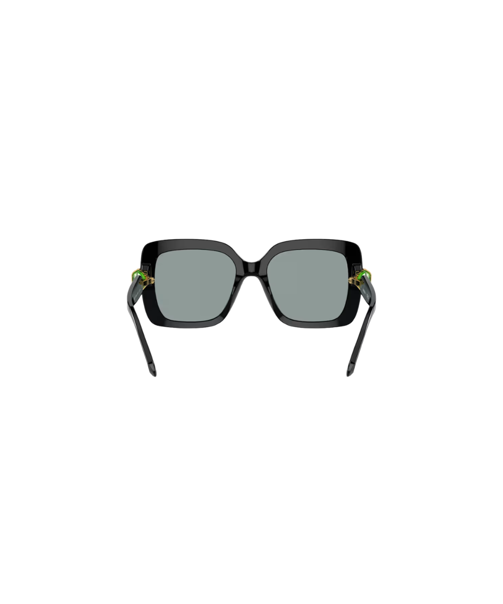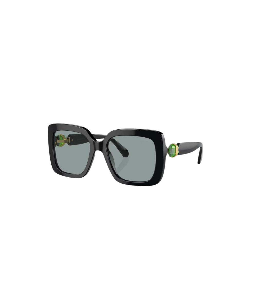 Go for a look of exaggerated chic with these wondrous square-shape sunglasses. The design is inspired by our bold Lucent family and features black acetate frames with dark grey lenses and hinged octagon-cut green crystals on each temple. Gold-tone accents around the stones elevate the luxury. Add this audacious look to your wardrobe and face the day with confidence.