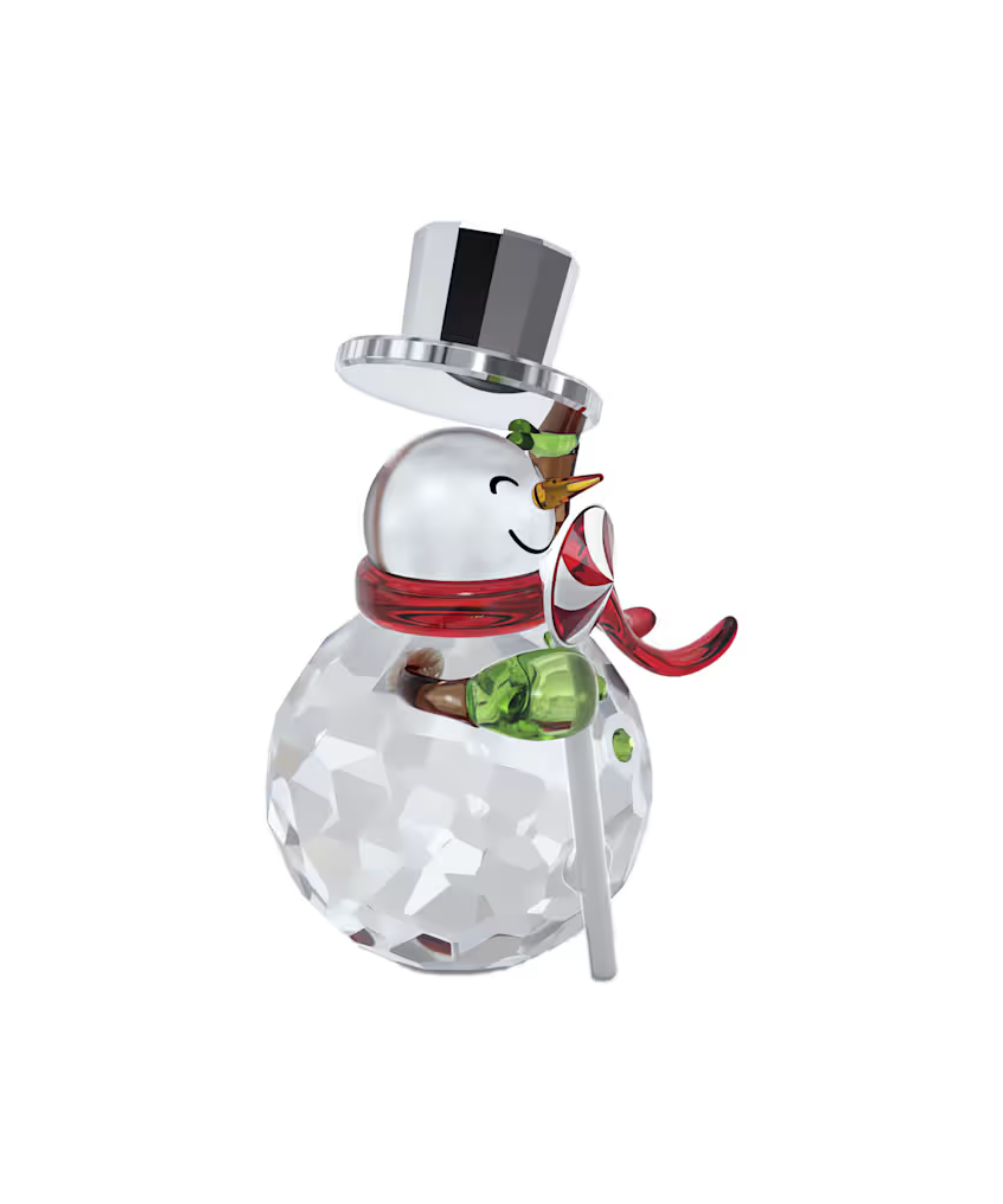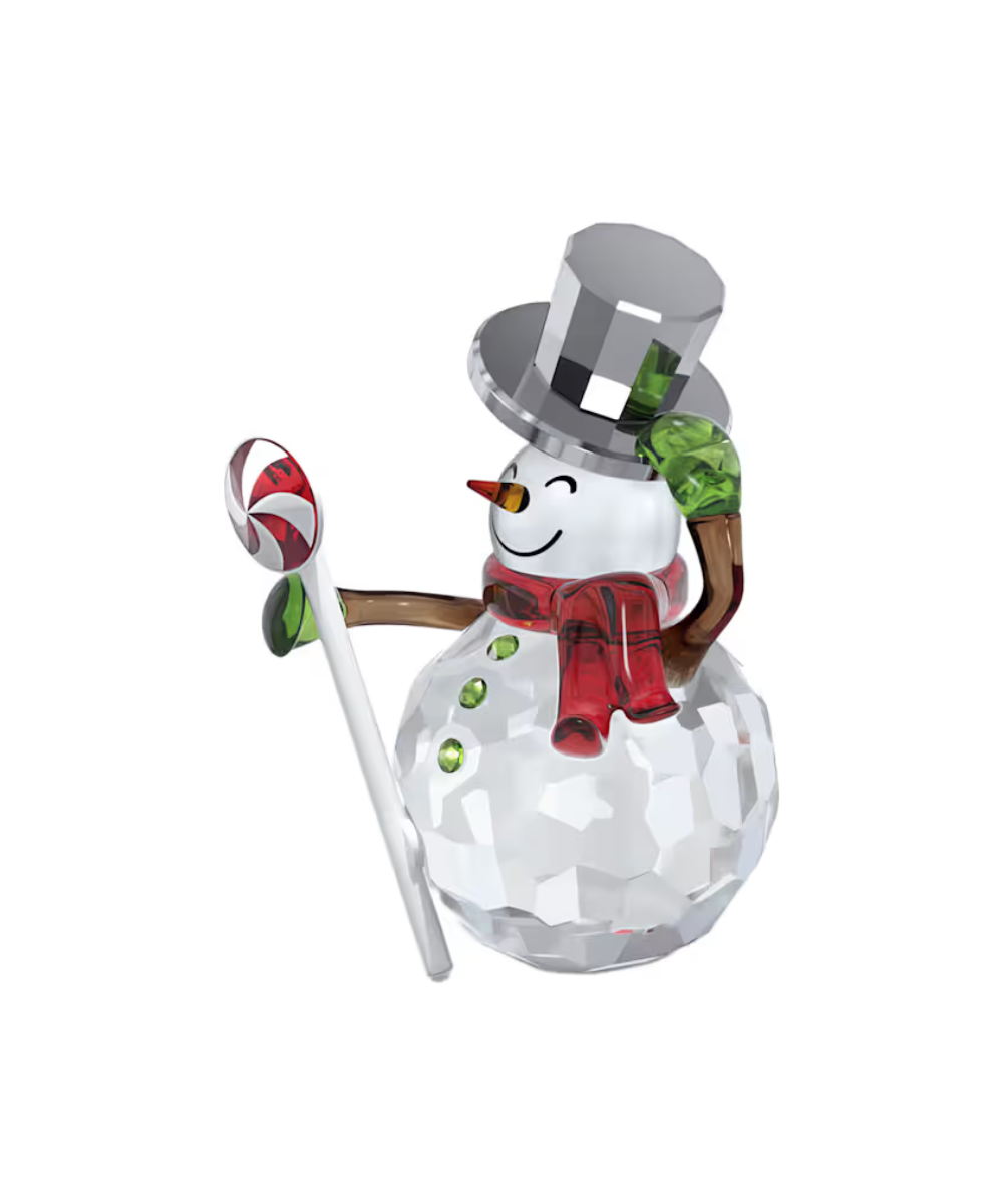 With a tip of his hat, this jolly snowman figurine welcomes in the festive season. The heart-melting design is crafted with 239 facets and features charming details, such as his cozy scarf and lollipop. The crystallized hat has a chrome effect, while metal accents have a lacquered white finish. An adorable piece that will bring seasonal joy to your home. Decoration object. Not a toy. Not suitable for children under 15.