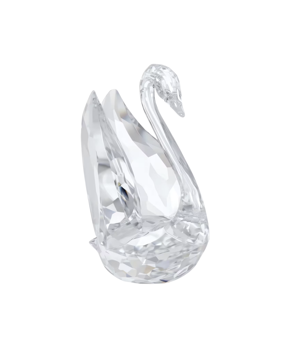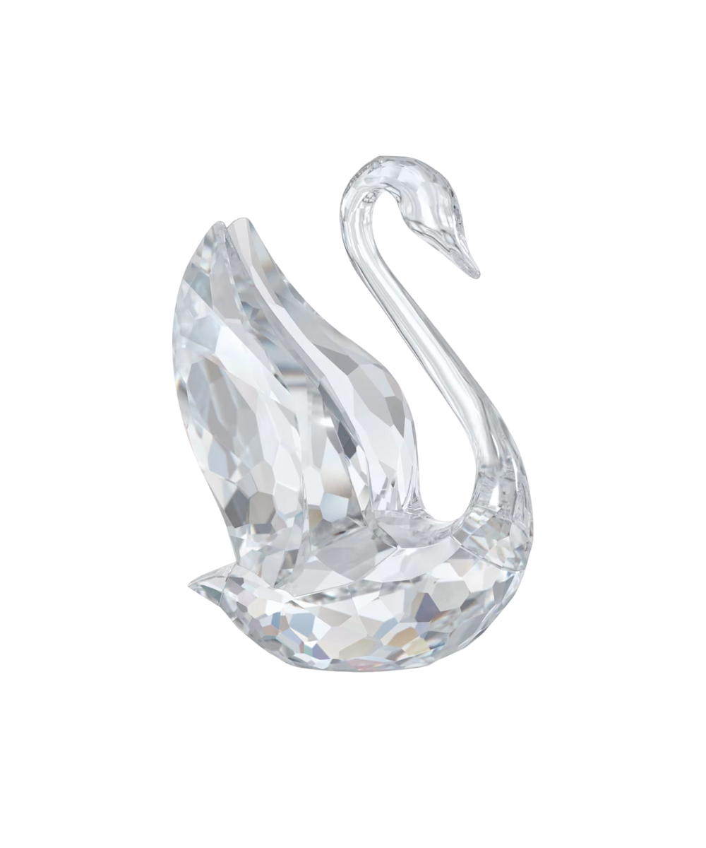 This large decoration piece is inspired by the new Swarovski Swan logo. Designed by Martin Zendron, it is crafted purely from clear crystal with 349 facets, with the Swan's head and neck shaped to form an elegant 'S' for Swarovski. Looking towards the future, with its wings lifted and ready for take-off, this impressive design celebrates the brand's unique craftsmanship and heritage in a modern and sophisticated way. Decoration object. Not a toy. Not suitable for children under 15.