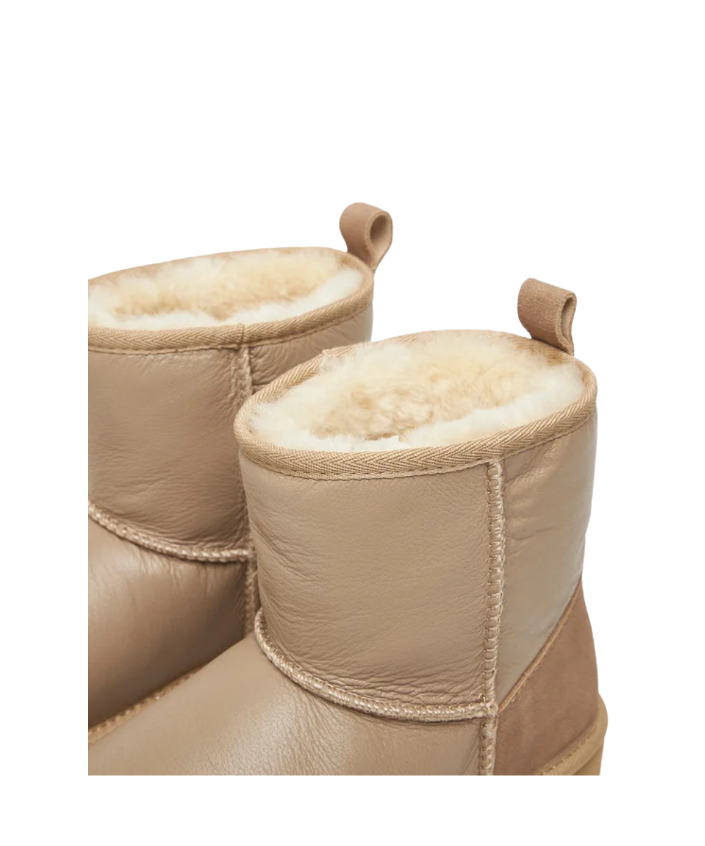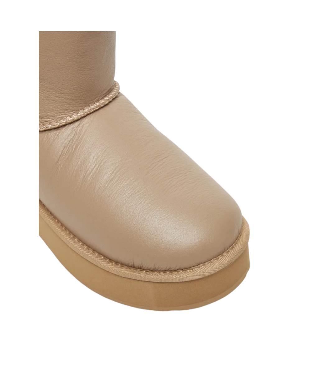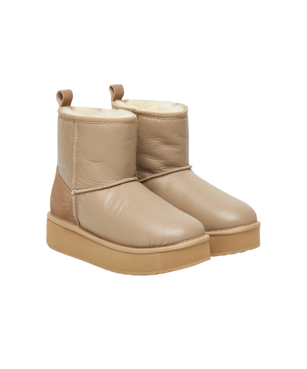Classic comfort, reimagined in leather. This water-resistant mini boot wraps your feet in soft Australian sheepskin and smooth leather for a look that’s as polished as it is practical. The platform sole adds a modern edge (and a little extra height), while the sheepskin lining keeps things warm and breathable. It’s your favourite winter go-to, just with a little more attitude.