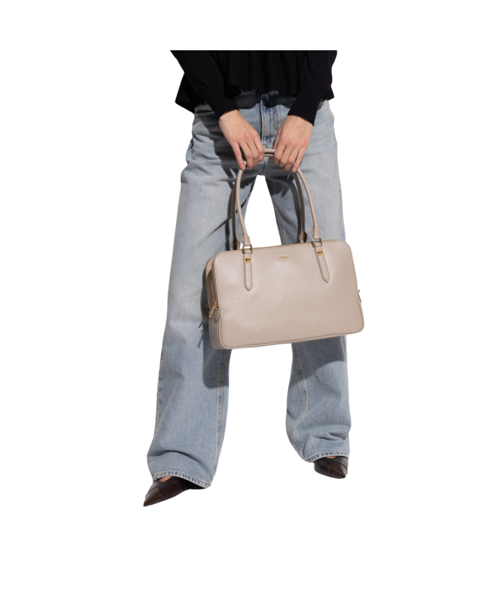 The Furla Giulia Large Shoulder Bag epitomizes Italian craftsmanship and refined elegance. This timeless accessory features a classic rectangular silhouette with gently rounded corners, crafted from supple leather with a subtle grain that adds depth and character. The creamy hue offers exceptional versatility, seamlessly complementing any wardrobe. Understated gold hardware—including polished buckles and a smooth zipper—provides sophisticated detailing without overwhelming the design. Dual handles, generously proportioned for comfort, transition effortlessly from hand-carry to shoulder wear. Measuring 23cm in height, 35.5cm at its widest point, and 13cm across the base, this structured silhouette balances capacity with refined proportion. An investment piece that transcends seasonal trends.