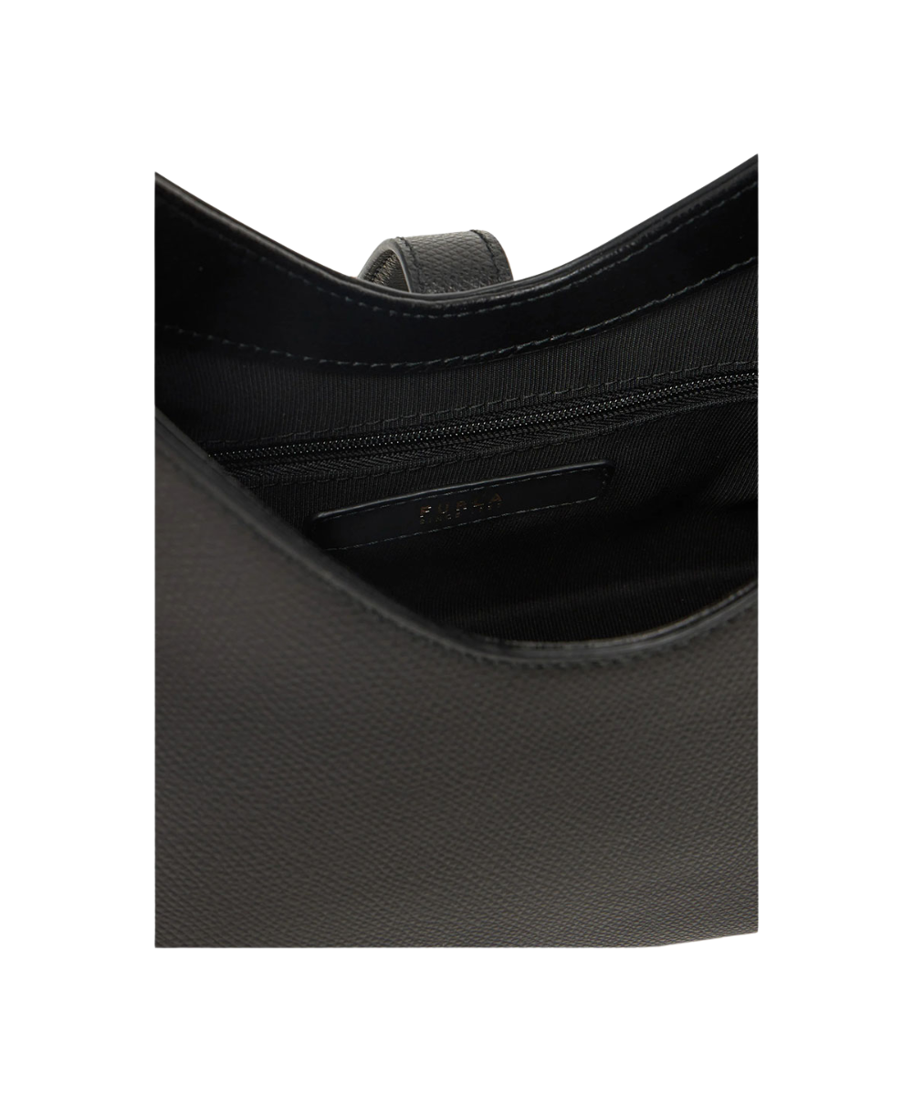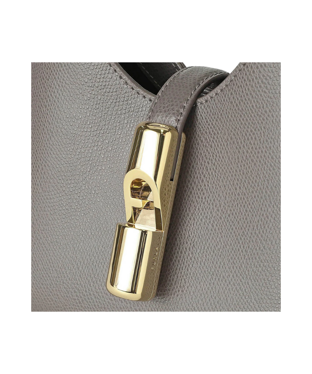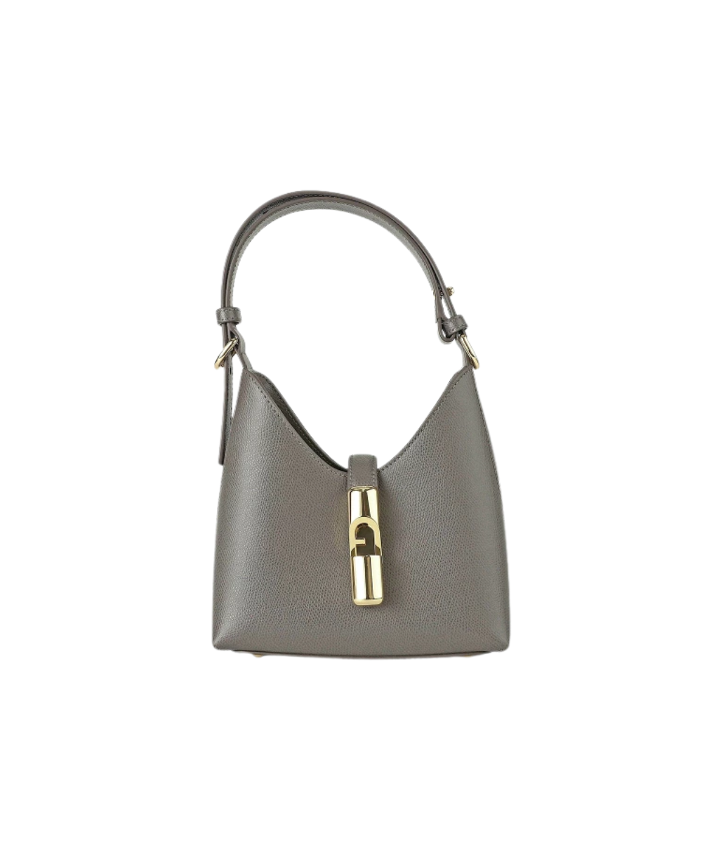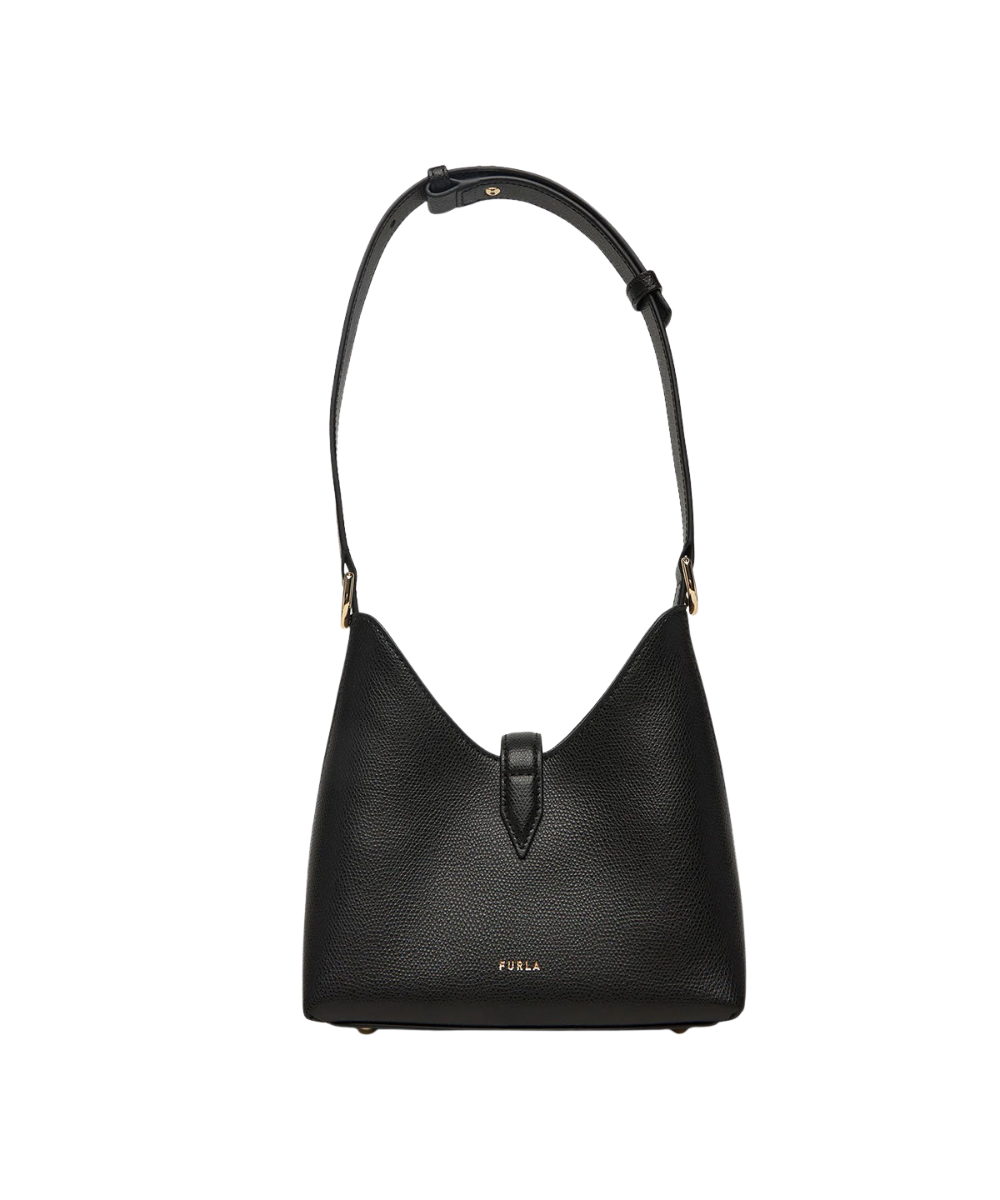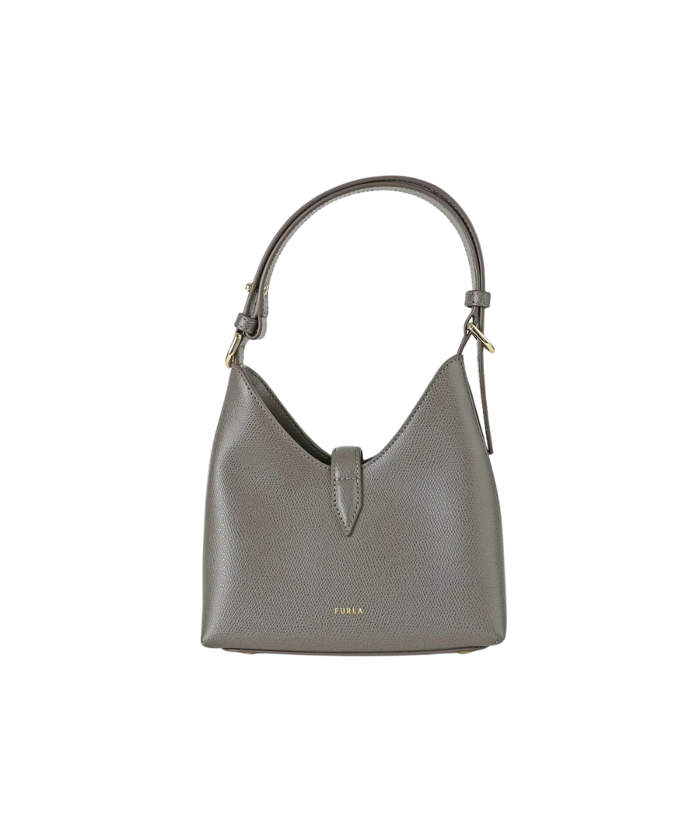 The Furla Iride Mini Hobo Bag combines elegance with practical design. Crafted from grained leather, it features polished gold-coloured metal fittings and protective metal feet to maintain its pristine appearance. The adjustable handle offers a comfortable drop of 27-33 cm, while the deployment buckle ensures secure closure. Inside, a plain polyester lining reveals a spacious main compartment and a zip pocket for organized storage. Compact yet functional, its dimensions are approximately 18 x 12 x 10 cm, making it an ideal refined accessory for everyday sophistication.