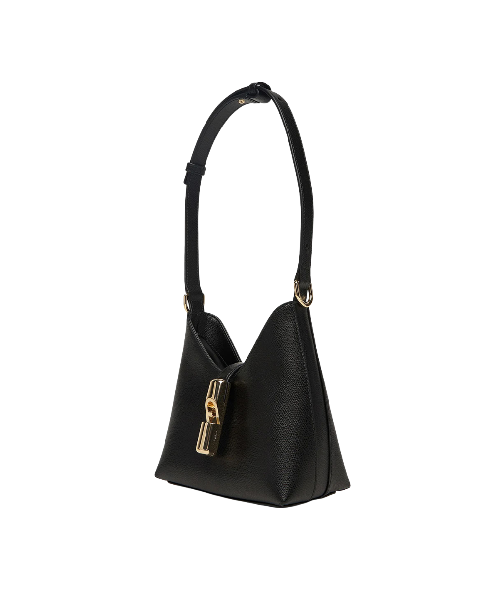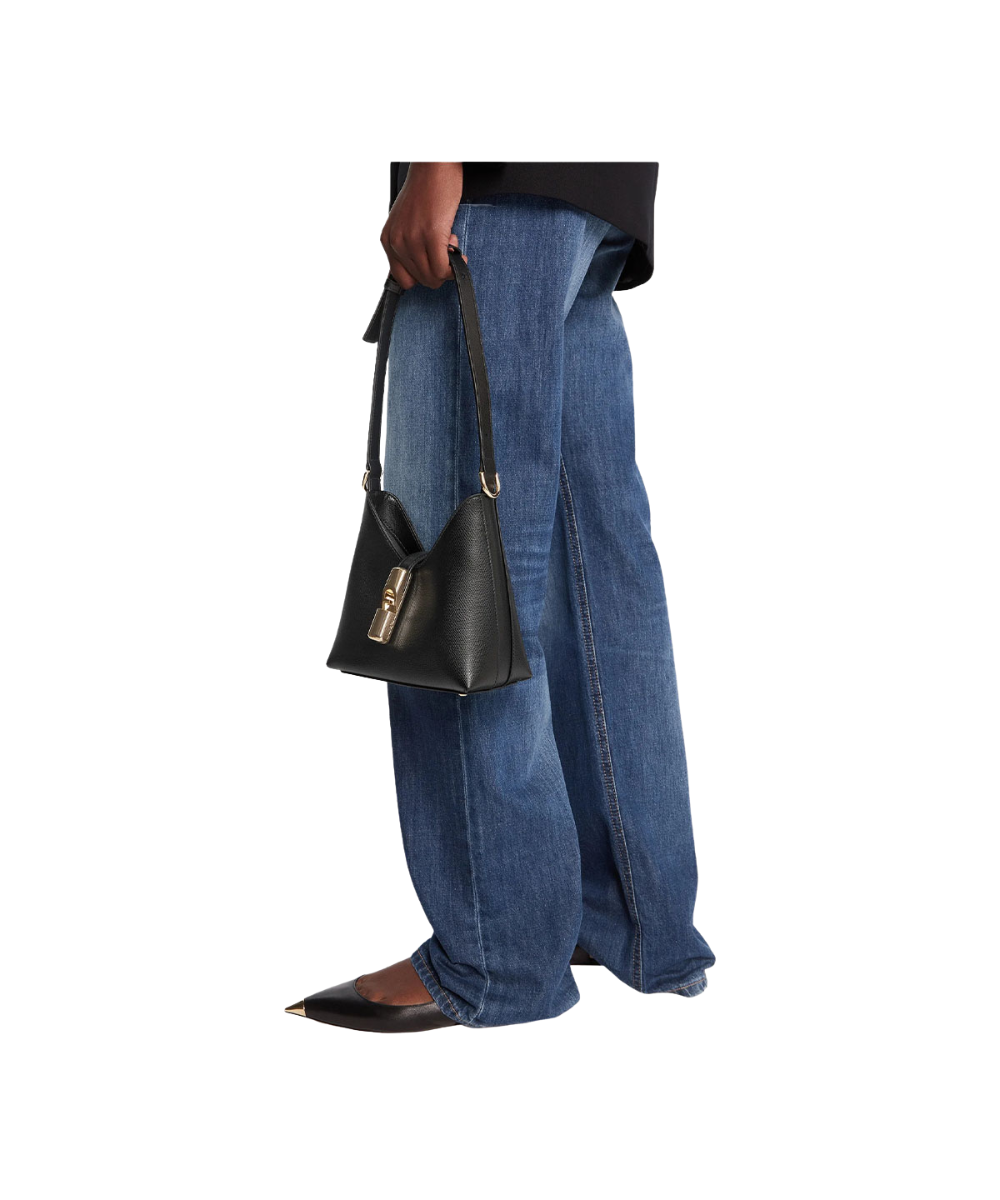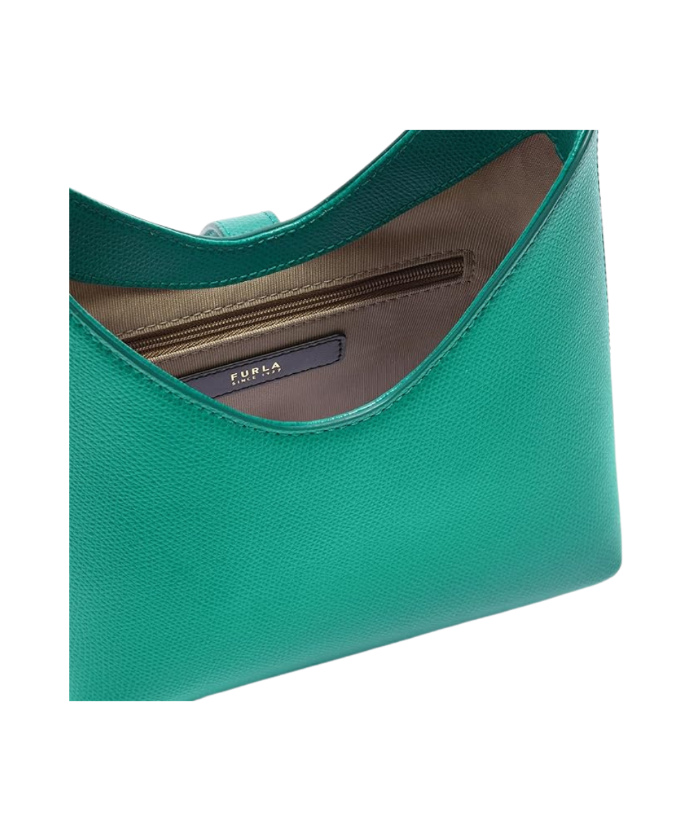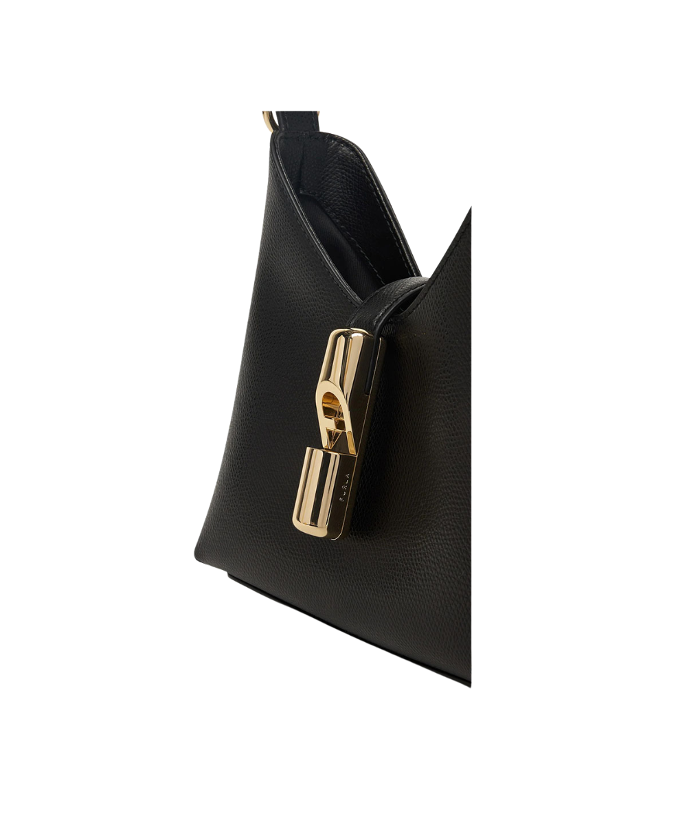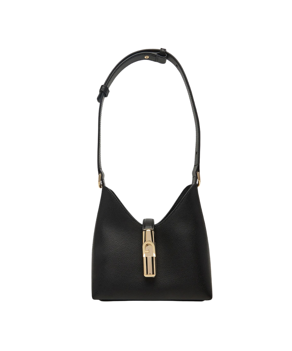 The Furla Iride Mini Hobo Bag combines elegance with practical design. Crafted from grained leather, it features polished gold-coloured metal fittings and protective metal feet to maintain its pristine appearance. The adjustable handle offers a comfortable drop of 27-33 cm, while the deployment buckle ensures secure closure. Inside, a plain polyester lining reveals a spacious main compartment and a zip pocket for organized storage. Compact yet functional, its dimensions are approximately 18 x 12 x 10 cm, making it an ideal refined accessory for everyday sophistication.
