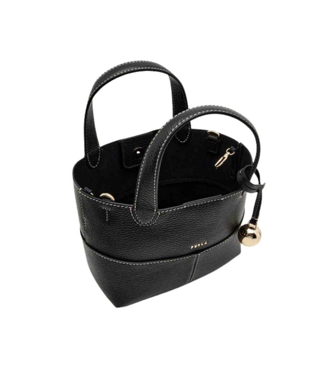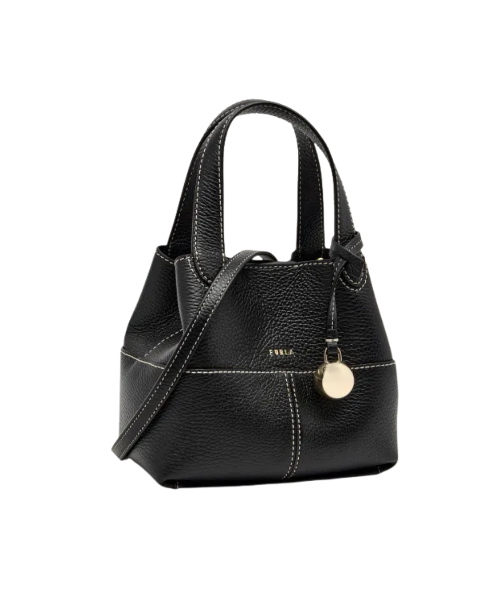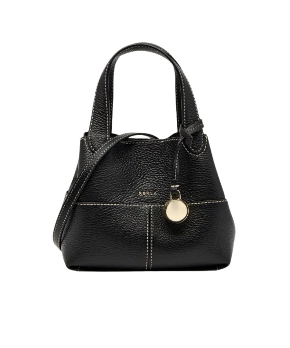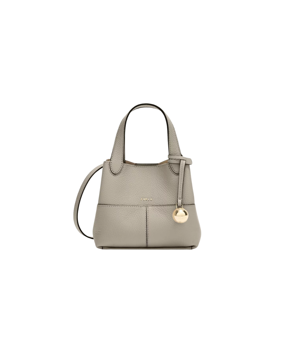 The Furla Primrose Mini Bowling Bag, crafted from soft, textured leather, presents a refined three-dimensional silhouette elevated by a signature "Sfera" charm engraved with the brand logo. Its compact design features two handles and an adjustable, detachable shoulder strap for adaptable wear. Inside, an open layout secured by a magnetic strap with snap hooks shaped like the iconic arch logo ensures your essentials remain elegantly organized. Measuring 20cm by 16cm by 7.5cm and weighing 530g, this bag combines sophistication with practicality for the modern woman.