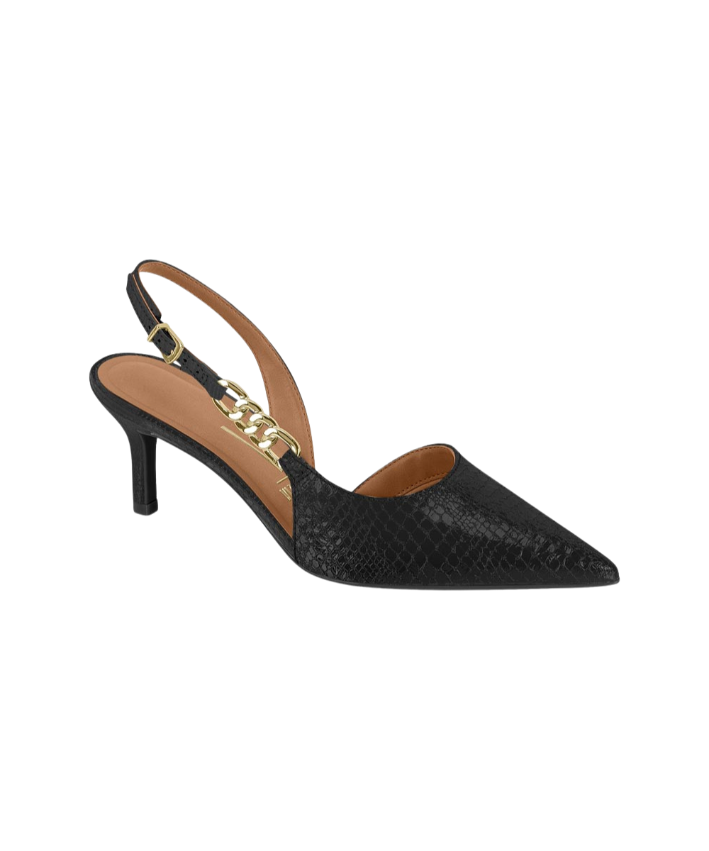 Sophisticated and versatile, this textured slingback heel showcases a sleek pointed toe and refined mid heel for an elegant silhouette. The striking gold chain detail elevates the design with understated luxury, while the adjustable buckle strap guarantees a secure, personalized fit. Perfect for transitioning seamlessly from professional settings to evening occasions, this timeless piece is an essential addition to any discerning wardrobe.