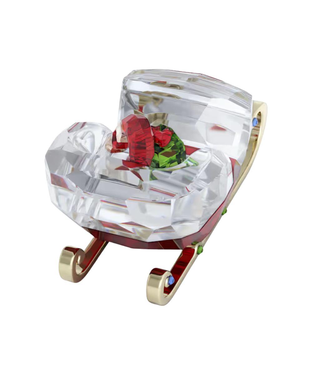 Bring the magic of the holidays into your home with this enchanting Santa sleigh. The red and white figurine is crafted with 489 facets and is decorated with individual crystals in green and blue. Extra special detailing includes the skids in champagne gold-tone metal, as well as the candy cane featuring Swarovski’s Golden Shadow effect. Direct from the night sky, this magical sleigh can be combined with the elf, santa, and gift ornaments to create a joyous scene. Decoration object. Not a toy. Not suitable for children under 15.