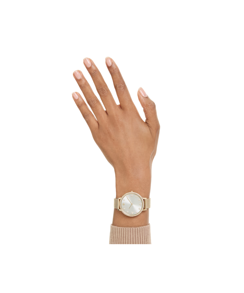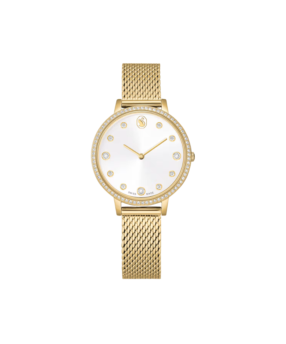 This sleek Clarica watch is distinguished by its signature Milanese bracelet, which delivers a striking mesh style around the wrist. The 35mm design is crafted in stainless steel with a gold-tone finish and features a perfectly circular bezel set with 73 clear crystals. On the sunray dial, the timepiece reveals 11 crystal indexes and a swan emblem at 12 o’clock. This Swiss Made watch is water-resistant to 50m and offers a classic choice for everyday luxury.