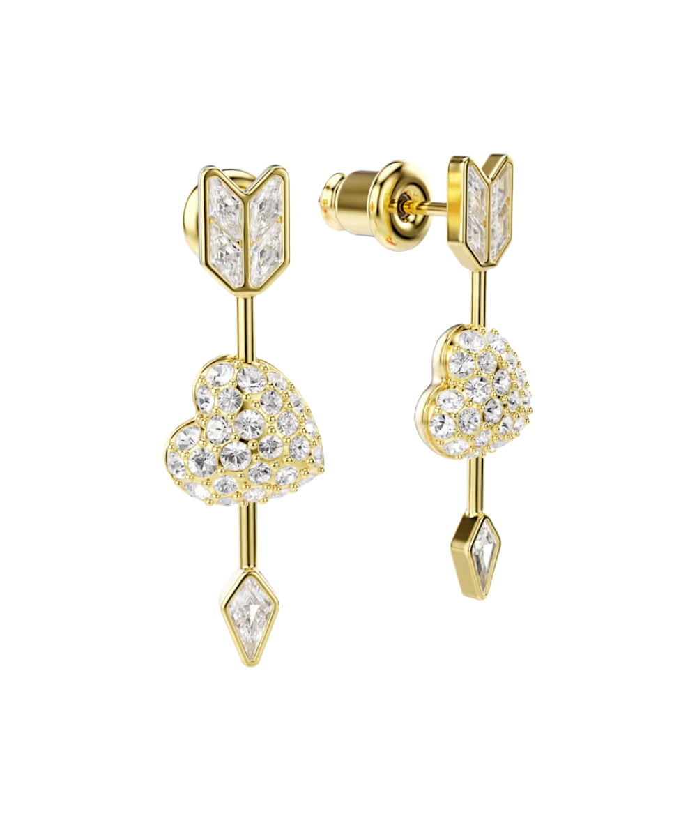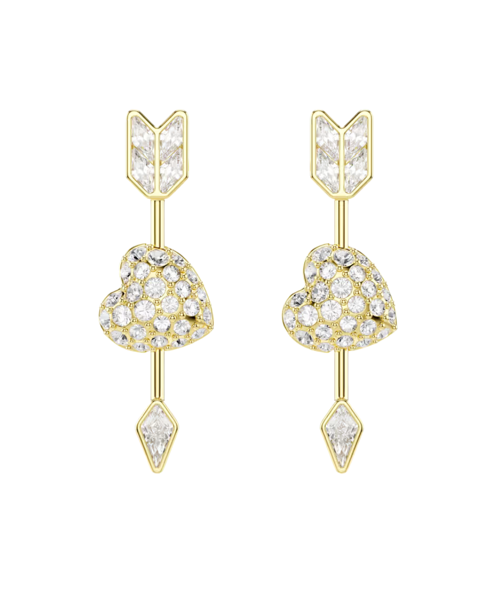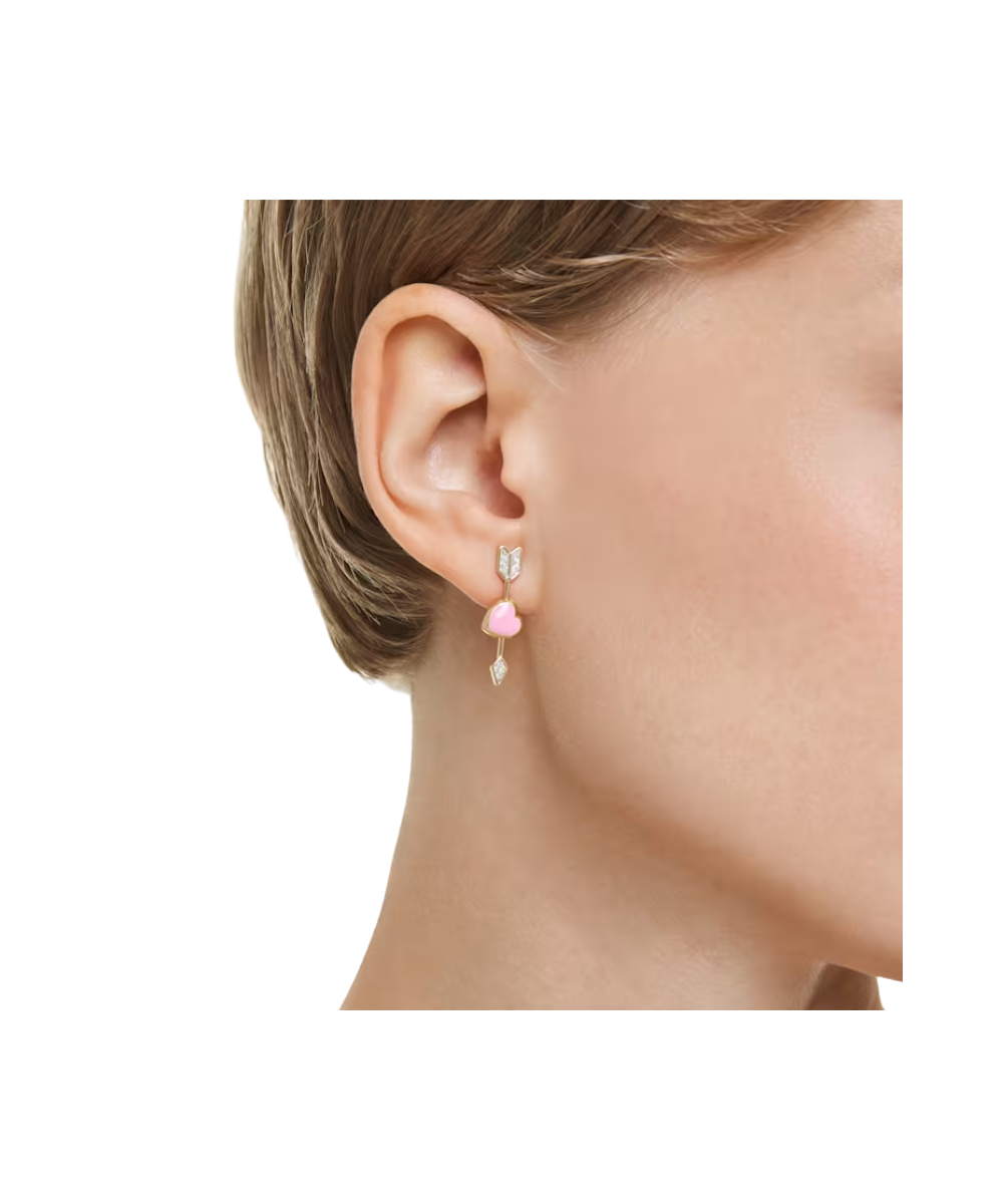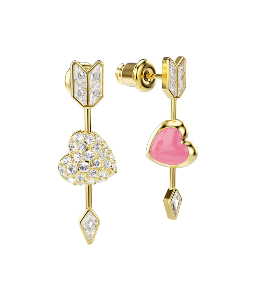 Cupid strikes twice in these expressive Idyllia earrings. Each gold-tone plated piece features a love heart pierced by an arrow, with glittering clear crystals on one side, and a vivid pink color on the other side. Reverse them as often as you like for versatile styling options.