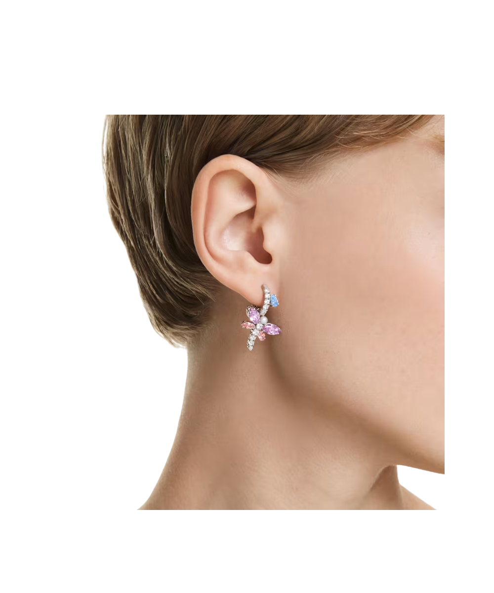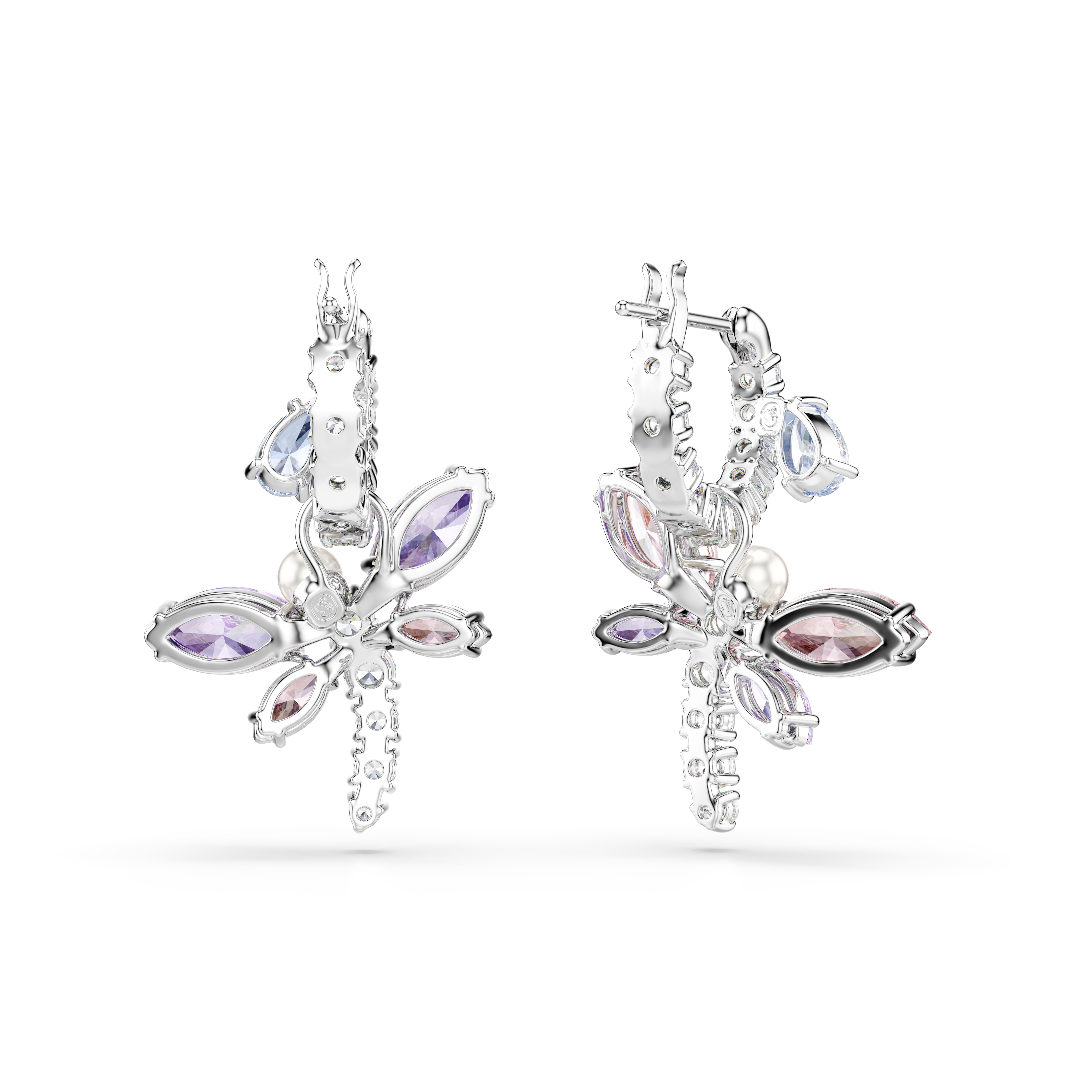 Make your own style transformation with these bright dragonfly earrings. Connected to pavé hoops, each dragonfly is paved in clear Swarvoski Zirconia and features a single Swarovski Crystal Pearl positioned at the head. For pastel-colored joy, the wings of the dragonfly reveal pink and purple shades, which alternate on each side. A magical and colorful choice for your everyday looks.