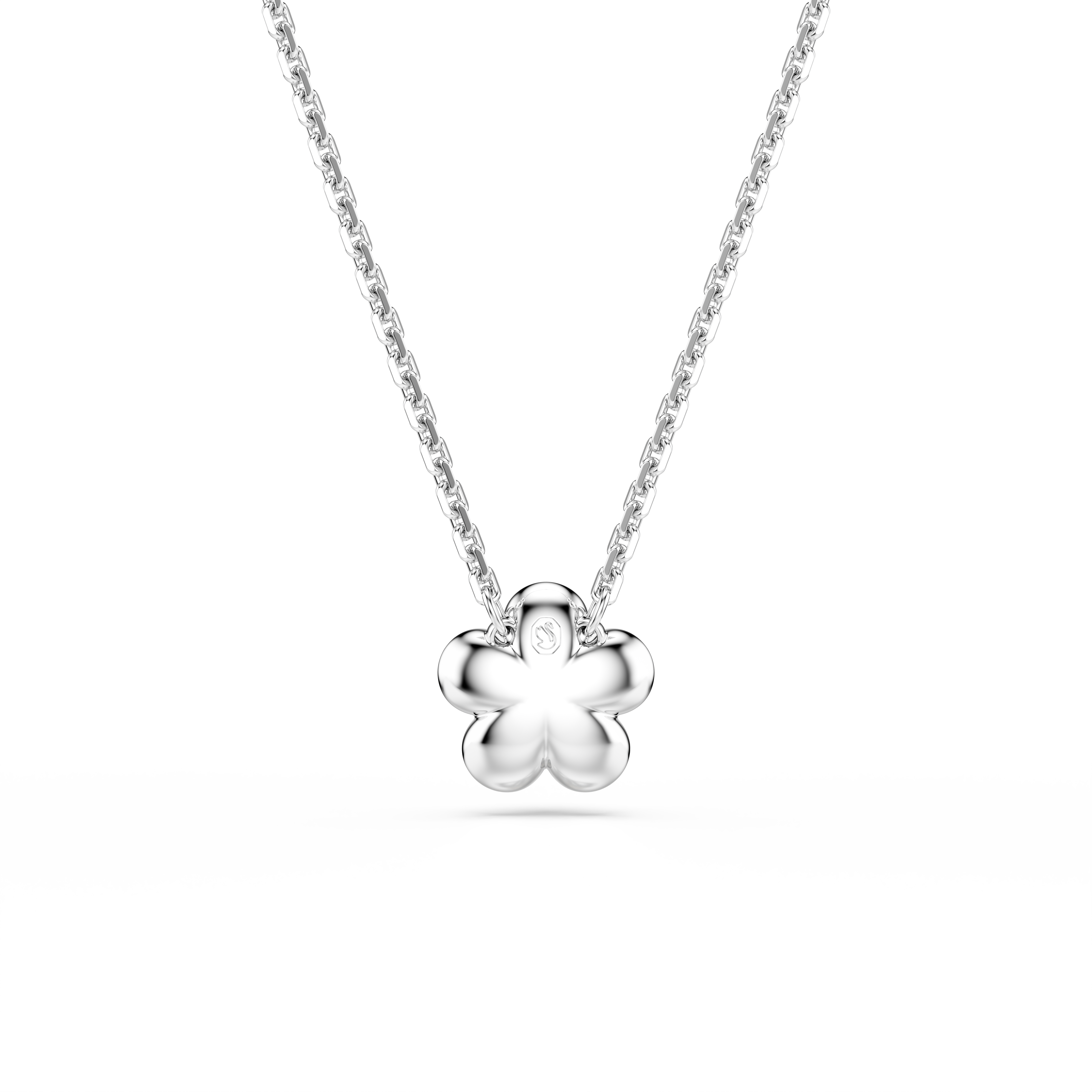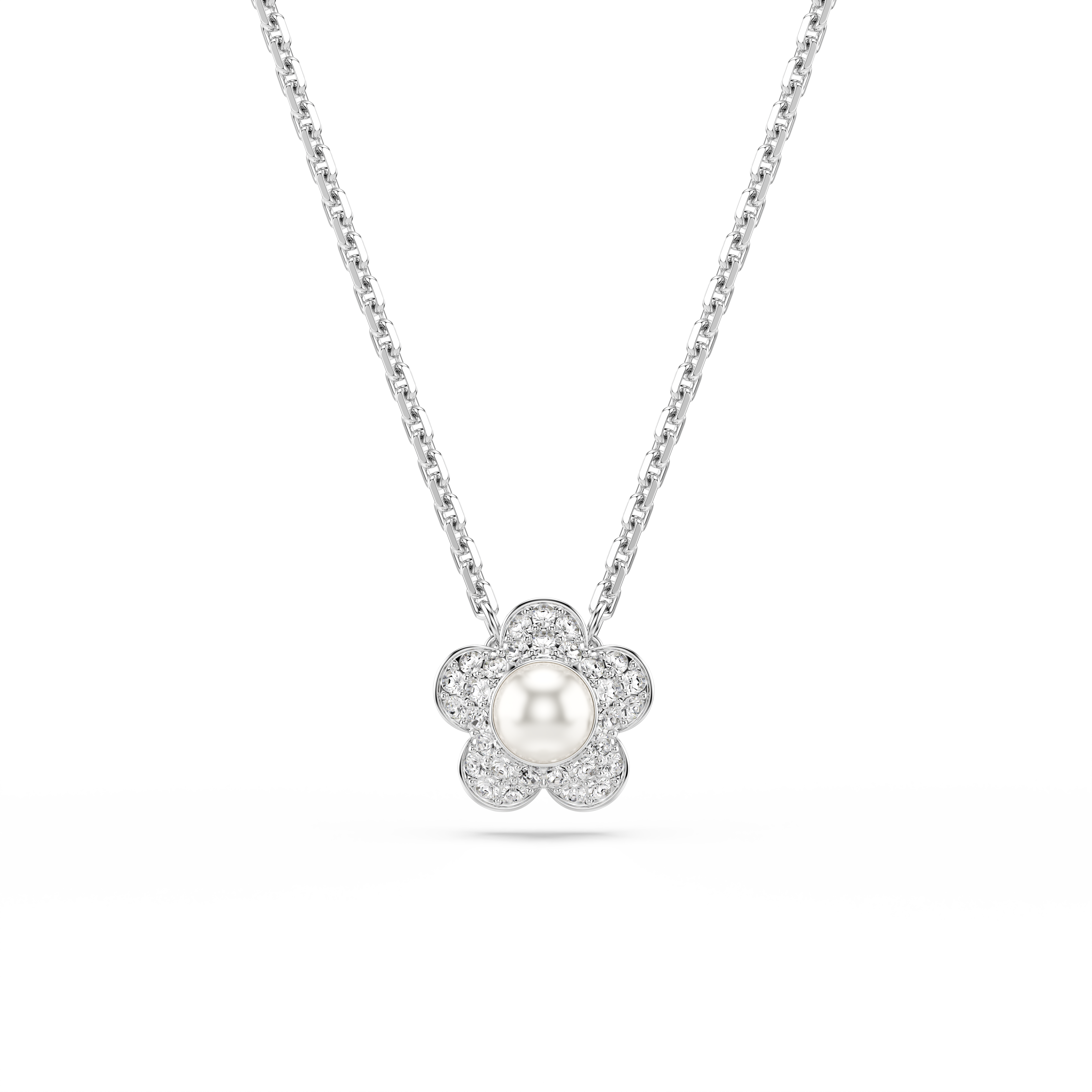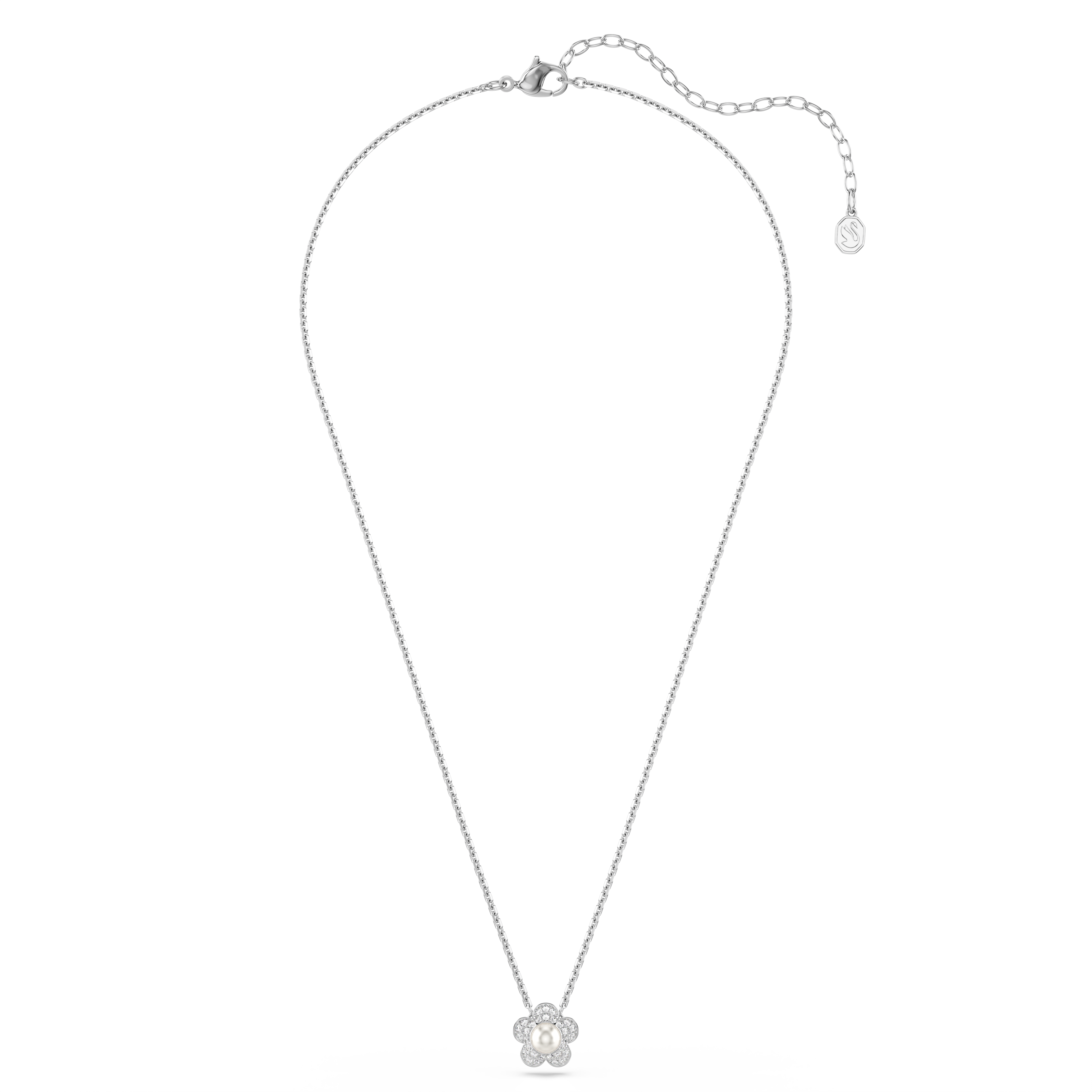 In a gentle tribute to nature, this rhodium plated pendant portrays a delicate flower, made with a crystal center and petals adorned in glittering pavé. Wear it together with the matching studs to give any look a radiant touch of understated luxury.