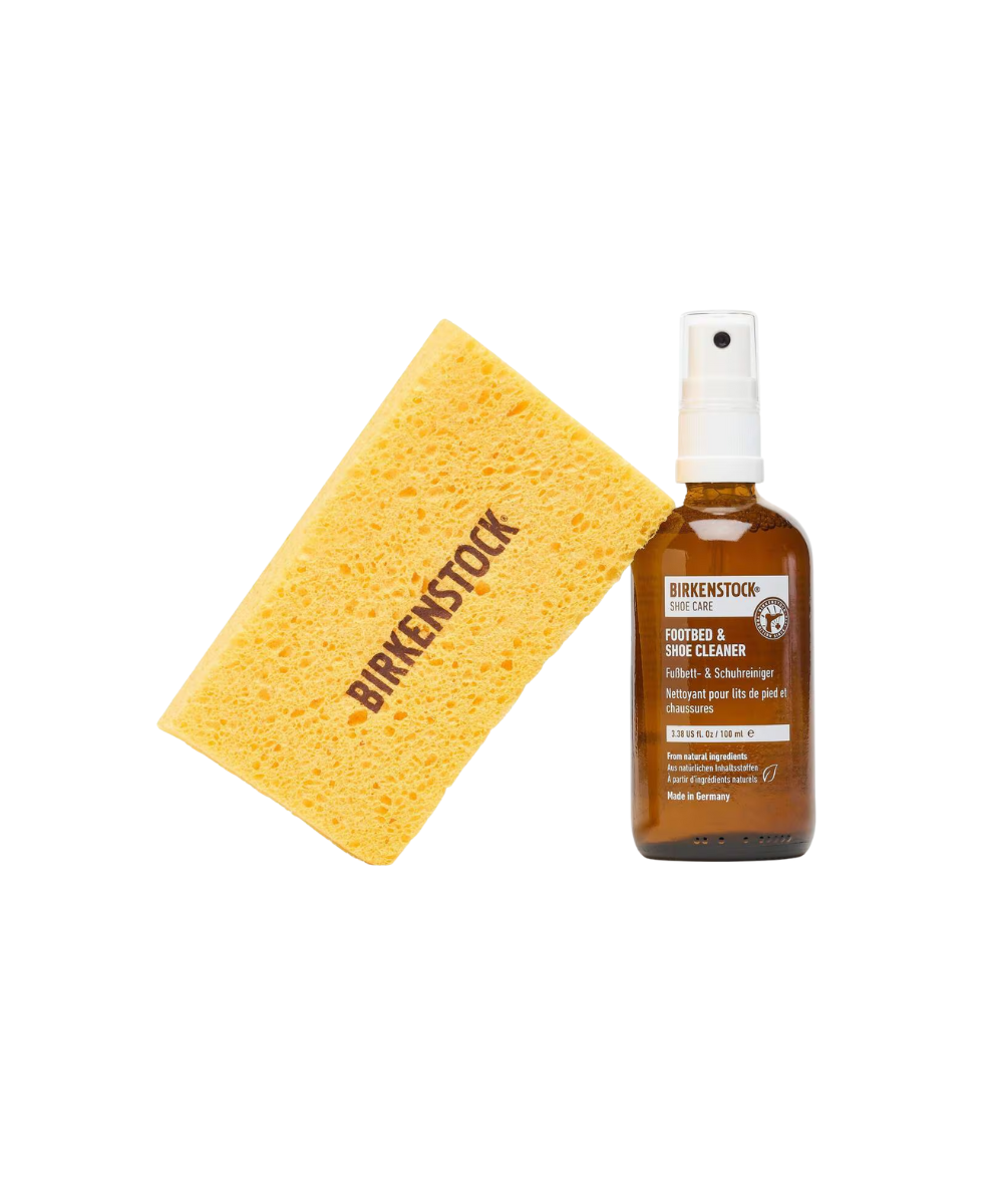 The BIRKENSTOCK® Footbed & Shoe Cleaner helps remove everyday dirt and stains from all materials. To apply: Shake well before use. Prepare a container with lukewarm water. Spray the Cleaner two or three times directly on the damp sponge. Rub in with your hands to form foam and apply to the upper or insole of the shoe. Leave to soak for a short time and then remove the foam with water. Do not hold the shoe under running water; carefully remove any residual foam with the clean sponge. For stubborn stains, soak longer and repeat the process until shoe is clean.