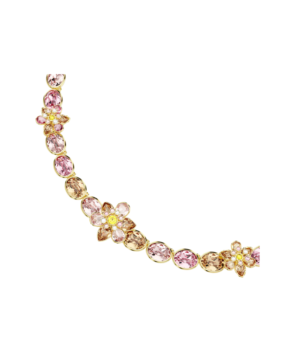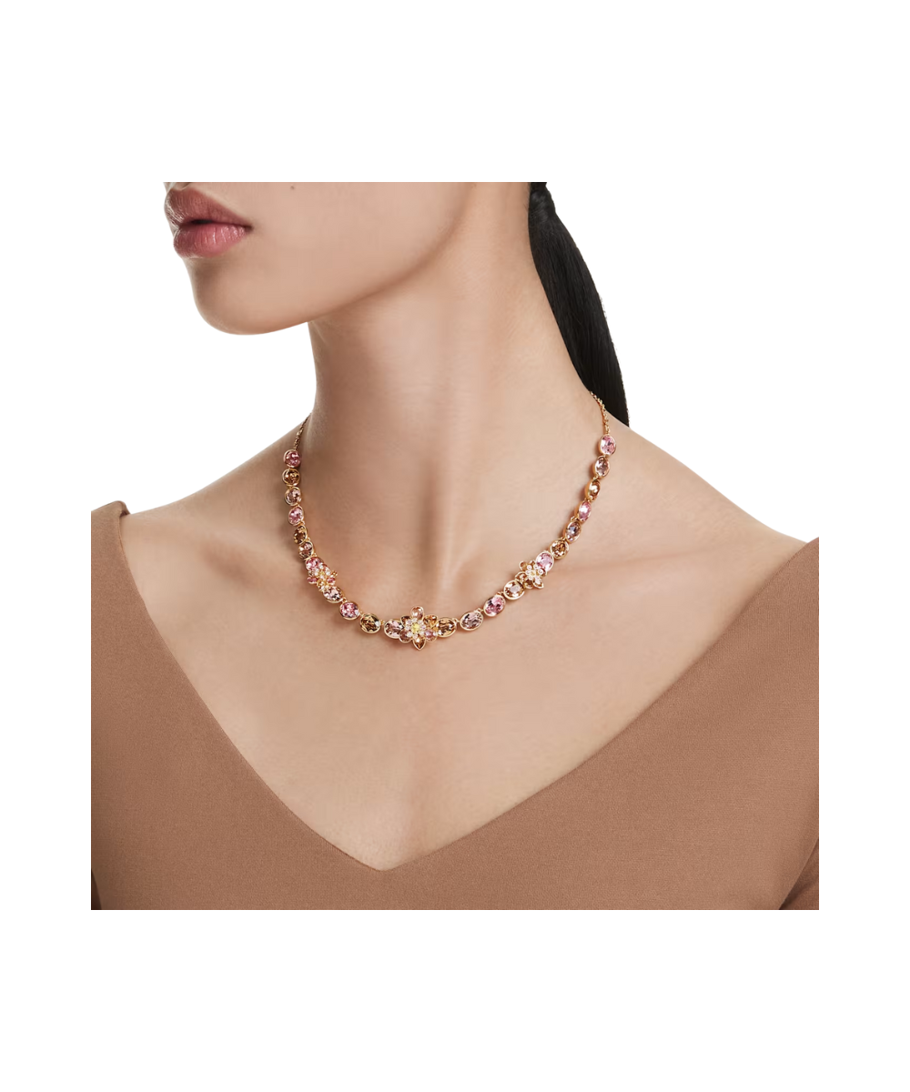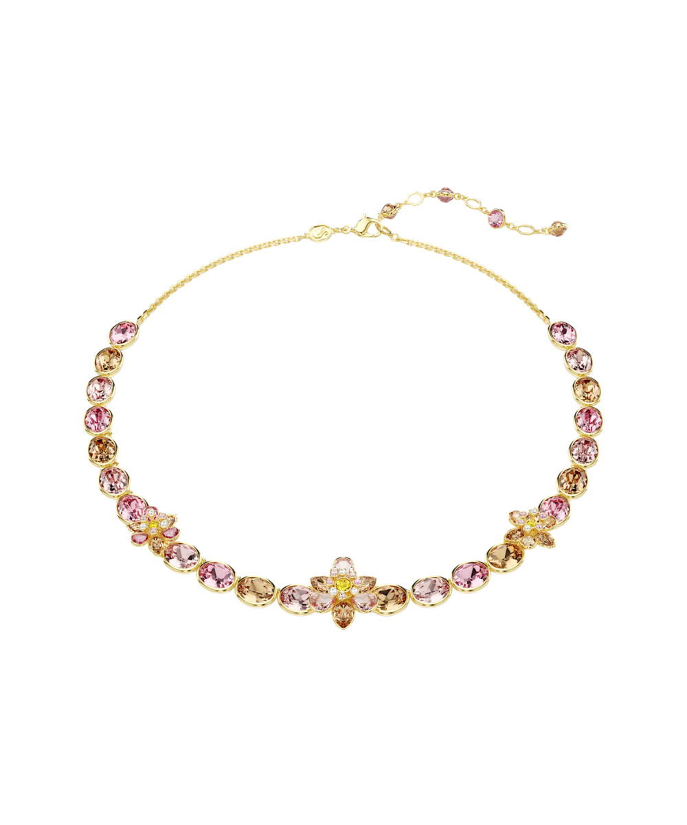 This all-around necklace expresses the joy of nature through a mix of warm colors and floral motifs. The gold-tone plated design features a row of bezel-set oval crystals, beautifully interspersed with flowers, and is finished with a decorated elongation for an adjustable fit. Expressing Swarovski savoir-faire at its finest, this delicate creation matches perfectly with other jewelry pieces from the same family.