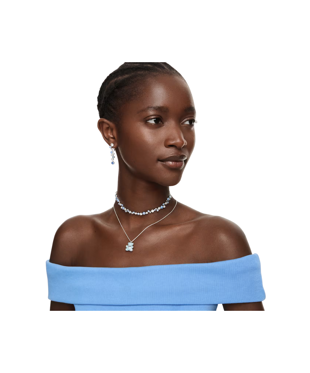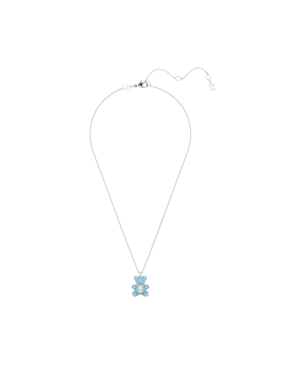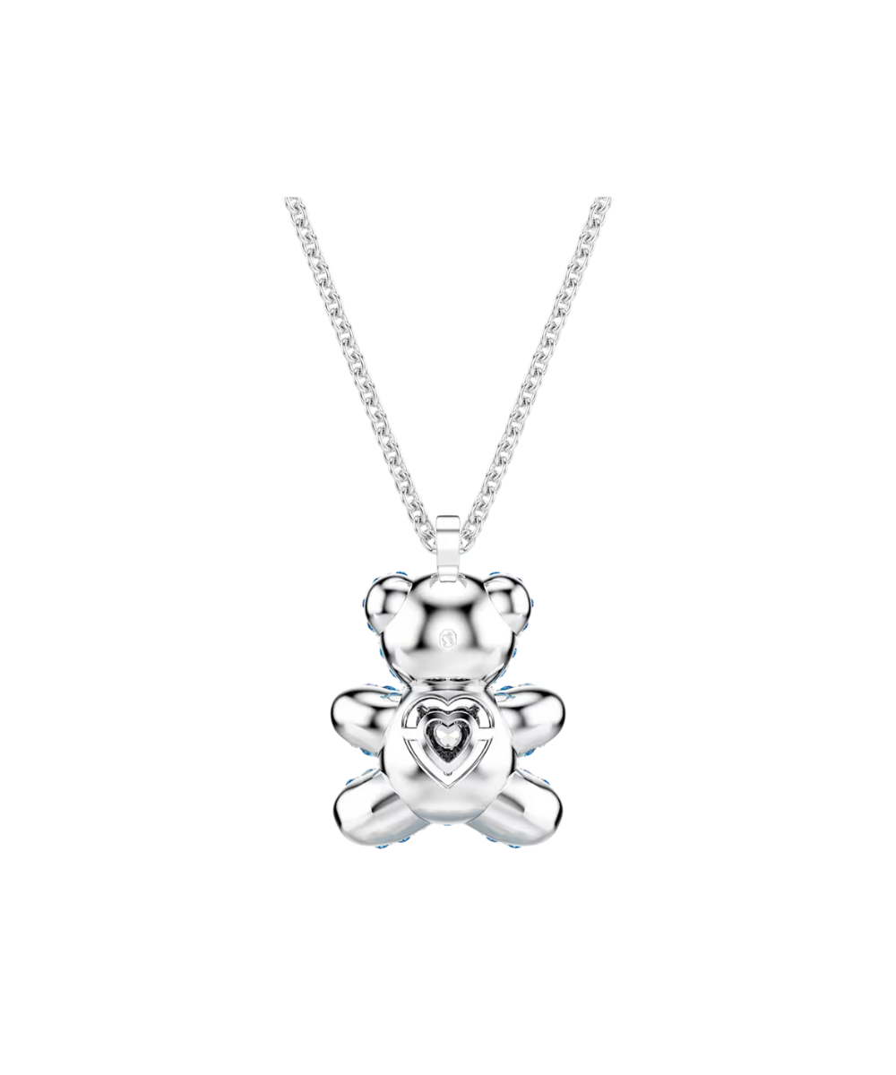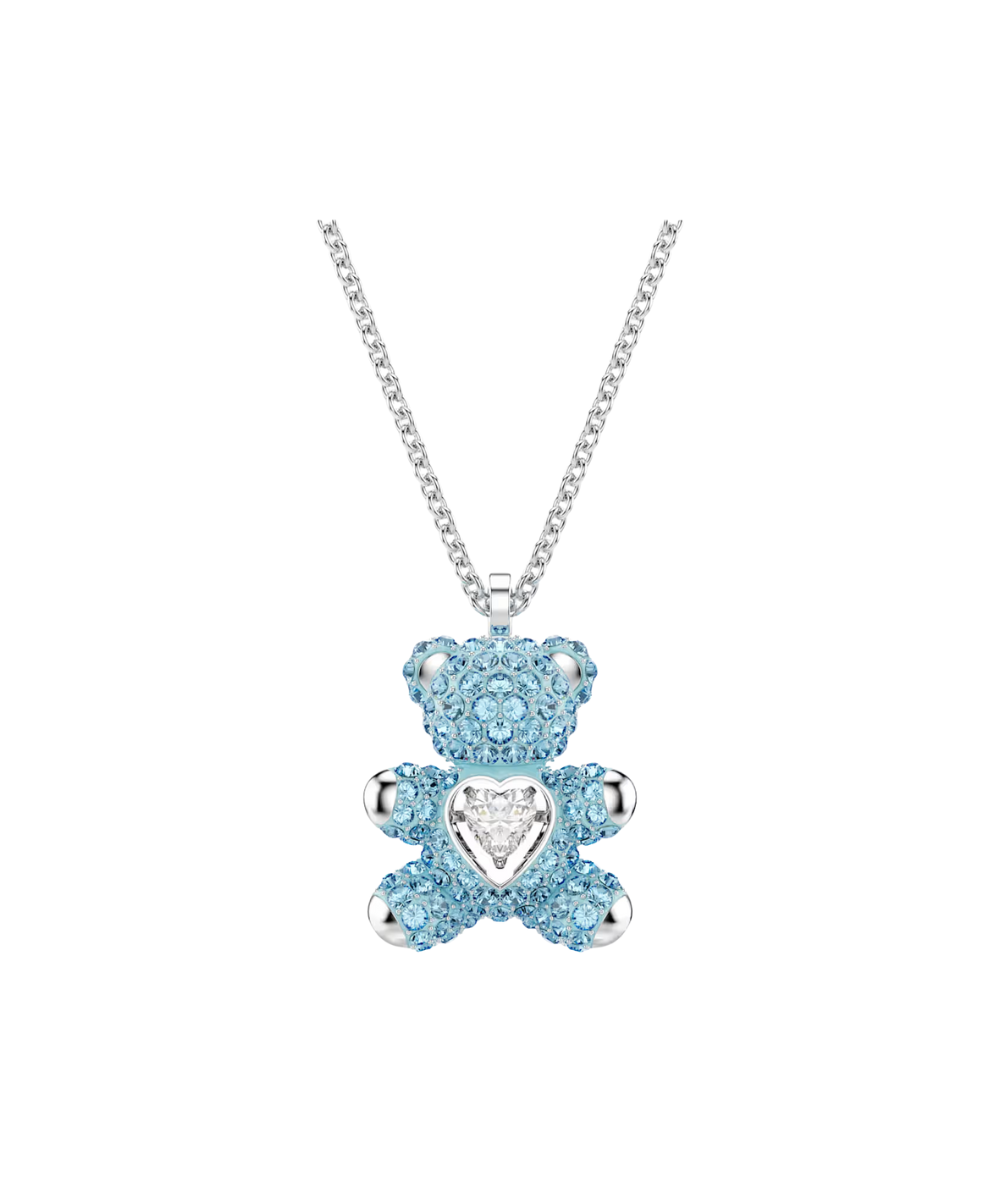 Inspire a smile with this playful pendant. The 3D teddy is covered in blue crystal Pointiage® and holds a heart-shaped dancing stone in a clear tone. Finished with a rhodium plated chain, this unique design encapsulates happiness and love.