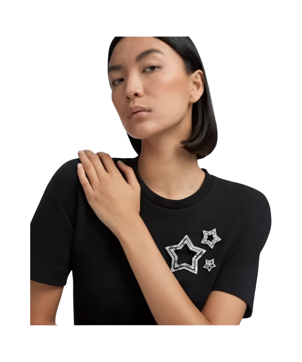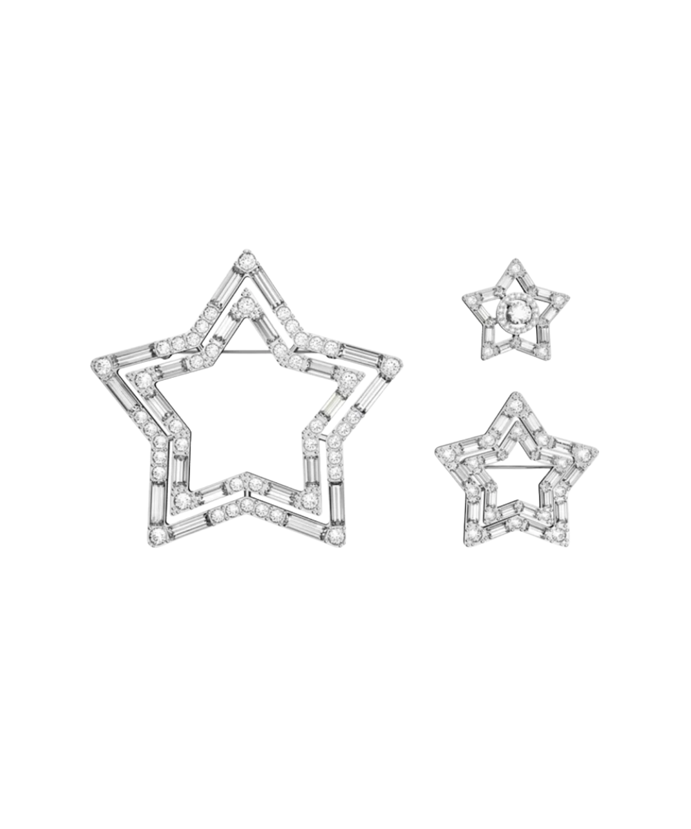 Featuring the iconic star emblem, these stunning brooches come as a set of three. Playing with proportion and light, each piece boasts a mix of round and baguette cut crystals complete with a sleek rhodium plated setting. Style yours on the lapel of a sharp black blazer, wearing one or all three for a statement finish. This brooch set is part of the Stella family, designed by Creative Director Giovanna Engelbert for Collection II.