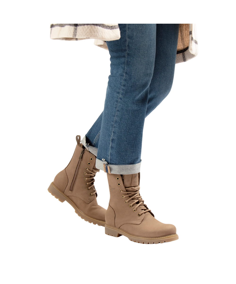 Flat women's Boot. WATERPROOF Taupe Nobuck Leather. Lace and zipper closure. Warm lining. Removable anatomical insole. Natural, flexible and durable rubber sole. Shaft height: 16,5 cm. Heel height: 4 cm. 100% Made in Spain.