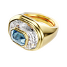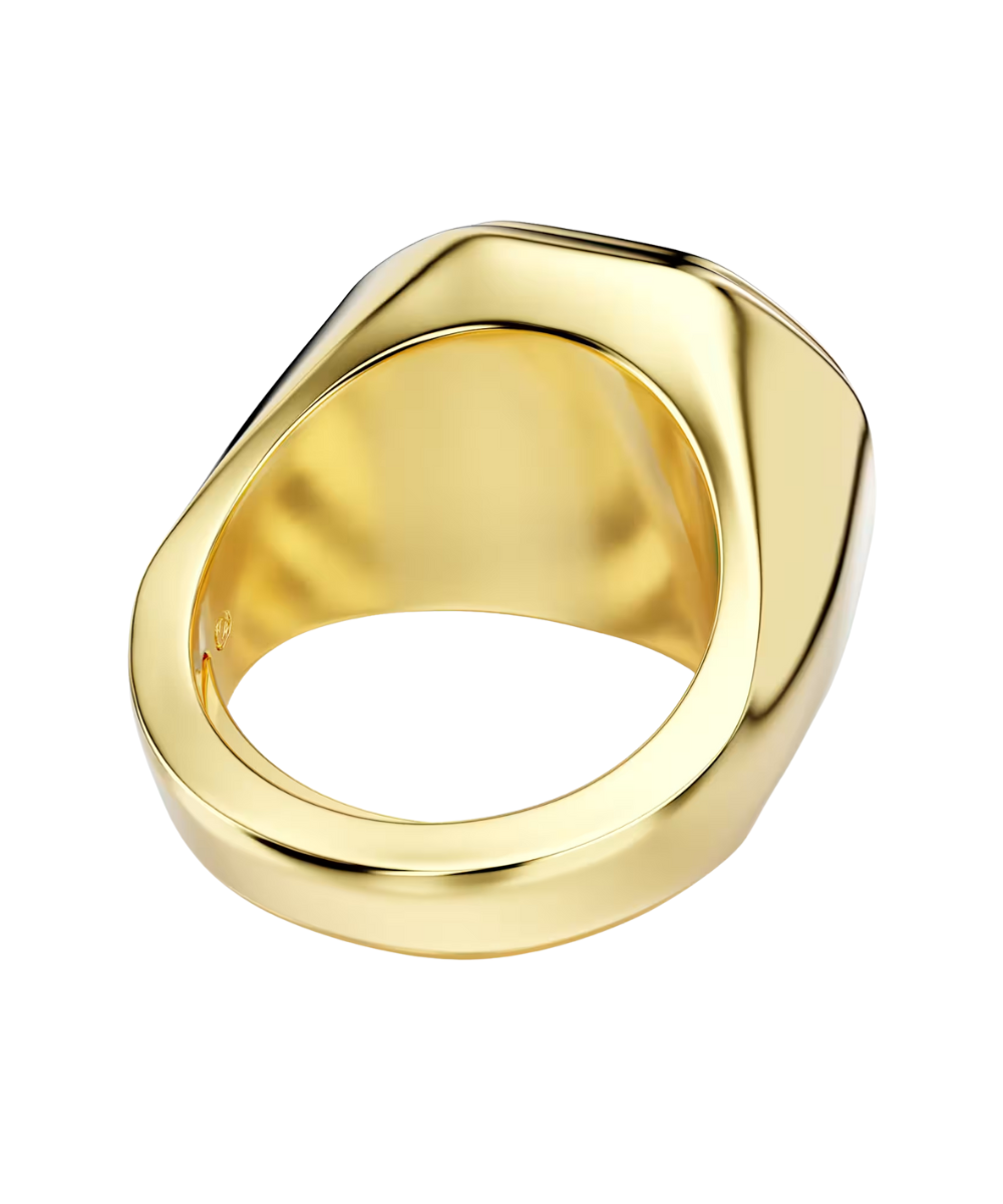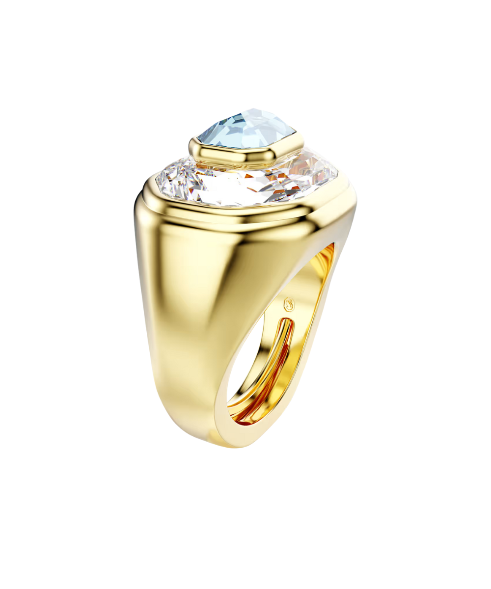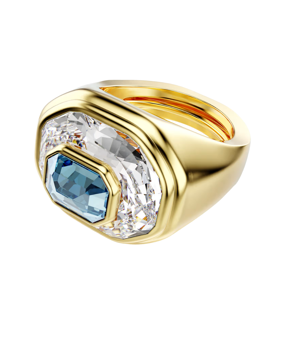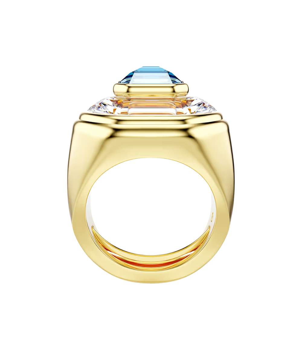 Take on a fearless glow in this creative Chroma ring. The faceted, gold-tone plated band features a central octagon-cut crystal in blue, stacked on top of another clear crystal in a larger size. Combining color with radiance, it's a perfect pop of Swarovski style to energize any outfit.