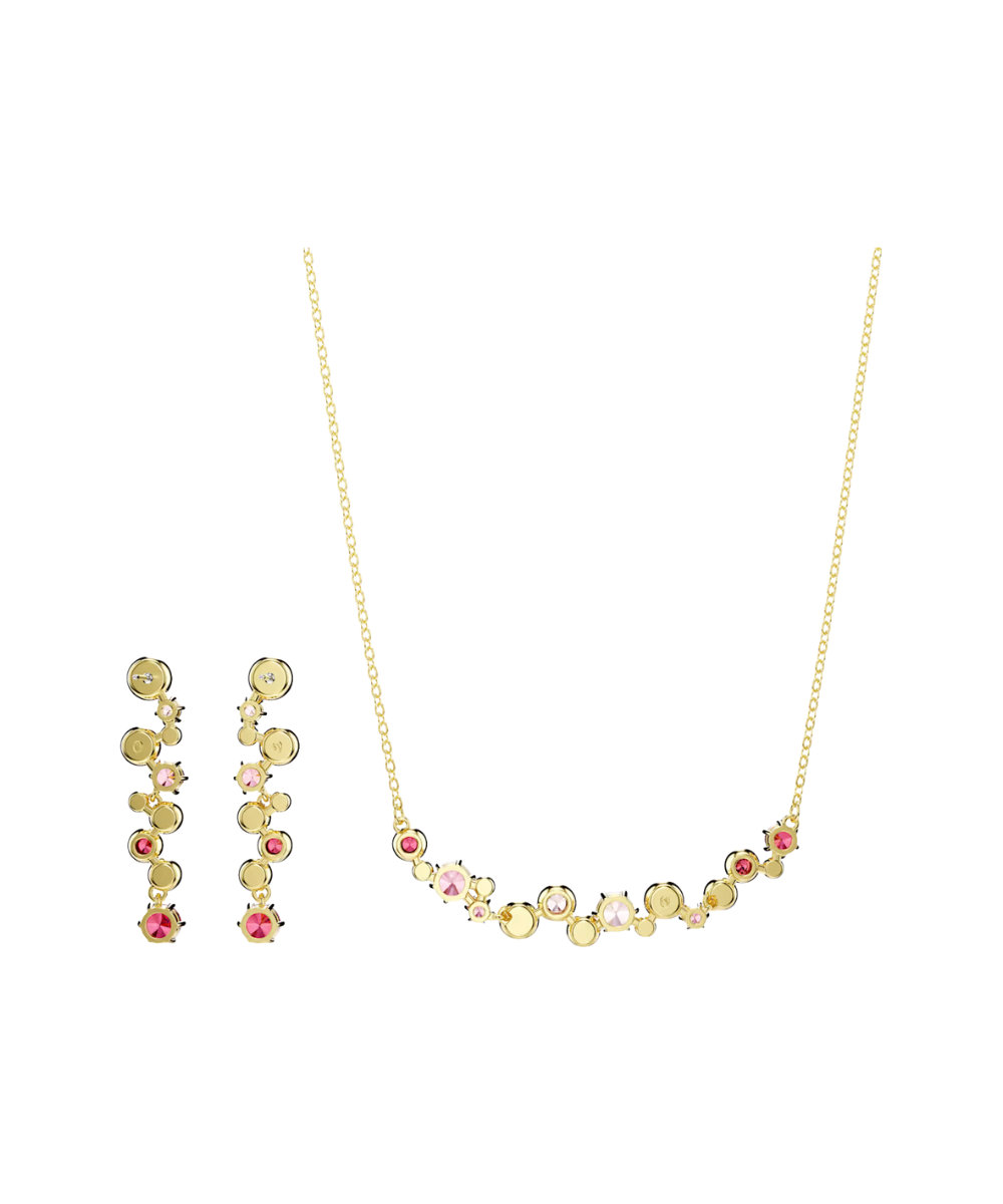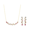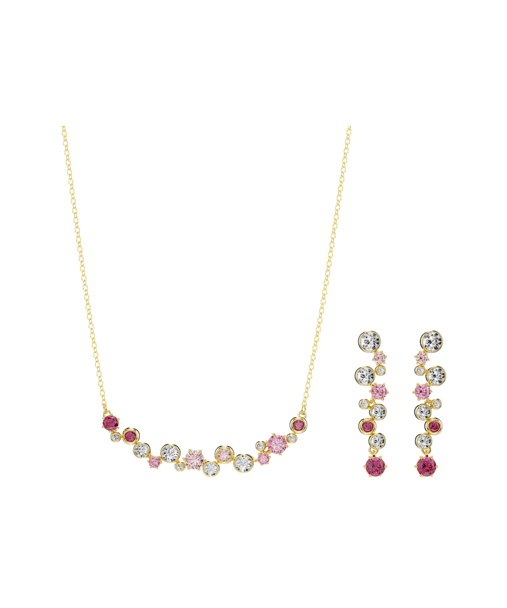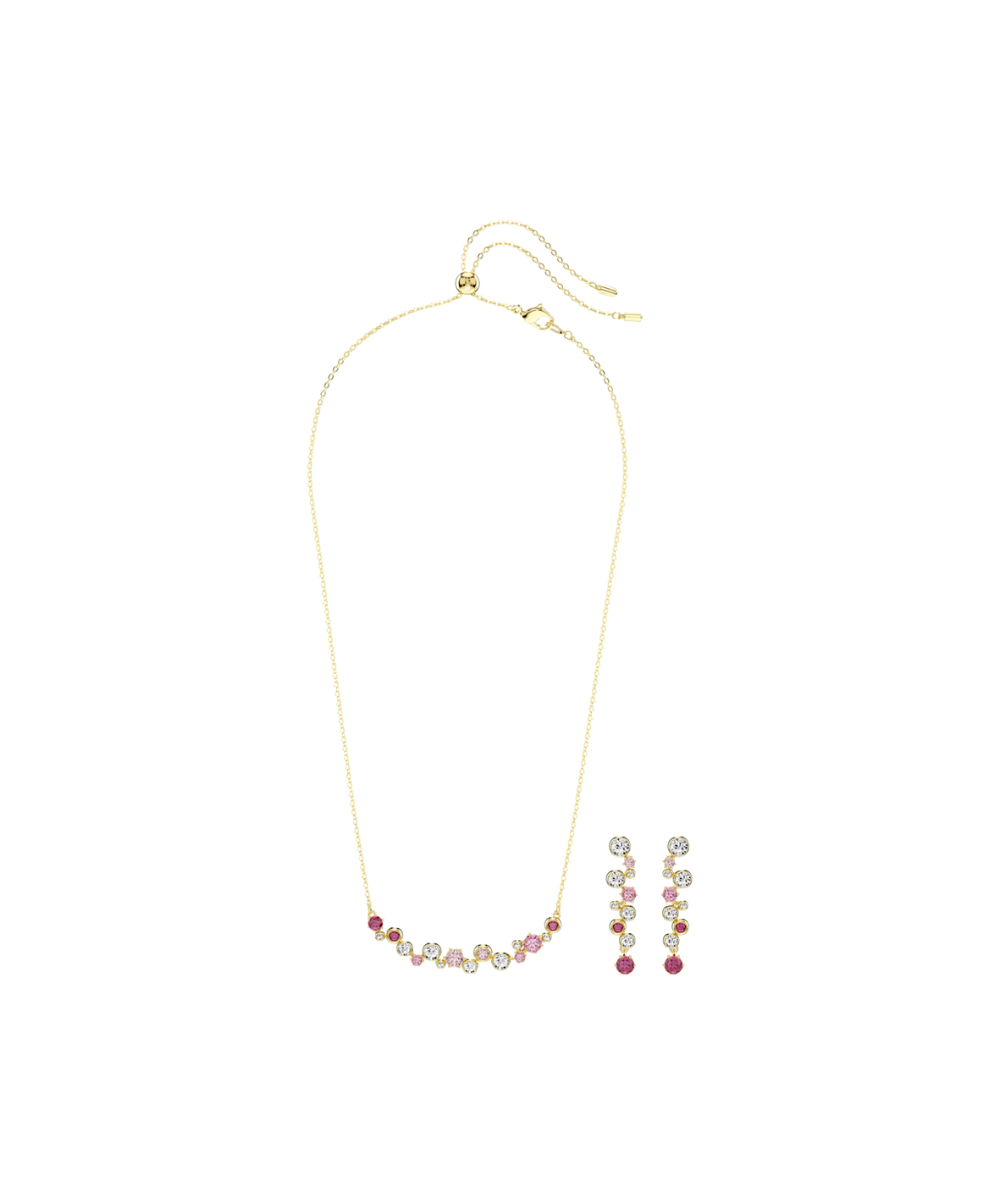 This gold-tone plated Constella set is crafted with joyful color in mind. Combining a necklace and pair of earrings, each piece is adorned with clear crystals and pink and red Swarovski Zirconia in various sizes and shades, presented in a prong or bezel setting. The necklace also include a sliding adjustment for a versatile fit. It's a warm and vivid set to amplify any outfit.