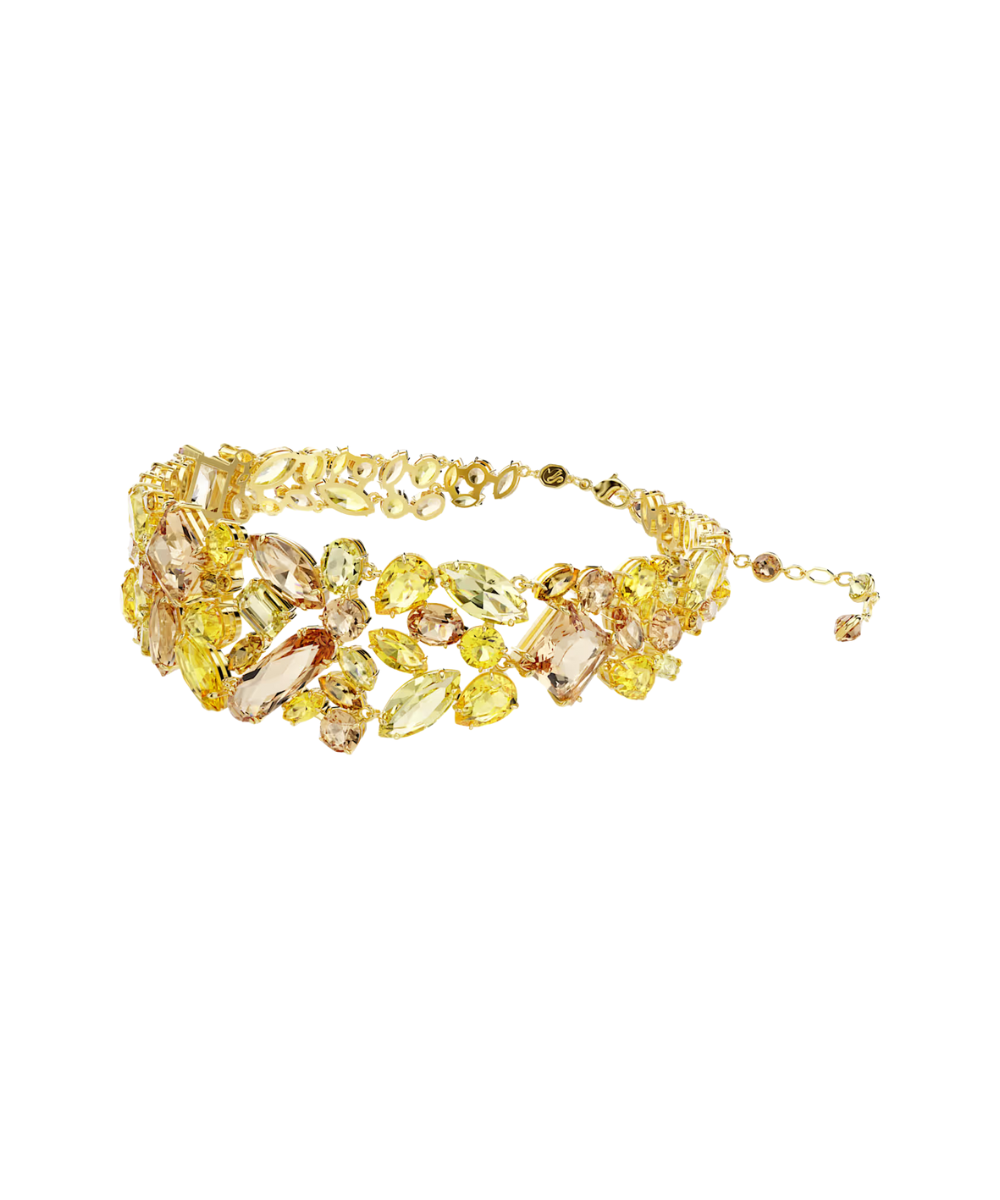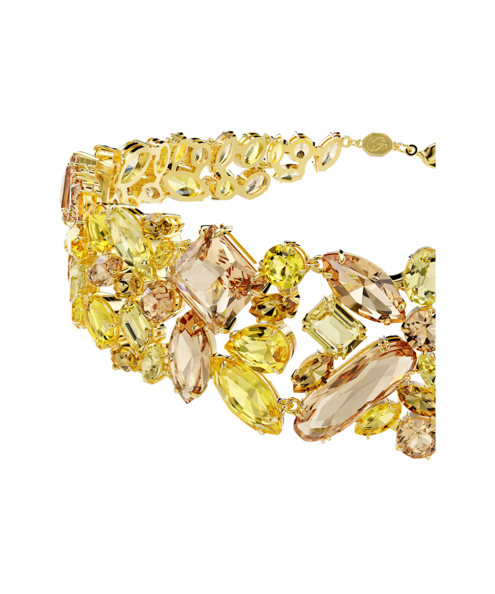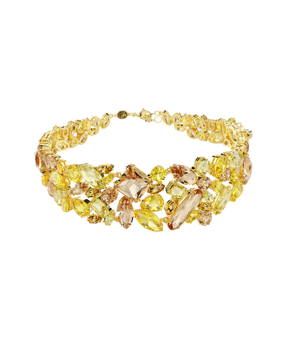 Illuminate the glamorous side of your style with this statement Gema choker. The head-turning design is gold-tone plated and features 99 different shapes of crystals in a radiant mix of yellow and amber tones. Arranged into one dynamic silhouette, this choker is emblematic of Gema’s unexpected formations and vibrant beauty, and glows even brighter when worn alongside matching jewelry pieces from the same family.