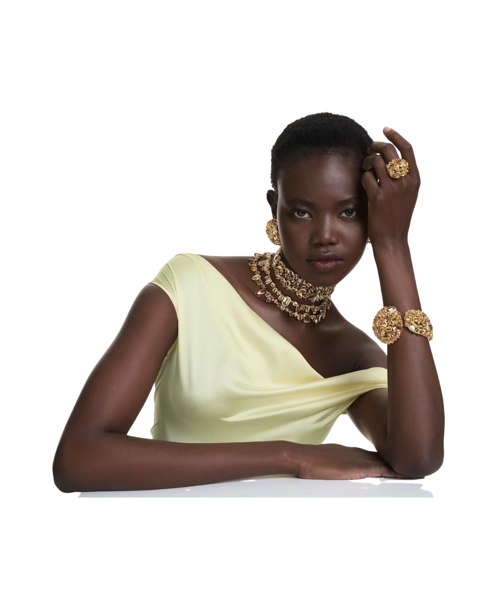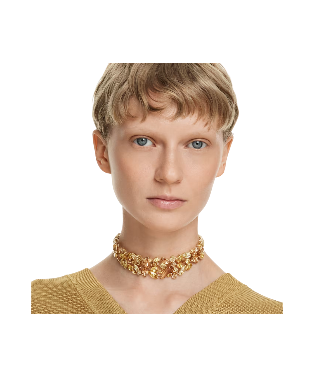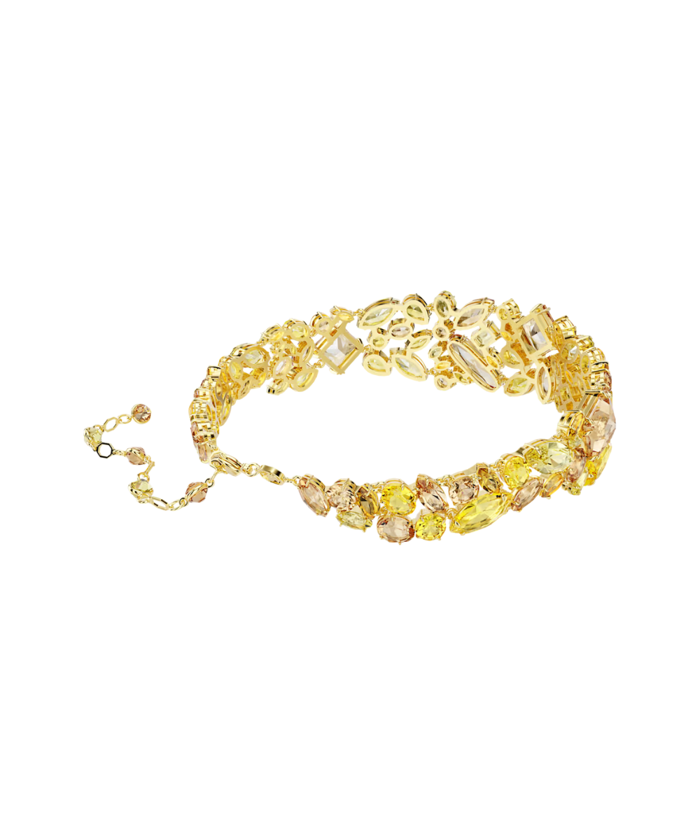 Illuminate the glamorous side of your style with this statement Gema choker. The head-turning design is gold-tone plated and features 99 different shapes of crystals in a radiant mix of yellow and amber tones. Arranged into one dynamic silhouette, this choker is emblematic of Gema’s unexpected formations and vibrant beauty, and glows even brighter when worn alongside matching jewelry pieces from the same family.