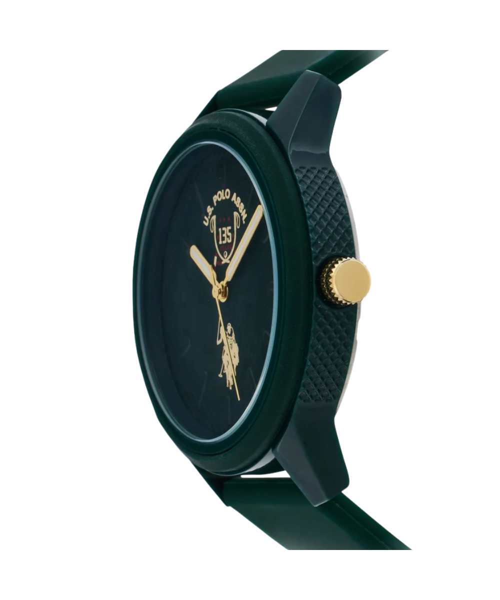 Celebrate timeless elegance with this US Polo Assn men's watch, commemorating 135 years of heritage and style. Featuring a sophisticated 40mm quartz movement housed in durable plastic with a mineral glass face, this timepiece combines classic design with everyday practicality. The comfortable silicone bracelet ensures all-day wearability, while 3 ATM water resistance protects against splashes and brief immersion. A refined accessory that captures the essence of American sporting tradition.