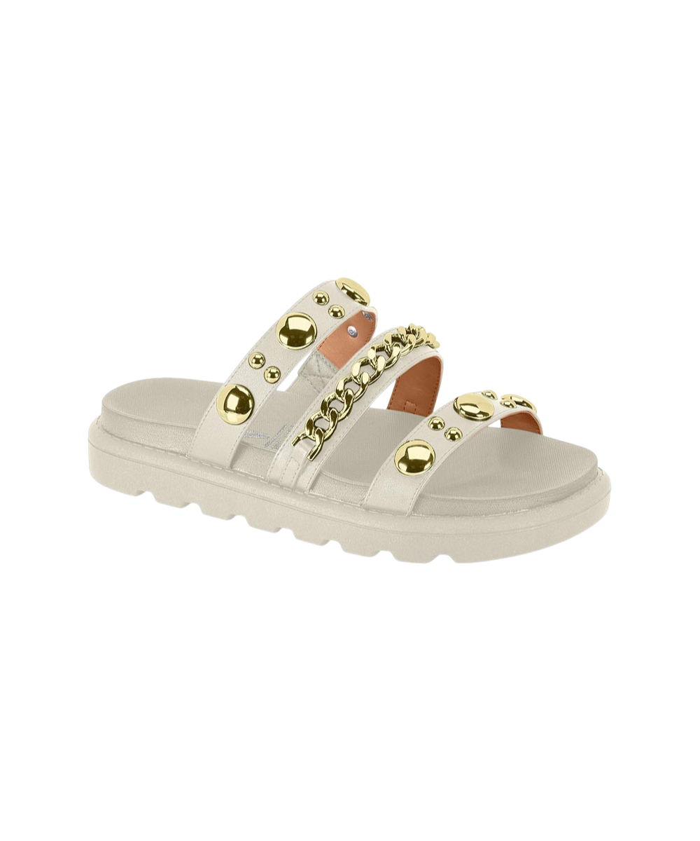 Bold and stylish, this Vizzano slide sandal combines statement details with everyday comfort. Designed with multiple straps featuring striking gold-tone studs and a decorative chain accent, it adds a fashion-forward edge to any outfit. Set on a lightweight platform sole with a cushioned footbed, it offers enhanced support and comfort for all-day wear. The open, slip-on design ensures convenience while maintaining a confident and modern silhouette.