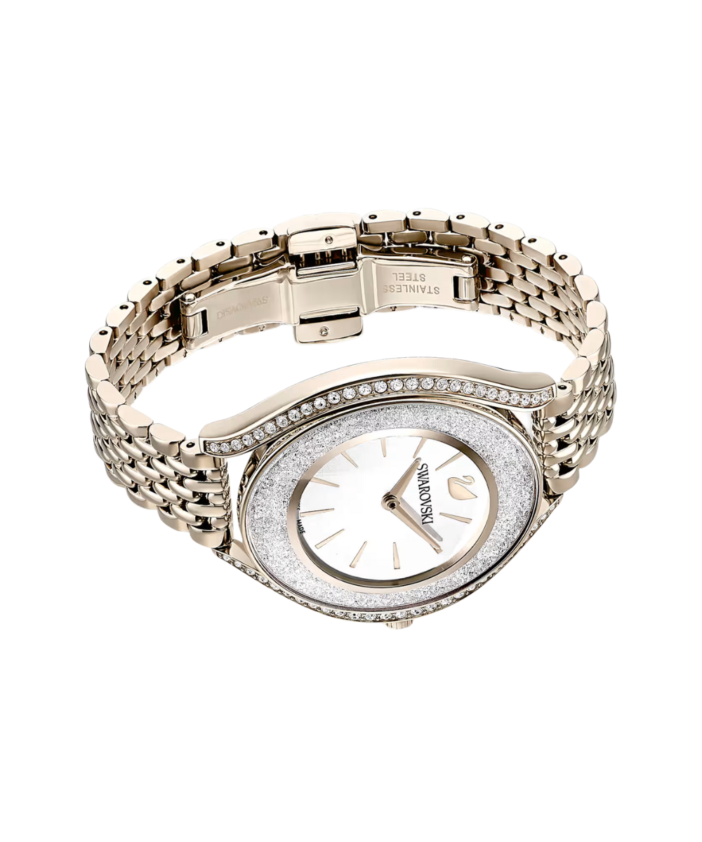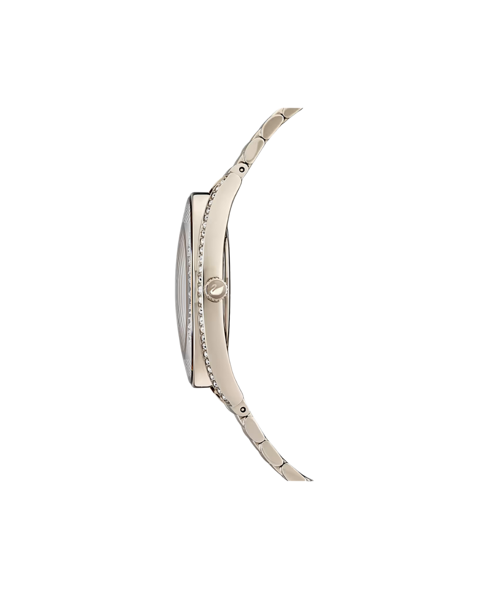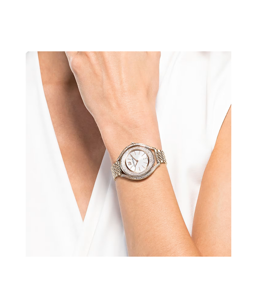 Eminently elegant: This Swarovski watch from our Crystalline Collection artfully combines form and function. More than 1,300 crystals in the champagne-gold tone PVD case create a brilliant sparkling effect. A champagne-gold tone PVD bracelet and a white silver tone dial with the Swarovski swan at 12 o'clock complete the sophisticated design. This Swiss made watch is water resistant up to 50 m.