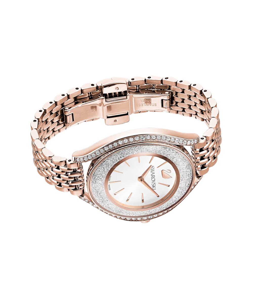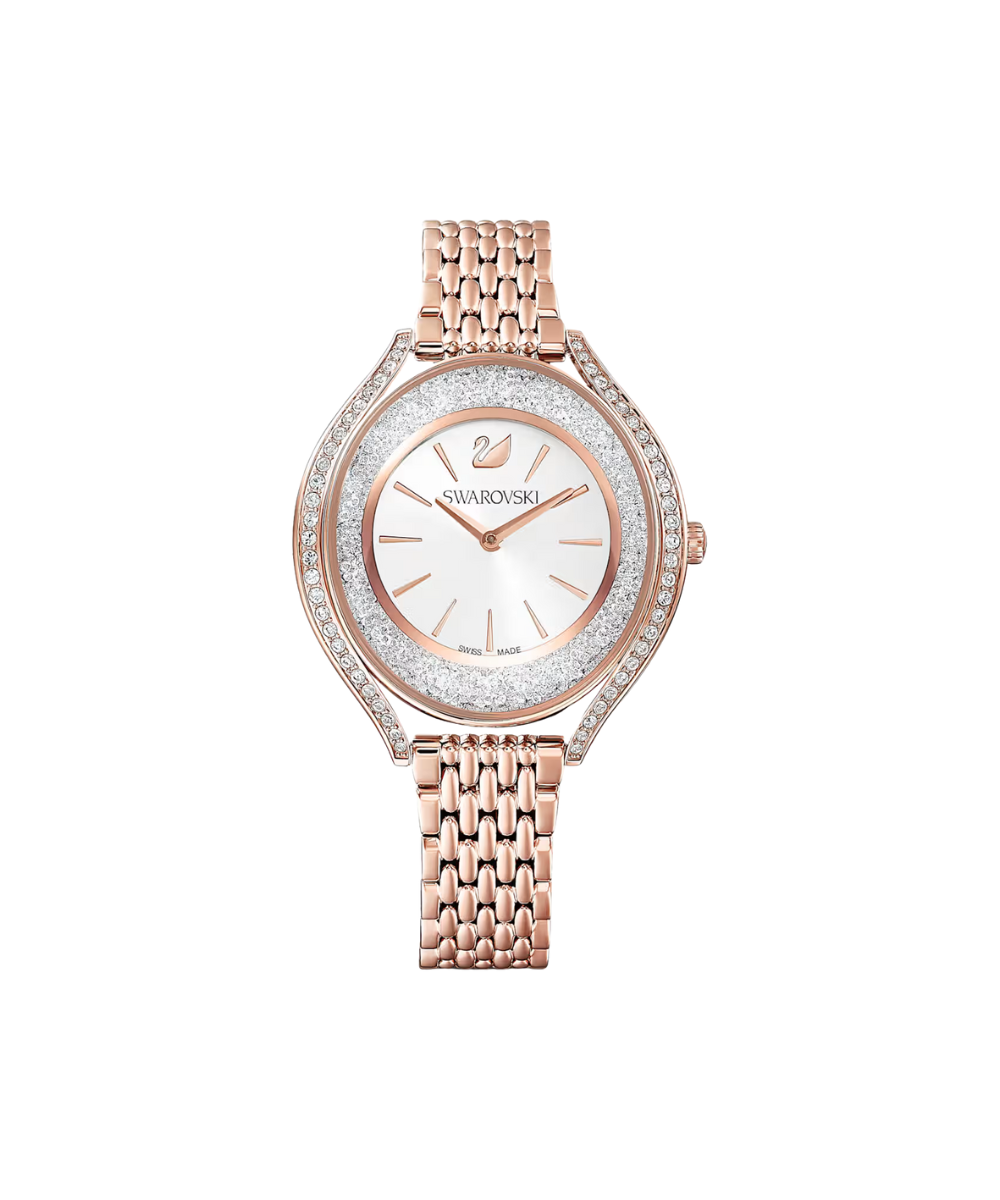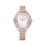 Eminently elegant: This Swarovski watch from our Crystalline Collection artfully combines form and function. More than 1,300 crystals in the rose-gold tone PVD case create a brilliant sparkling effect. A rose-gold tone PVD bracelet and a white silver tone dial with the Swarovski swan at 12 o'clock complete the sophisticated design. This Swiss made watch is water resistant up to 50 m.